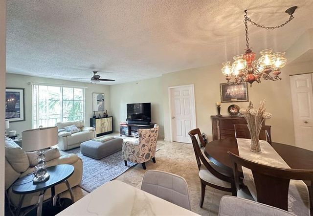 Beautifully furnished first-floor corner unit featuring 2 bedrooms and 2 bathrooms, with tile flooring throughout, impact windows and sliding door leading to a screened Florida room.
