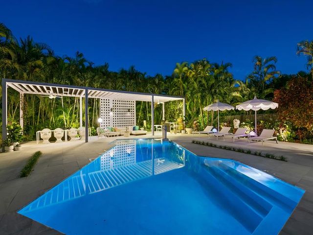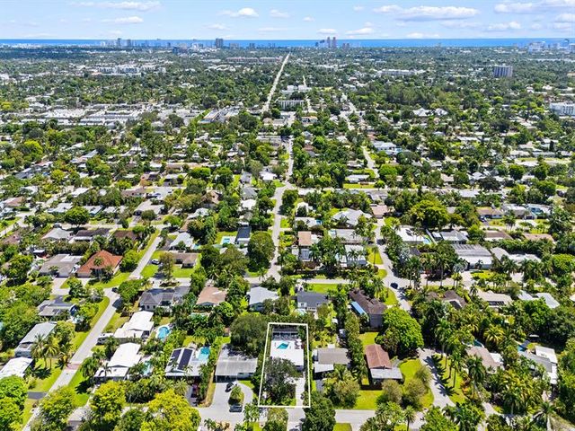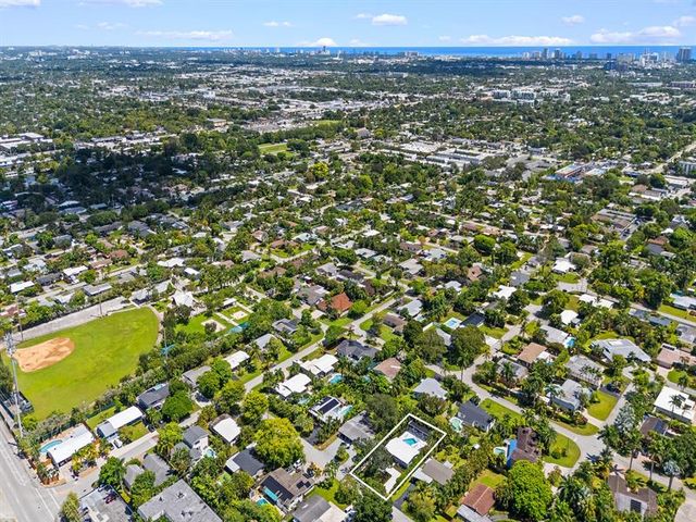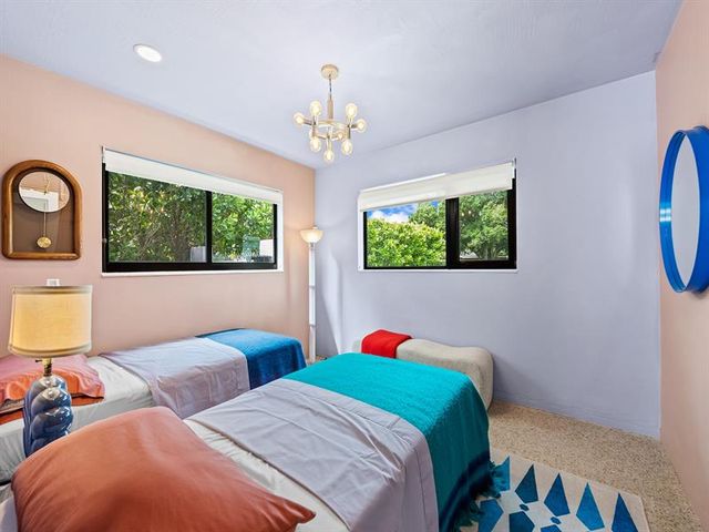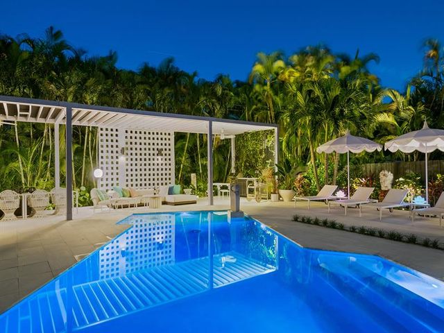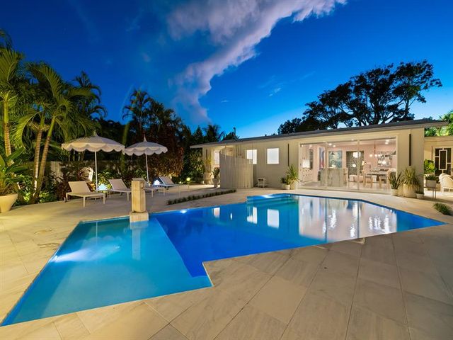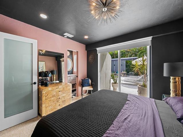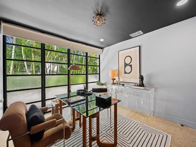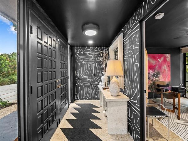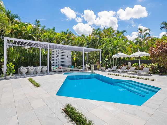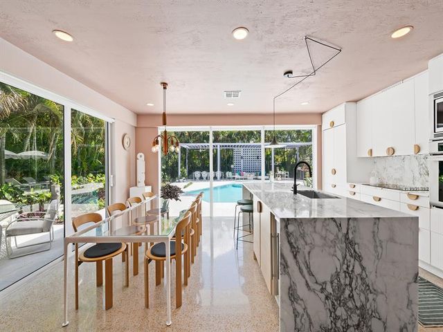 This designer-owned residence has been thoughtfully reimagined and meticulously renovated with both mid-century modern style and function in mind. The open concept living area has natural light from floor-to-ceiling windows with views of the expansive backyard and resort-style pool. You'll also find a bonus room for an office or den. Designer touches are everywhere, from terrazzo floors and porcelain-tiled baths to the kitchen featuring high-end appliances. Updates include all new electrical, PVC plumbing and hurricane protection. Set on a large lot, the private backyard is an entertainer's dream featuring a fully refurbished pool, honed Carrara marble pavers, an outdoor dining area, summer kitchen and dramatic evening lighting. Creative design, comfort and timeless appeal, it's all here.
