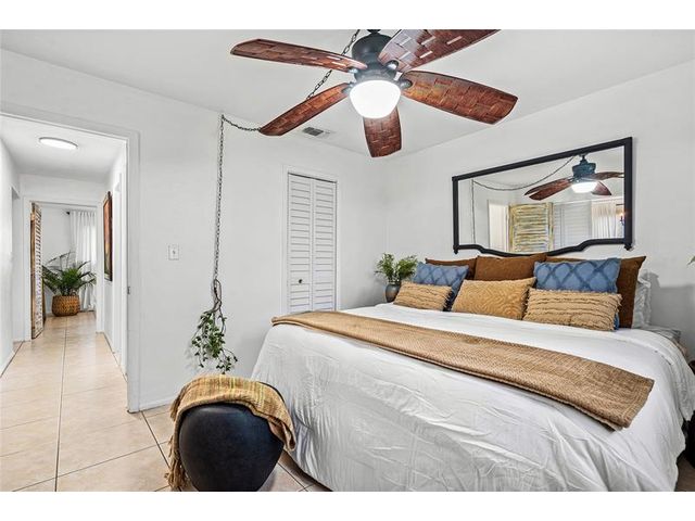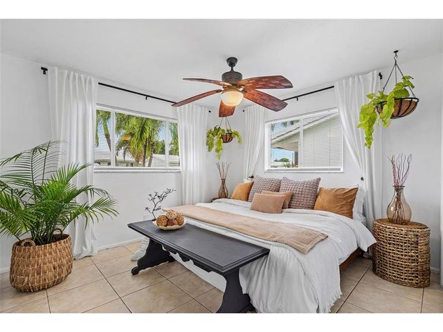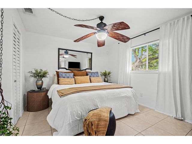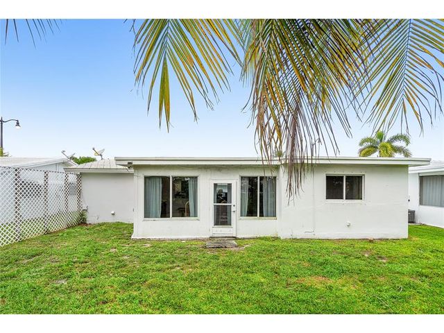 Stunning and airy two bedrooms. One bath-one car garage home. Backyard open to lots of greenery and one of the very few homes in this community without a house located behind property. Roof replaced in 2015. No land lease. Located in Leisureville just3 miles from the beach with easy access to shopping, dining,and I-95. Verfied 55+ community east of 95 featuring free golf, on a 9 hole par, 3 course. Maintenance fee includes exterior house painting, water, lawn card, and shuttle service. Two pools, two clubhouses, walking and biking trails. This is a well maintained pet friendly community. Please take note that this listing can have incorrections and it is important for agent/buyer to verify everything.