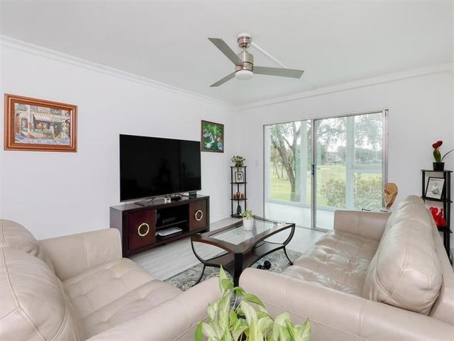 This fully renovated unit has captivating water vistas from its IMPACT glass-enclosed Florida Room, IMPACT WINDOWS & FRONT DOOR. Enjoy the spacious, open floor plan with abundant natural light. Open pass-thru and entryway. Quartz counters with Waterfall edge. SS Appliances, Custom Window Treatments. The bedrooms and bathrooms have been tastefully updated CUSTOM CLOSETS & DOORS. The master bathroom entry moved with barn doors. All SMOOTH CEILINGS with four ceiling fans. SHOWERS IN BOTH BATHROOMS (NO TUB), and the kitchen is a chef's dream. Master bedroom King-size bed. Large flat-screen TV in the living room. Enjoy the peaceful, serene Panoramic water views from the Golf Course Great location & very quiet. Condo is completely furnished and is Turnkey 55+Good income and credit required