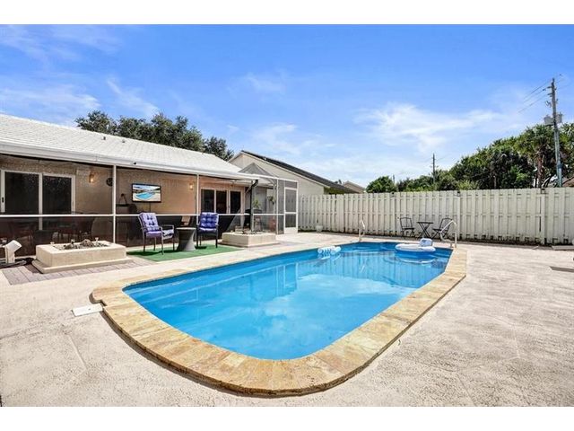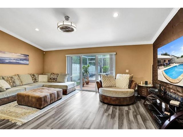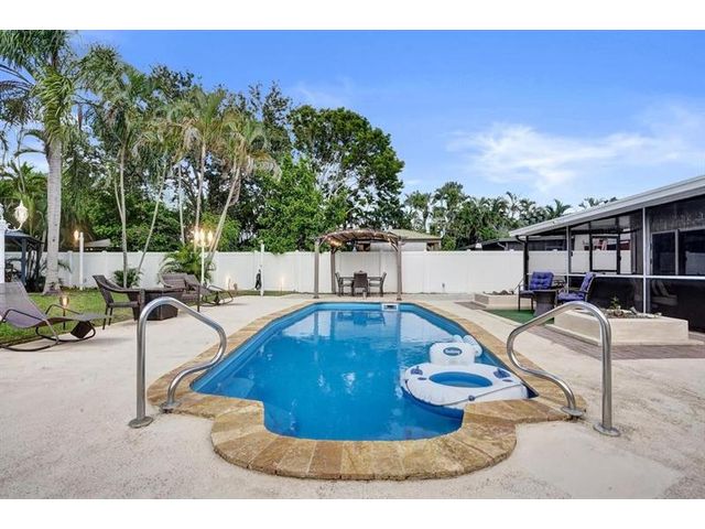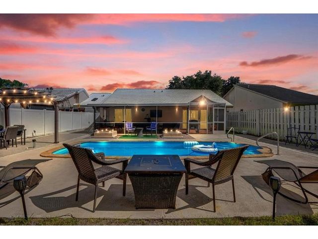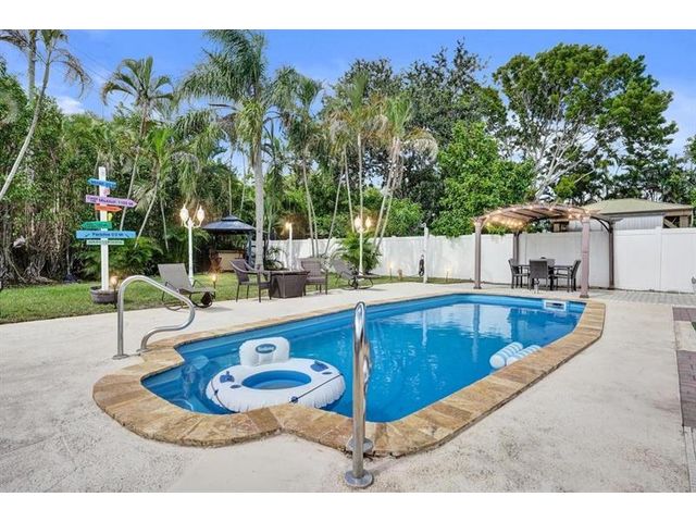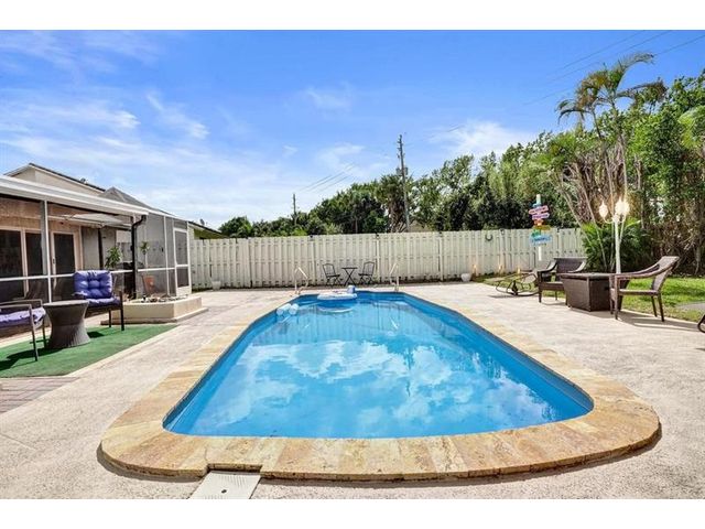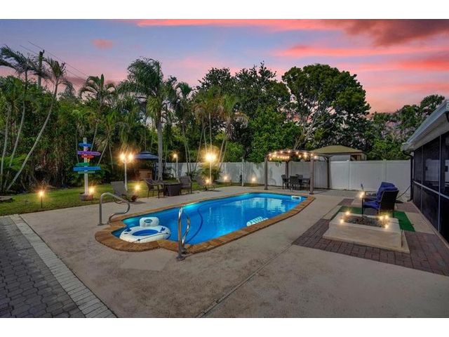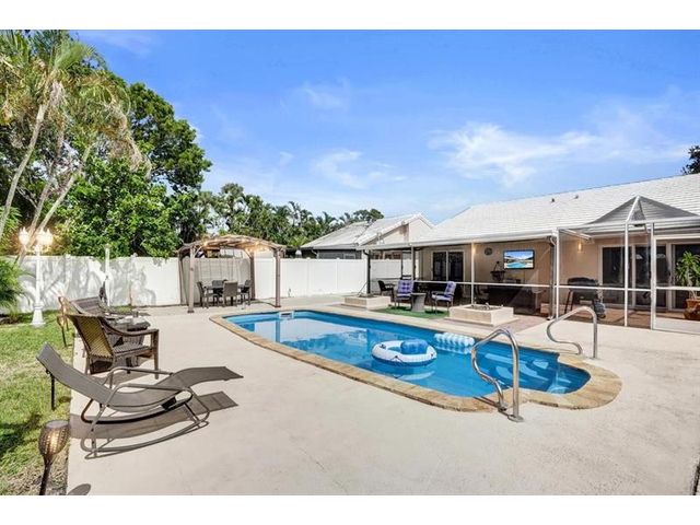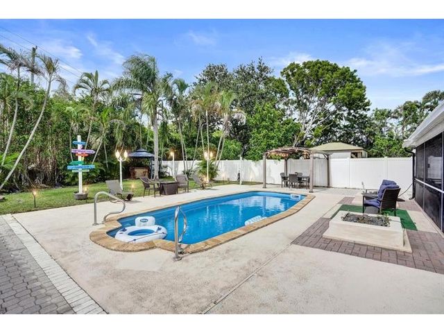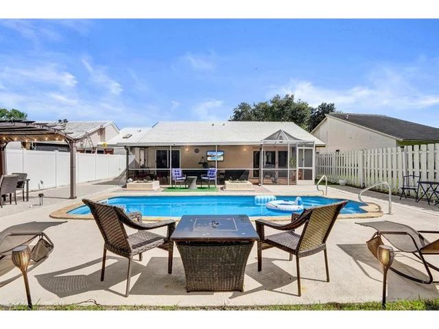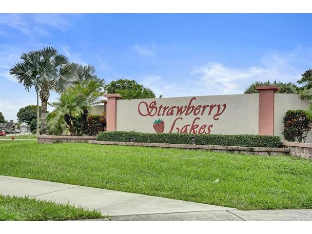 Welcome to your private paradise in Strawberry Lakes! This 3-bed, 2-bath, 2 car garage pool home is designed for entertaining. The backyard is the star, 1 of only 7 in the community with a sparkling pool, tiki hut, & plenty of space to host unforgettable gatherings. Enjoy a covered, screened patio, lush landscaping, & one of the largest lots in the neighborhood. Inside, you’ll find vaulted ceilings with crown molding, recessed lighting, luxury vinyl plank flooring, a modern kitchen & white granite counters, a skylight, & stainless appliances. All windows, doors & sliders are hurricane impact. The primary suite features a double door entrance, an upgraded bathroom with white and blue subway tile, a rain shower, & dual vanities. This home is move-in-ready, ready to host your first party!