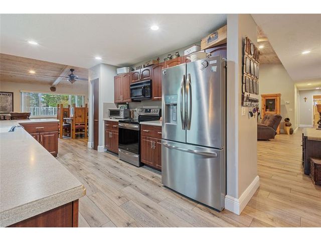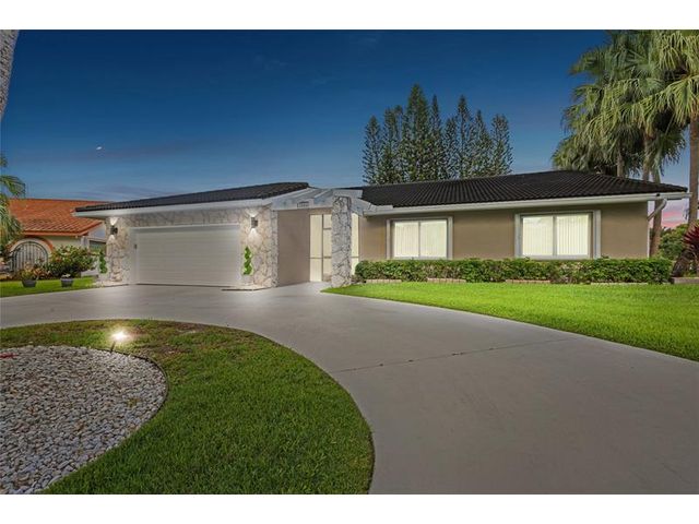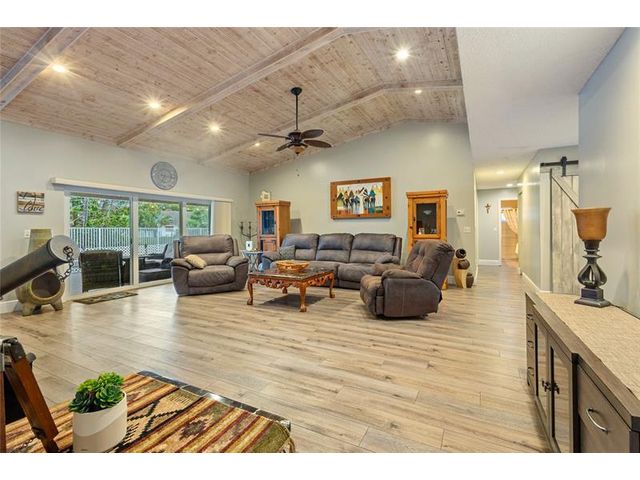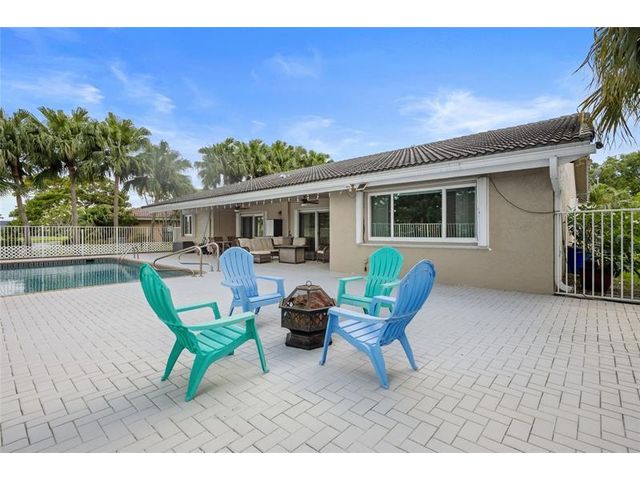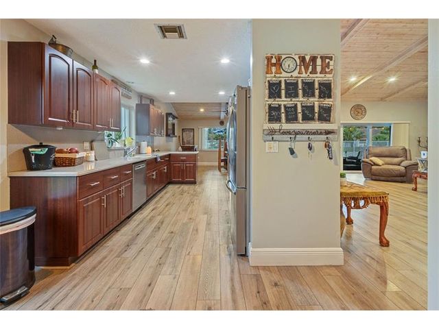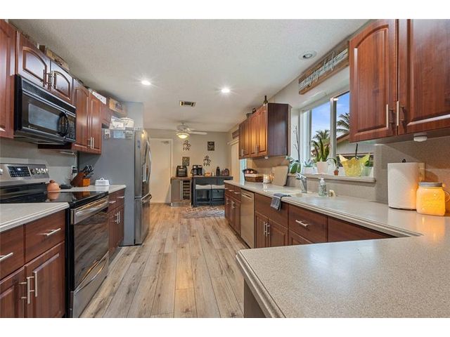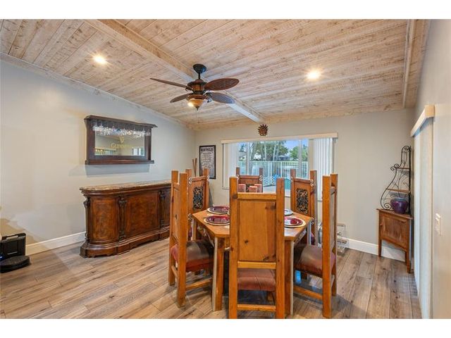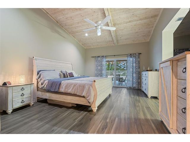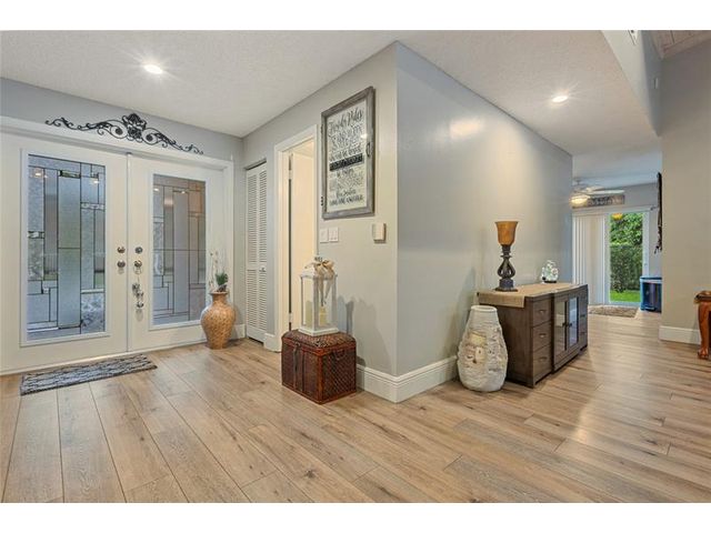 Beautifully updated home featuring new flooring and high-end wood vaulted ceilings. Impact windows and doors, updated baseboards, and energy-efficient LED lighting throughout. Spacious master suite overlooks the pool and includes a luxurious bath with bidet. Kitchen offers ample space with wood cabinets. Updated half bath, very cold and efficient A/C, home vacuum. Enjoy stunning water views from the large backyard—perfect for entertaining. Accordion shutters , impact windows, offering storm protection and modern appeal, low HOA—move-in ready and built for comfort!- Seller may consider buyer concessions if made in an offer.