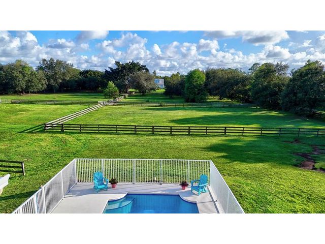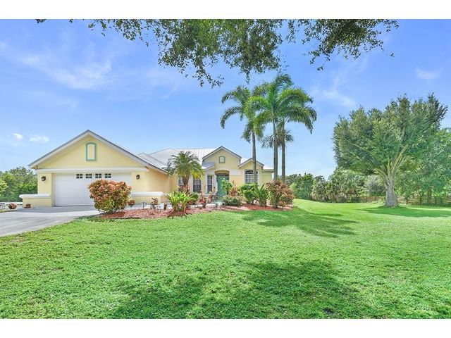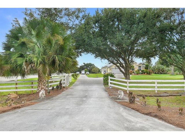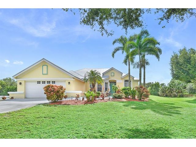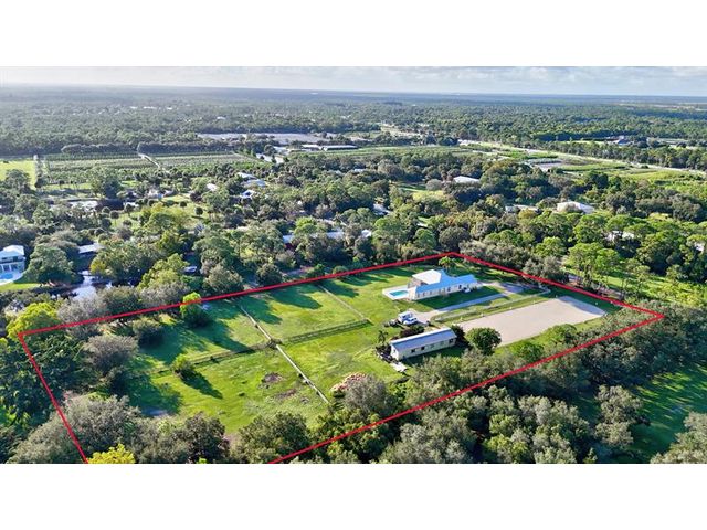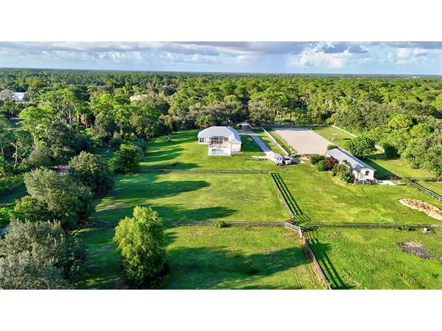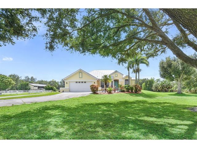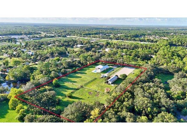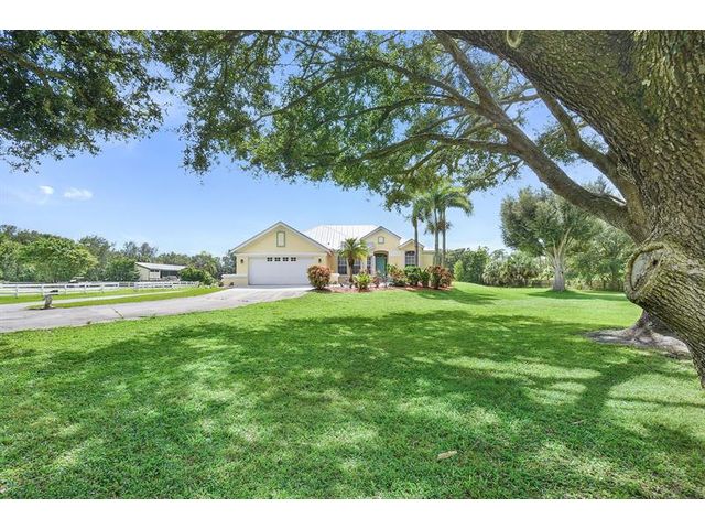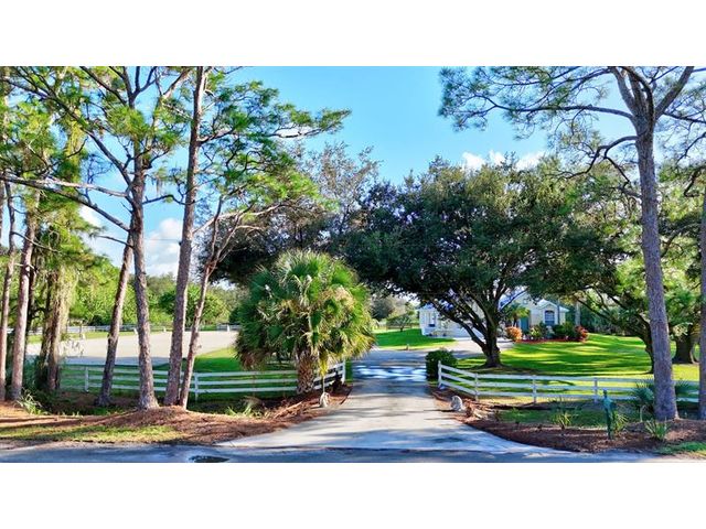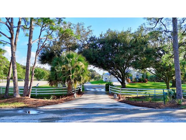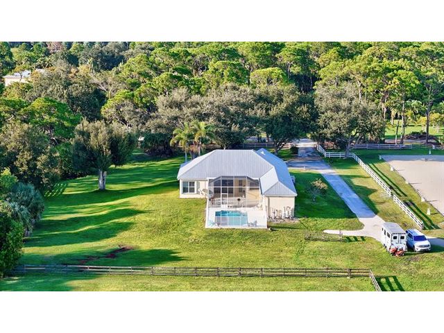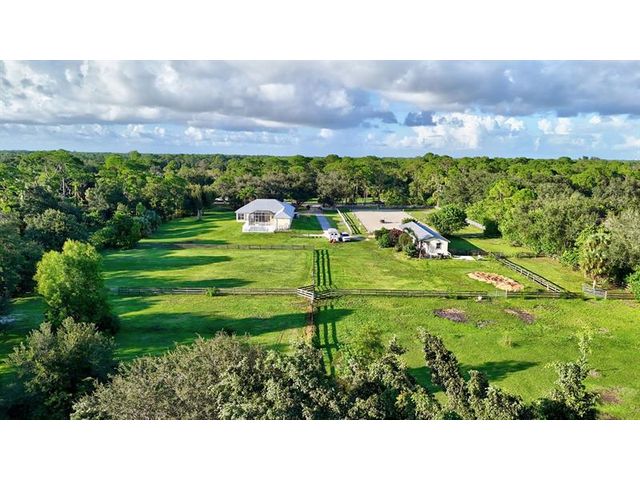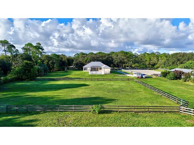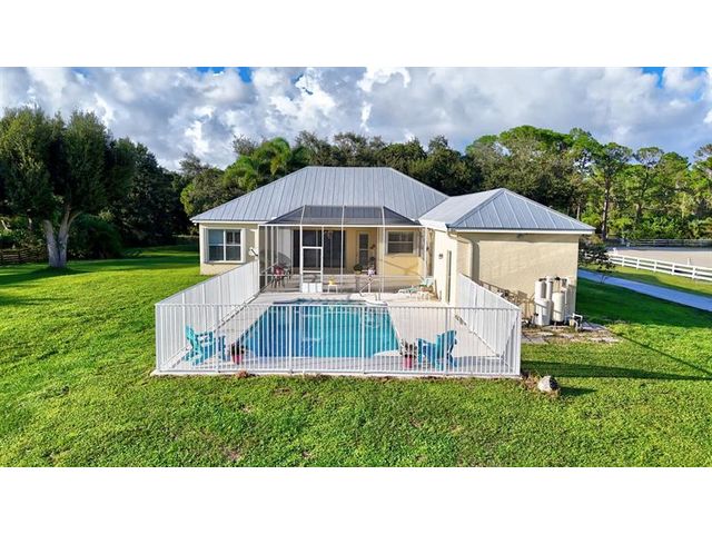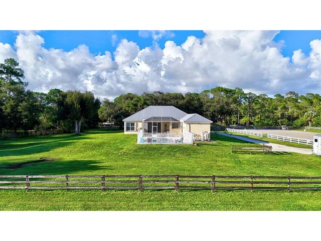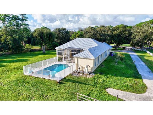 A remarkable find. Bring your dogs, cats, farm animals and horses. Don't forget get your kids. Plenty of room inside and out with 4 bedrooms, 3 baths and an extra bonus room or office. Entertain in the formal living room with pocket sliders that open up to a screened porch and pool .Relax in the spacious family room. The primary suite has been remodeled and the master bath offers a relaxing feel. The home boosts vaulted ceilings and 8 ft doors. The 5 acre property has a small 5 stall barn with tack/feed room and a riding area that has the best footing in Palm city and is fully fenced. The ring was put in by IDA Development. Let your animals enjoy 3 large grass paddocks and 2 small ones. Home is located on a dead end. Close to everything. A country feel without being far from anything