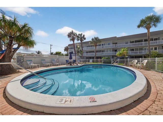 Wonderful bright 1/1 -bedroom condo with a gorgeous view of the water and garden from the screened balcony and kitchen. In a well-maintained 55+ community with heated pool, shuffleboard, barbeque, and large community room including billiard table and kitchen. This community has their 40/50-year recertification in 2019 and a recent reserve study. Located just steps from the beach, great dining and shopping, this unit is waiting for your personal touches. New AC in 2022, Newer hot Water Heater and Fridge. There is plenty of guest parking. No pets or smoking. Rentals are allowed after the 1st year of ownership for a minimum lease of 1 year. North Hampton Court is about a mile from the ocean and is close to shops and restaurants.