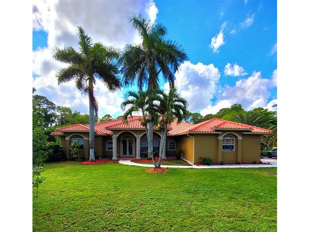 Tucked away on a peaceful and spacious 1.2 acre lot, this beautiful custom home offers the perfect balance of luxury, comfort, and refined Florida living. This expansive home spreads out just under 3,300 square feet under air, but the palatial pad extends to 4,700 sq. ft. plus, including the back patio under the roof and a converted garage. This carefully designed single story layout features a Primary bedroom, including walk-in closets and ensuite spa bathroom. The split floor plan allows 2 more large bedrooms with walk-in closets and a guest bedroom/office. French doors greet you from every entrance, front and back, where you are welcomed by the bright, open interior, extra volume ceilings and natural light flowing throughout the entire home. R.V. hookup and sheds. Horses allowed.