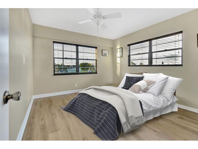 Unique 3rd Floor Corner Oasis, that is meticulously maintained & turn-key ready. Enjoy breathtaking dual lake views (front/back), creating a serene, resort-like ambiance at twilight. This bright open-concept home features a modern kitchen, tile floors, knockdown ceilings, & Hunter Venetian blinds. The primary suite boasts new vinyl plank flooring; guest room offers plush carpet & a large walk-in closet. The 17-ft rock-pattern tiled terrace extends your living space. The unit includes a high-end Himolla Siegfried white leather sofa w/ a large plexiglass image over the couch resembling dual open windows looking onto a serene lake w/ a sailboat, which ties in to this condo's setting. Steps from pool & designated parking spot. Can rent immediately, WOW! This unit is special & won't last long!