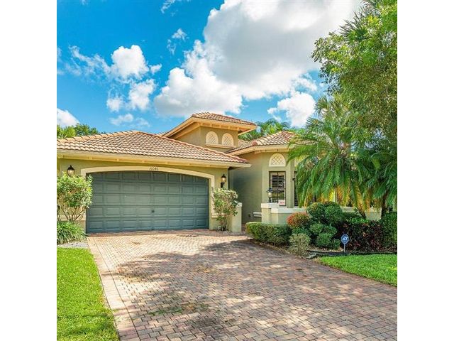 Gorgeous Mediterranean style home situated on oversize premium lot with lush landscaping with private cul-de-sac location. This meticulously maintained home features an open floor plan with dramatic soaring ceilings, crown molding. decorative woodwork throughout & plantation shutters. The gourmet kitchen with 42'' custom cabinetry, stainless steel appliances and granite countertops with a breakfast nook overlook the beautiful private paver patio and tropical landscaping. The spacious primary suite offers two large walk-in closets and the luxurious bathroom features a relaxing soaking tub, dual vanities and a grand spa like shower. Newer A/C with Nest thermostat. Instant hot water to all sinks and showers. Garage is functional with work benches and folding stairs to attic.