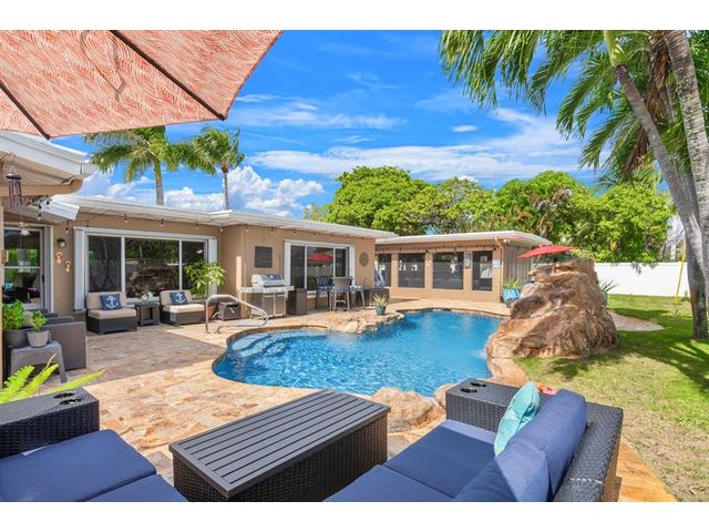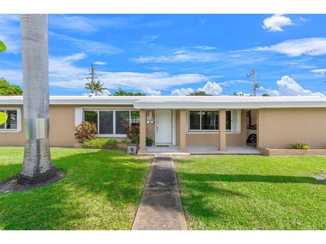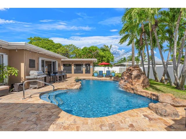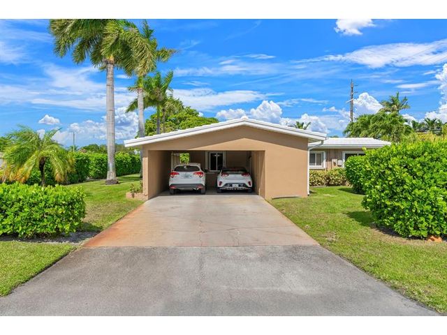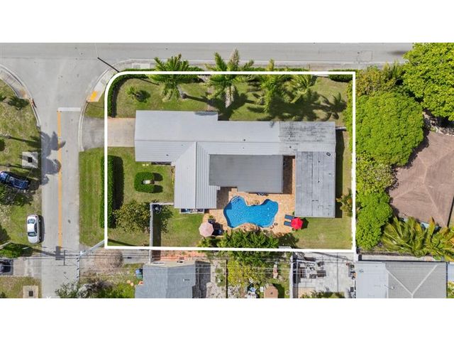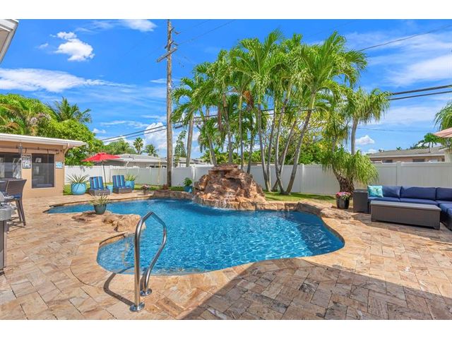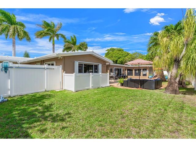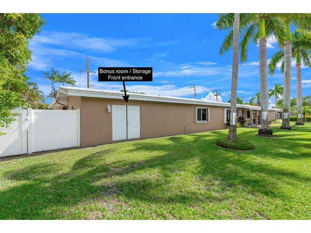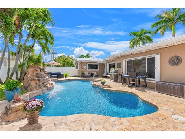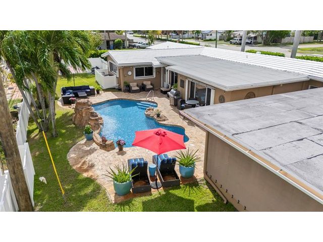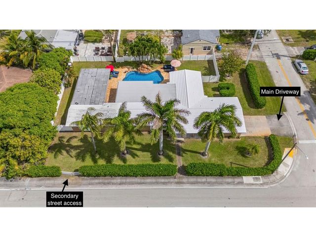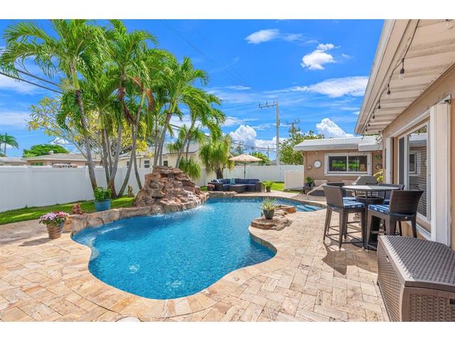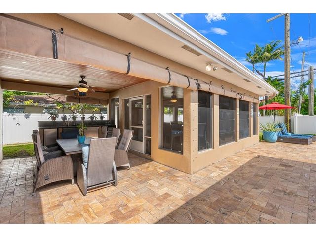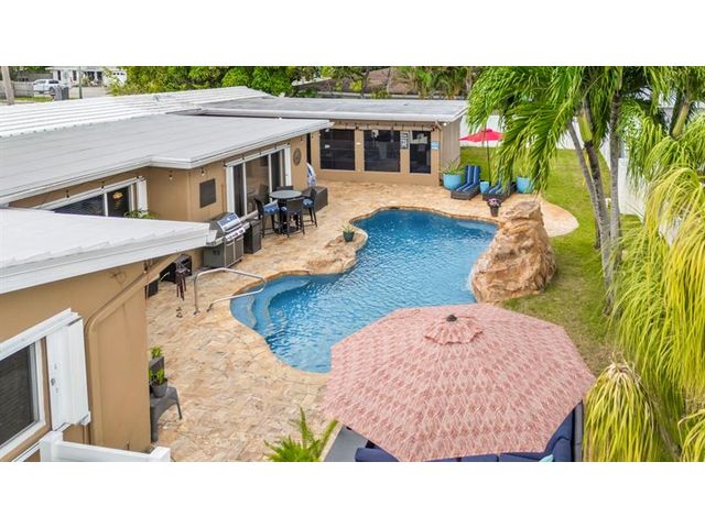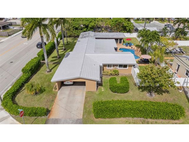Spectacular corner lot with access from NE 48th Street (not Andrews Ave as address indicates). Situated on a 13,000 SF double lot, this home features an expansive yard, resort-style heated/chilled saltwater pool w/waterfall. Interior is approximately 2,000 SF of living space with split bedroom plan with 3 bedrooms and 2 full baths plus a third cabana bath. Additional bonus room currently used as storage. Additional features include LVT flooring throughout, newer windows, and accordion shutters. Open layout with views of the yard and pool. Oversized screened pavilion (14x19) and covered dining, all equipped with KEVLAR HURRICANE FABRIC for full protection. NEW ROOF (2025). Whole-house GENERATOR (2024). HVAC (2024). Double CARPORT w/HURRICANE fabric. Transferable termite program &much more.