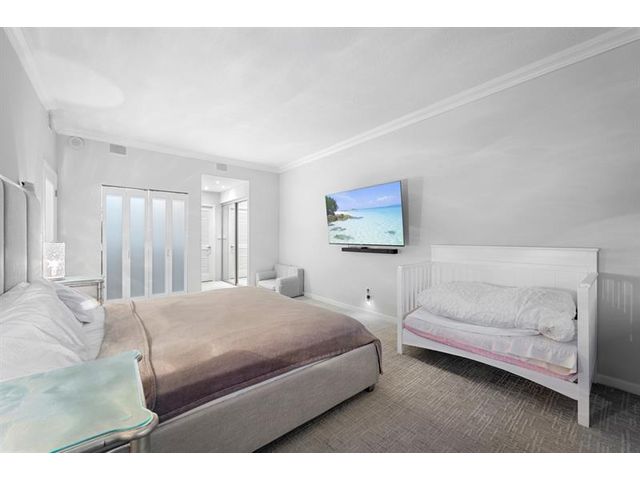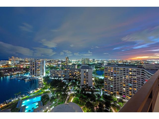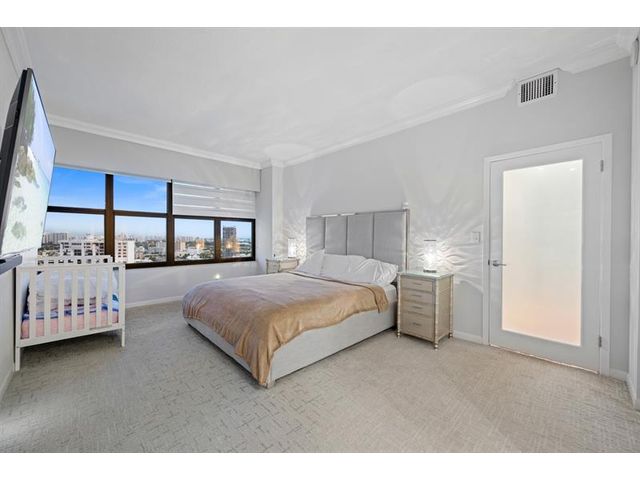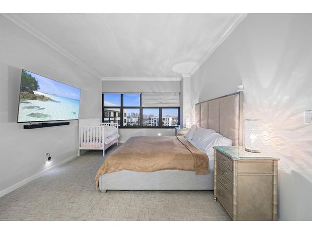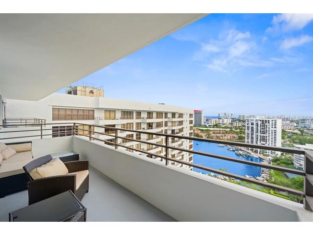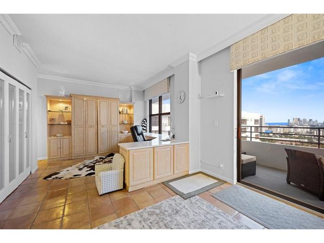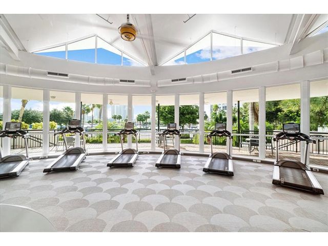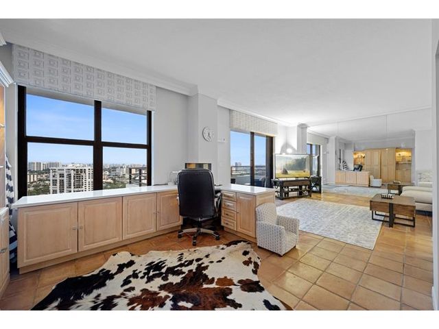 This top-floor condo boasts high ceilings and breathtaking views from the balcony. With glass doors throughout, it features a spacious living and dining area, plenty of closet space including a walk-in, and a well-designed kitchen with stainless steel appliances. Tile flooring runs throughout, except in the bedroom. The second bedroom is currently set up as an office and includes a Murphy bed. Furnished options available for an additional fee. The electrical panel and water heater were updated in 2021, and hurricane shutters are installed on the balcony doors. A covered parking spot is assigned to the condo. The Olympus community offers valet parking, a resort-style pool, and a modern fitness center. The beach is just minutes away, with plenty of restaurants and shopping centers nearby.