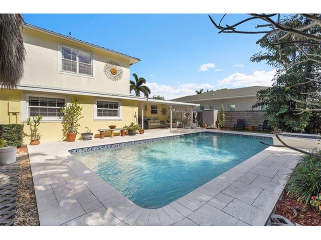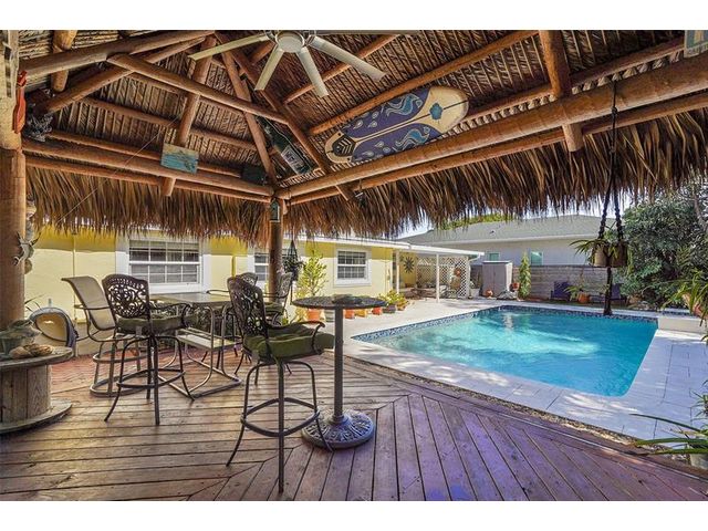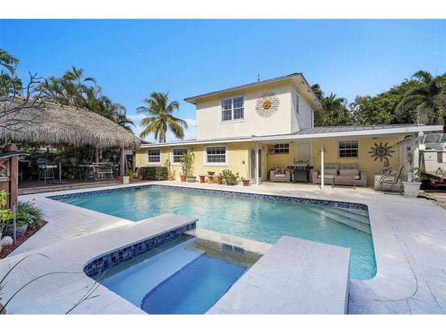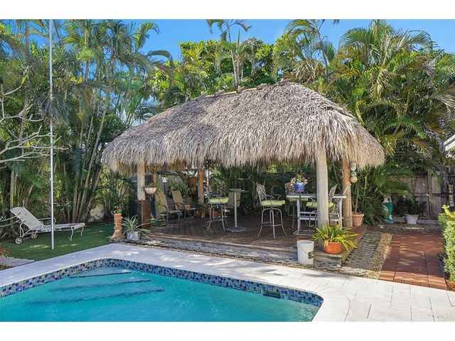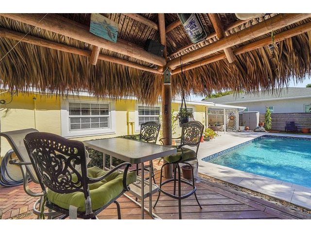 Live the dream in this Key West style home located just minutes from beautiful Deerfield Beach! This home has it all Ride your bike to the beach, shopping and great restaurants, entertain your friends by your pool ,watch the games in your own Tiki hut while enjoying your own private oasis. This home features: metal roof (2007) 2 A/C units. Laundry room W/ full size front loader W/D, Work space garage, Updated kitchen and baths, private oversized primary room upstairs, cozy living space downstairs. fenced yard, side gate for boat storage (up to 28 foot limit), 3 storage sheds, cool water spa, salt water pool system, resurfaced with new decking in 2015, Hurricane panels, Impact French back door and Impact bathroom window all for peace of mind. This home is ready for you and easy to show.