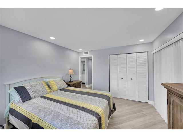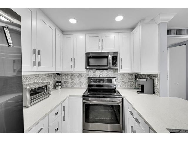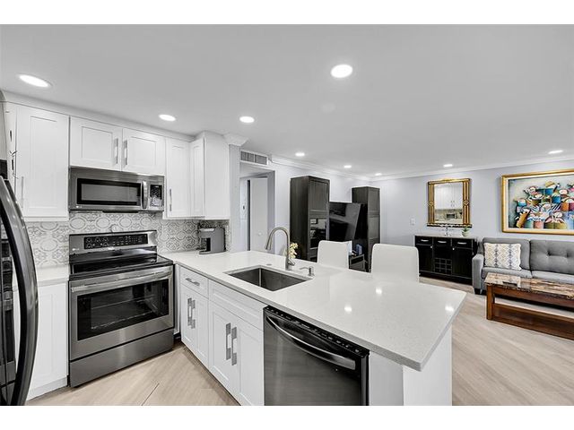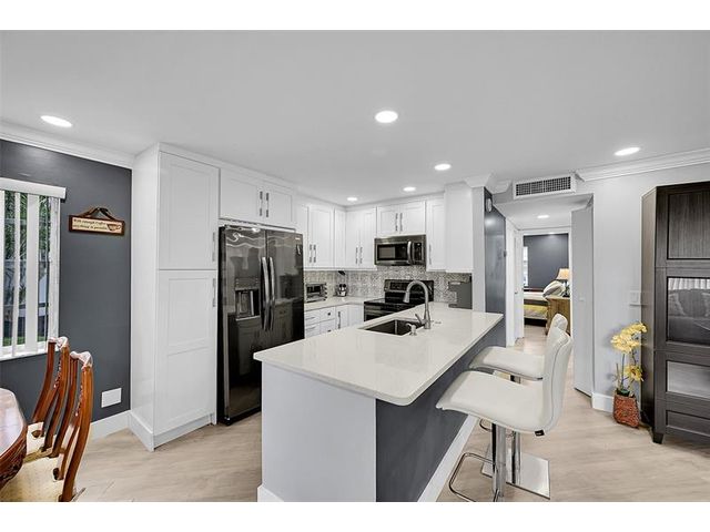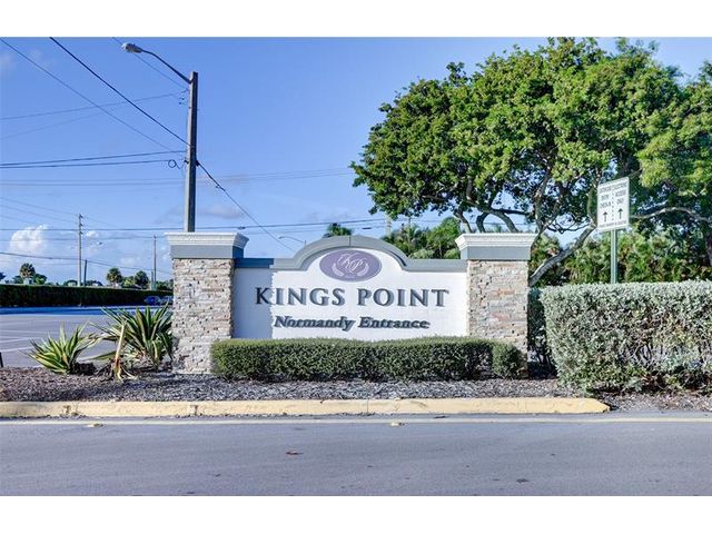 Beautifully renovated ground-floor 2BR/2BA condo with modern finishes throughout. Features include newer vinyl laminate flooring, LED high-hat lighting, and a fully updated kitchen with white shaker cabinets, quartz countertops, and new stainless-steel appliances. Both bathrooms have been completely updated. Enjoy a private screened porch with washer and dryer included. Incredible golf course views from the living area. Side entrance offers quick access to your assigned parking space. Kings Point offers true resort-style living with indoor/outdoor pools, theater, gym, bistro, café, two golf courses, courtesy buses and more. Perfect 55+ community lifestyle. This property is a must-see!