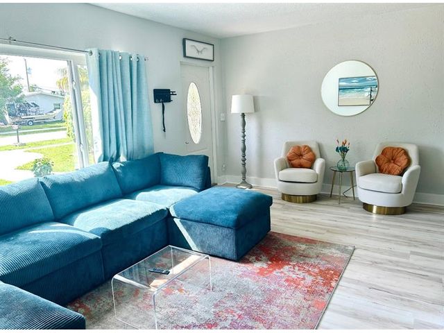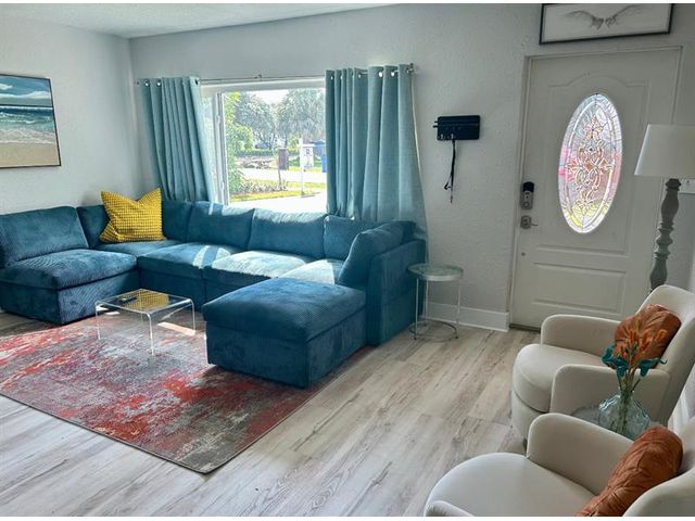 Charming, Fully Updated & Move-In Ready home featuring a modern open-concept floor plan & stylish upgrades throughout with an 2018 roof and impact windows! The heart of the home is the beautifully renovated kitchen with white shaker cabinets, granite countertops, stainless steel appliances, & a large center island perfect for entertaining. The gray & white color palette, complemented by durable luxury vinyl flooring throughout, creates a fresh and inviting vibe. A split-bedroom layout for added privacy, & an indoor laundry room that offers potential for a second bathroom. Step outside to a spacious, fully fenced backyard with a brand-new fence, plenty of room to build your dream pool or create the ultimate outdoor oasis with new sprinkler system.