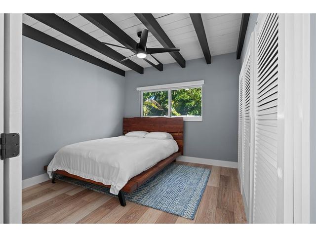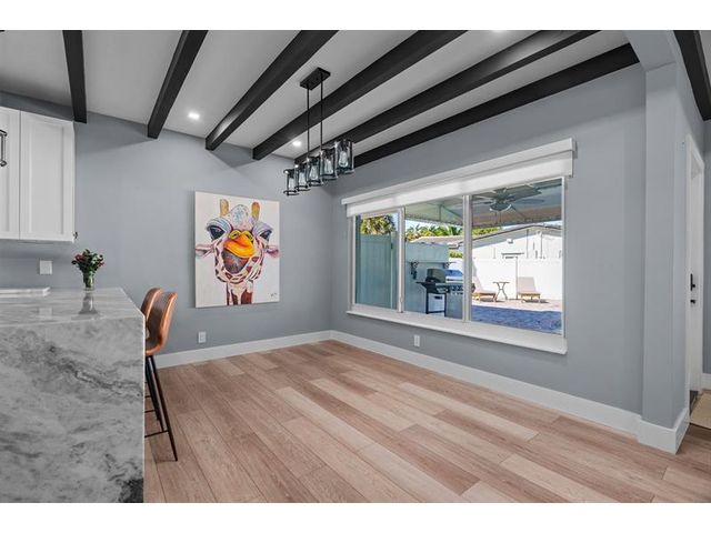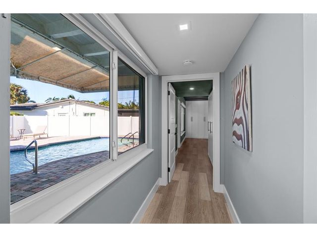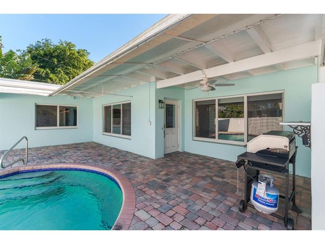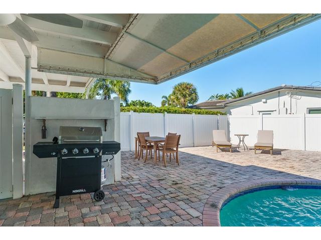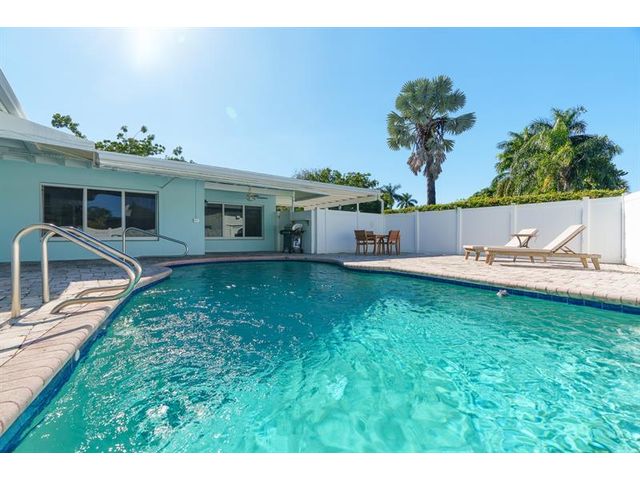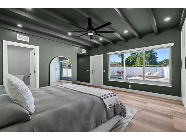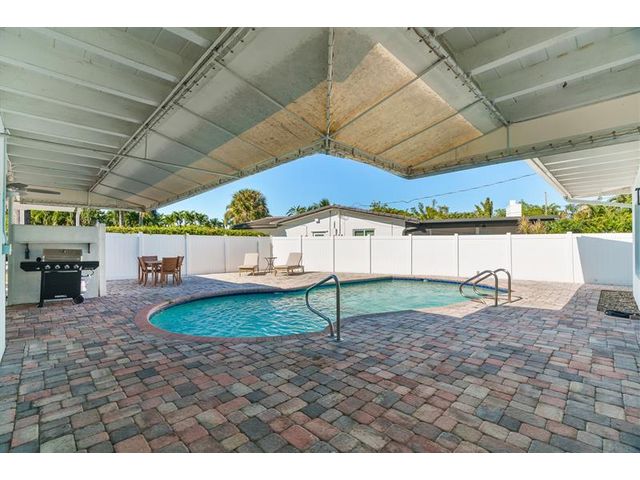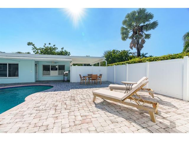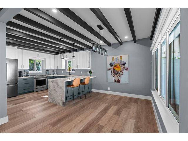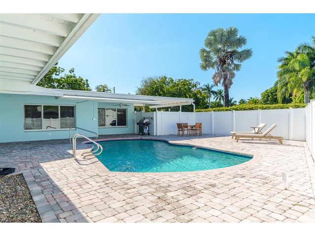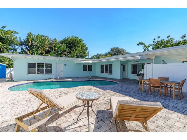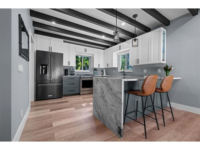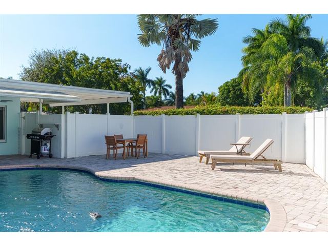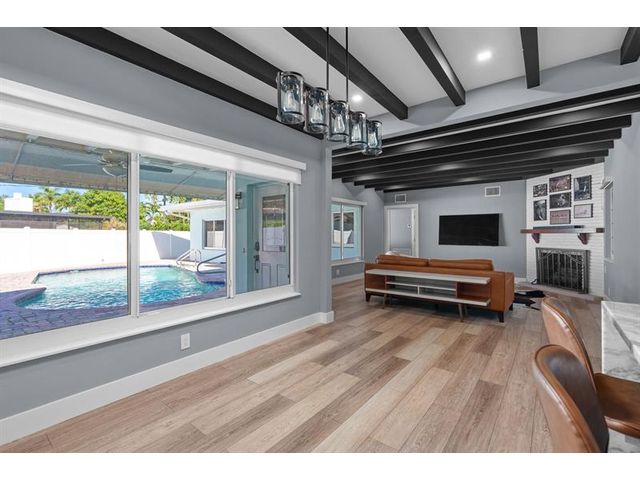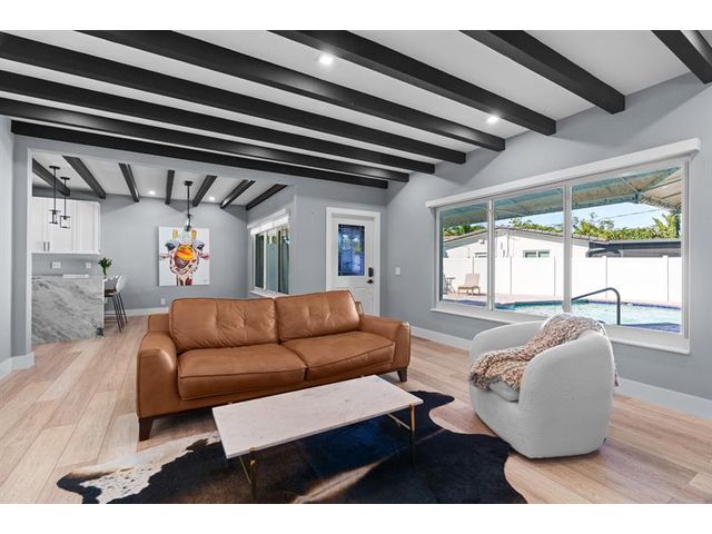 Beautifully updated and full of character, this Wilton Manors corner-lot pool home offers 3 bedrooms, 2 baths, and a warm modern aesthetic. The open living, dining, and kitchen areas are tied together with wood flooring and striking exposed beams. The designer kitchen features quartzite counters, custom cabinetry, soft-close drawers, and under-cabinet lighting. The spacious primary suite easily accommodates a king bed and includes a custom closet system and a spa-like bath with marble floors, a trough sink with dual faucets, and a rainfall shower. Additional perks include a tankless water heater and gas-powered dryer and cooktop. Outside, the property has a fenced in pool and patio and extra side yard that is framed by mature tropical fruit trees including mango, and avocado.