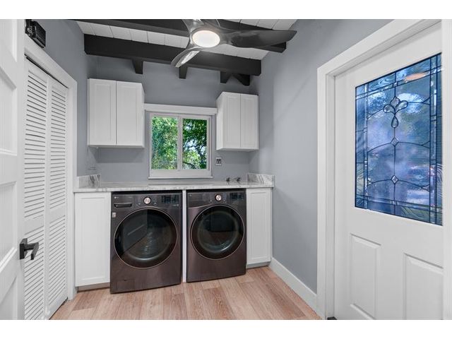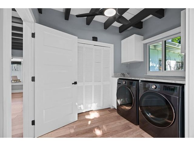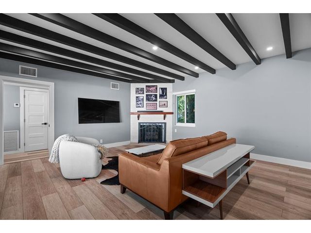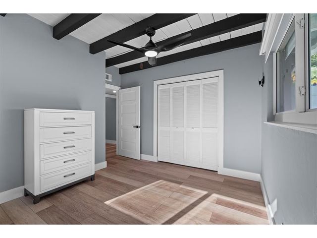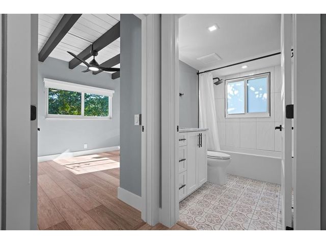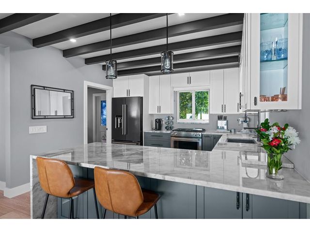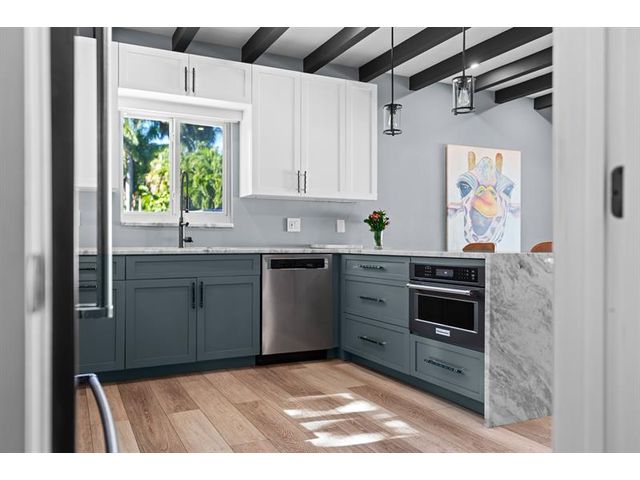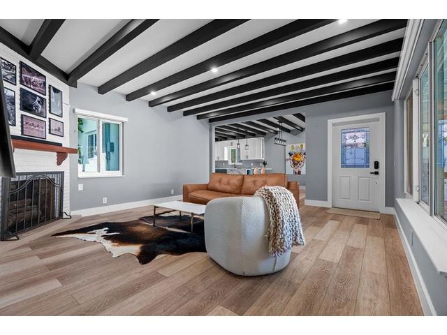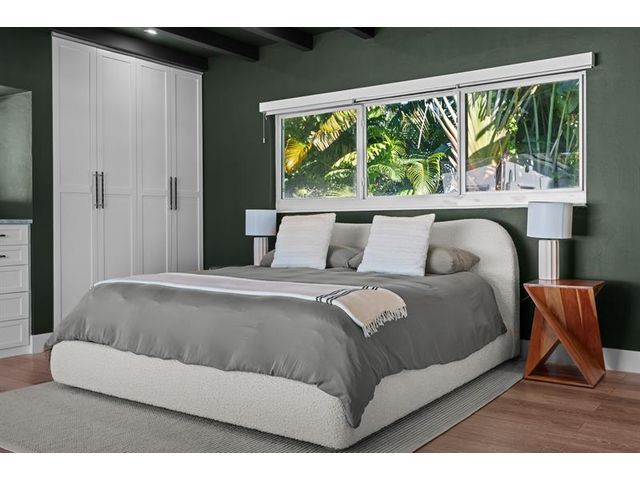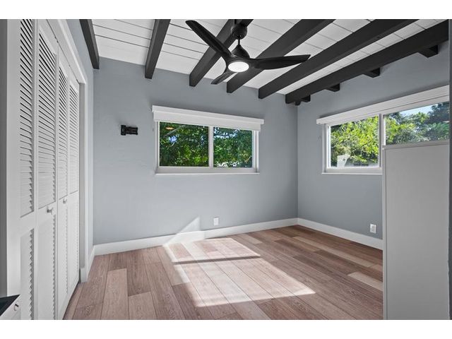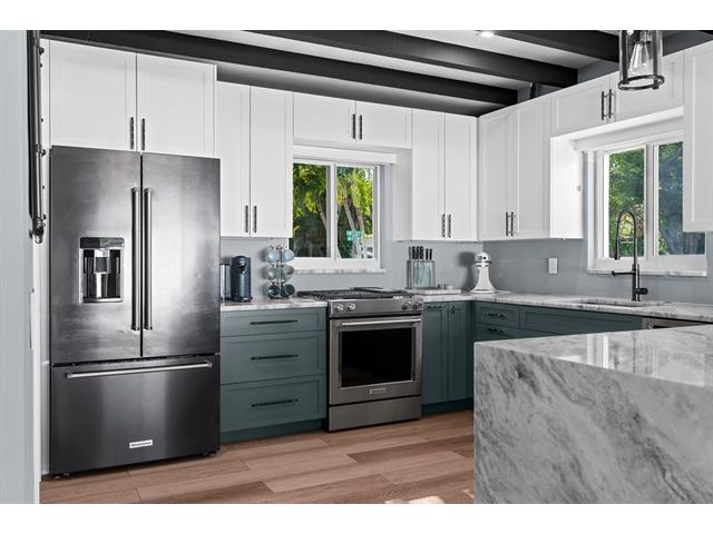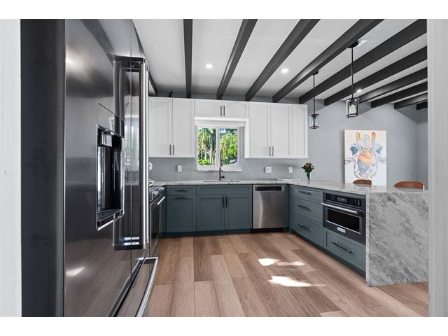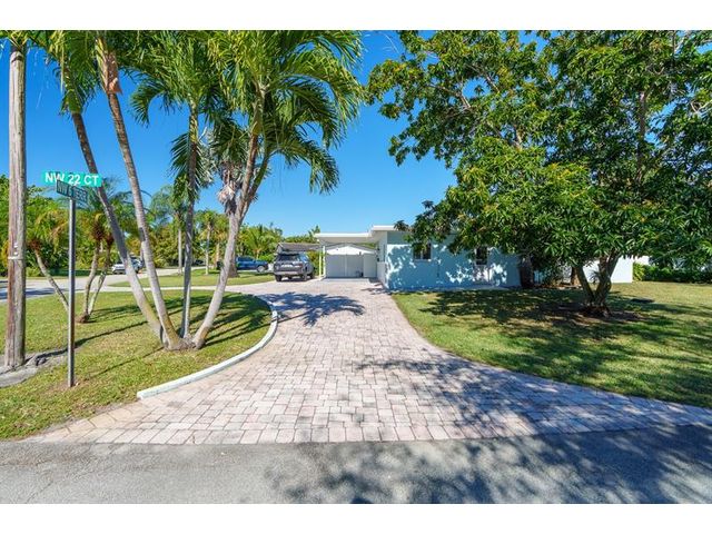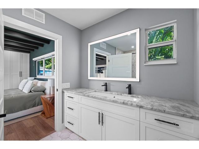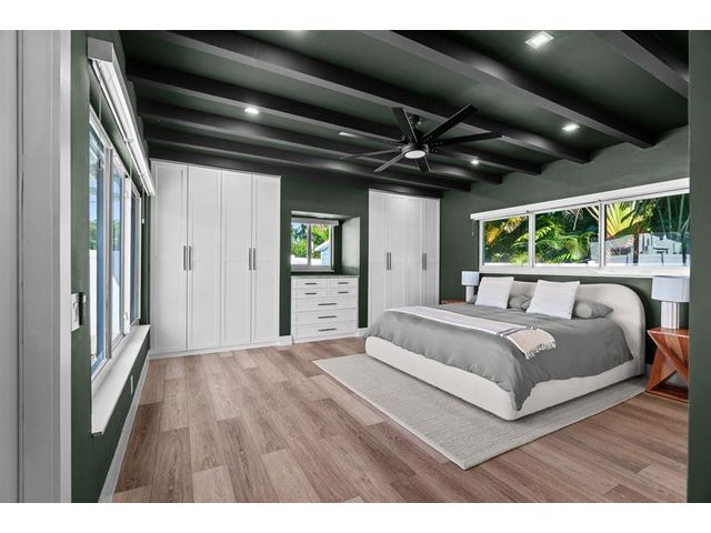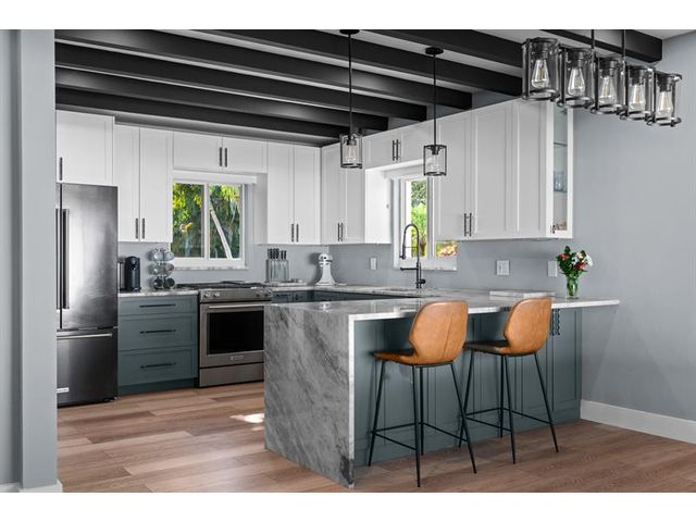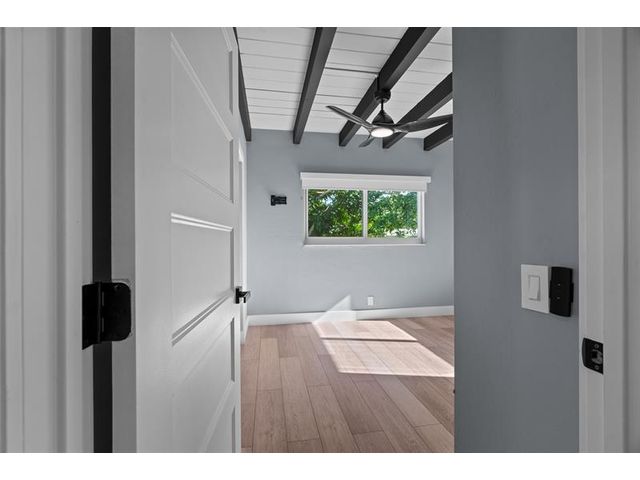 Beautifully updated and full of character, this Wilton Manors corner-lot pool home offers 3 bedrooms, 2 baths, and a warm modern aesthetic. The open living, dining, and kitchen areas are tied together with wood flooring and striking exposed beams. The designer kitchen features quartzite counters, custom cabinetry, soft-close drawers, and under-cabinet lighting. The spacious primary suite easily accommodates a king bed and includes a custom closet system and a spa-like bath with marble floors, a trough sink with dual faucets, and a rainfall shower. Additional perks include a tankless water heater and gas-powered dryer and cooktop. Outside, the property has a fenced in pool and patio and extra side yard that is framed by mature tropical fruit trees including mango, and avocado.