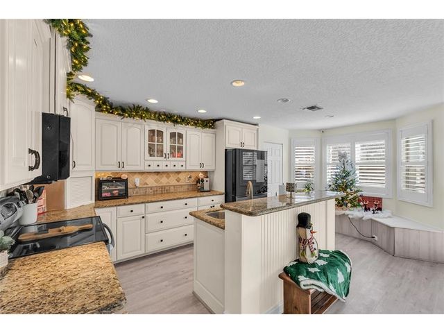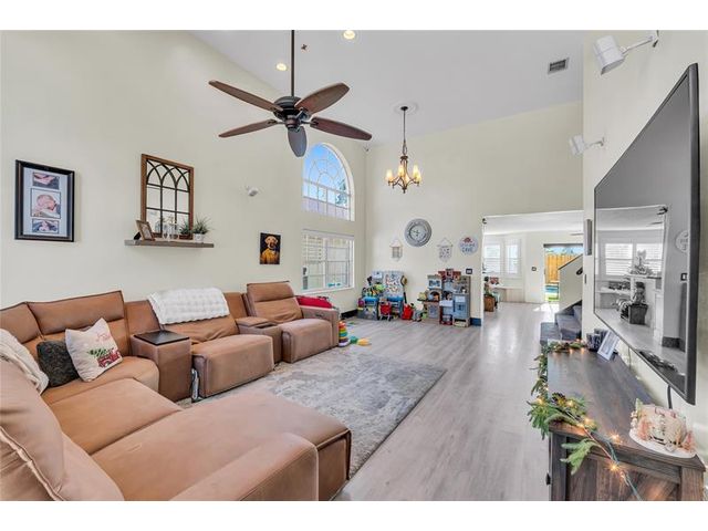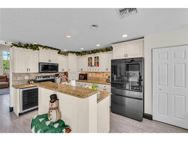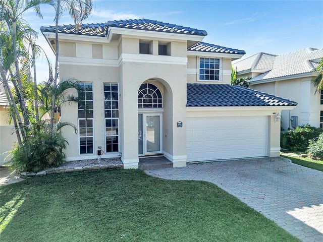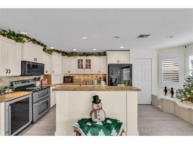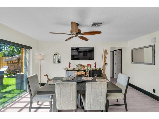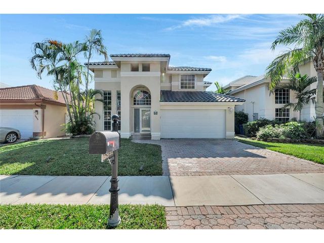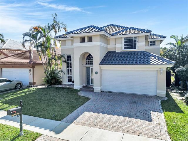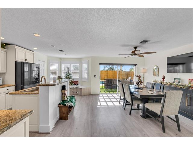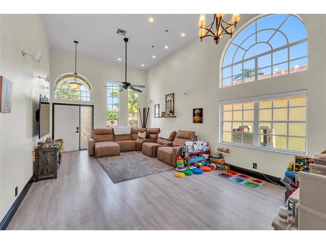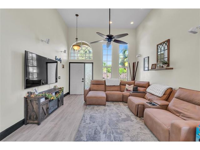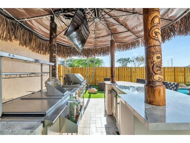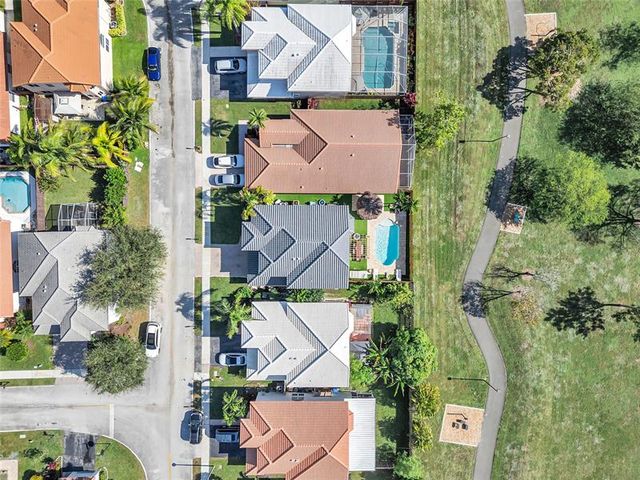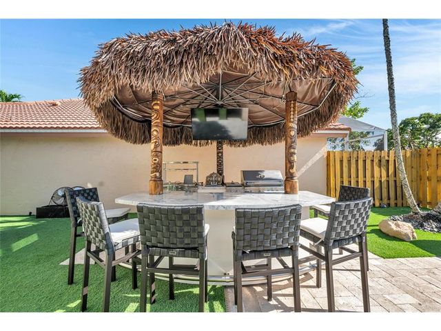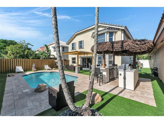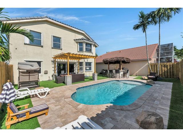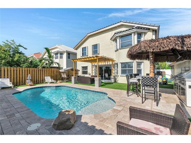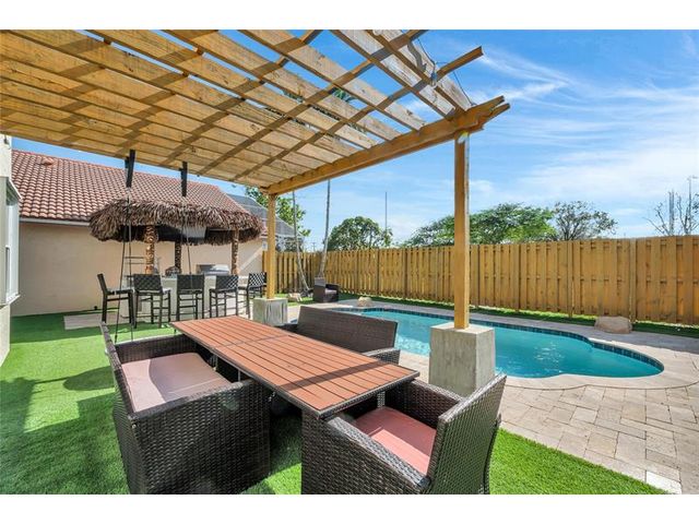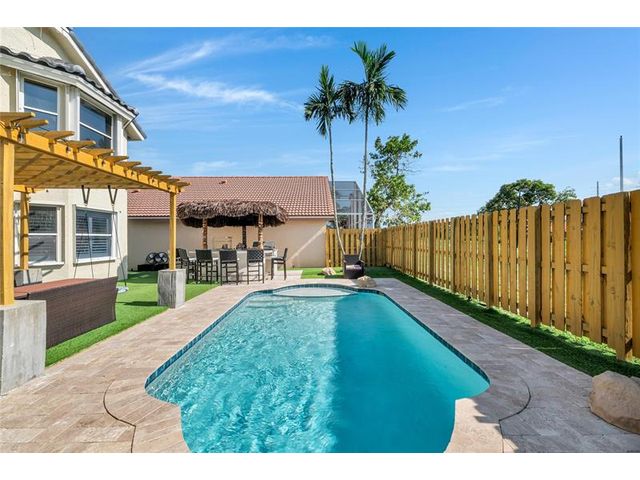 Beautiful 4-bedroom 3-bathroom pool home in a great neighborhood. Roof 2025 and full hurricane protection. As soon as you enter you are greeted by soaring ceilings. The updated eat-in kitchen boasts granite counters, a large island and lots of storage. One bedroom downstairs, currently being used an office. The large primary bedroom has a walk-in closet. The primary bathroom features a dual vanity and large walk-in shower. Enjoy the gorgeous pool area w/pergola, perfect for entertaining. The tiki bar and outdoor kitchen are negotiable. The fully fenced backyard has turf for low maintenance. The home backs up to a large park with playground, basketball courts and walking paths, perfect for families.