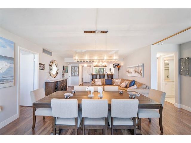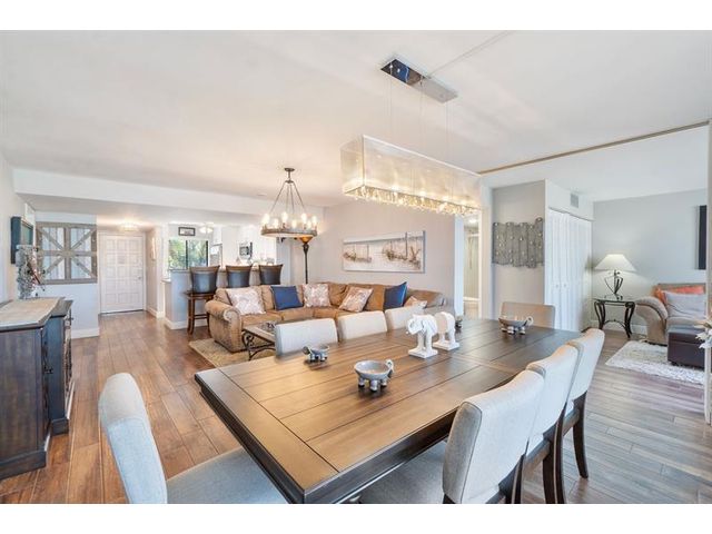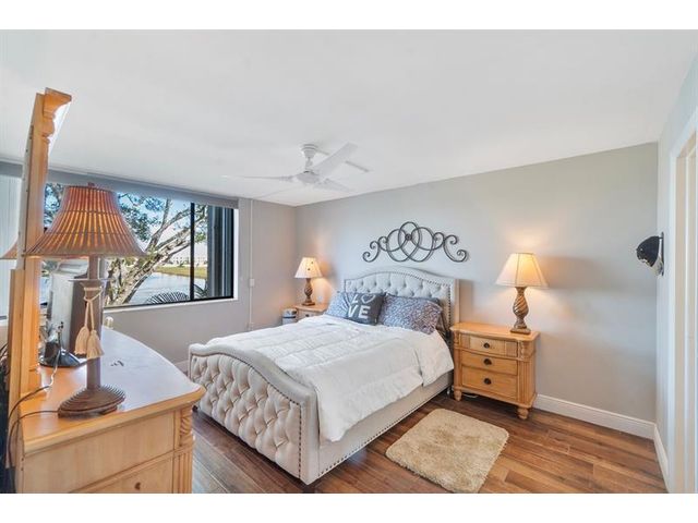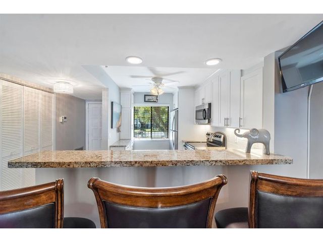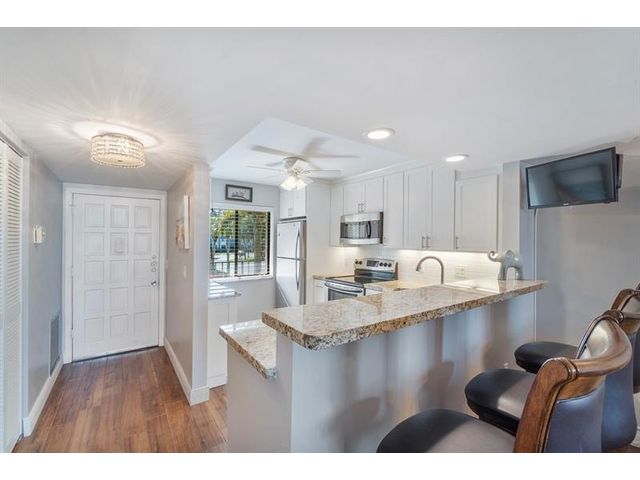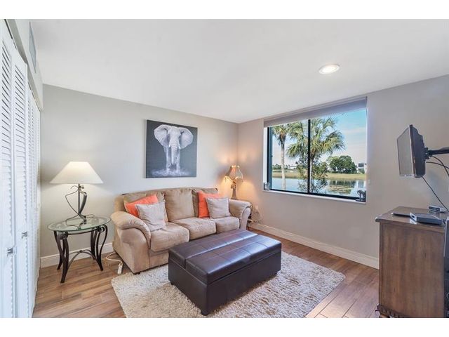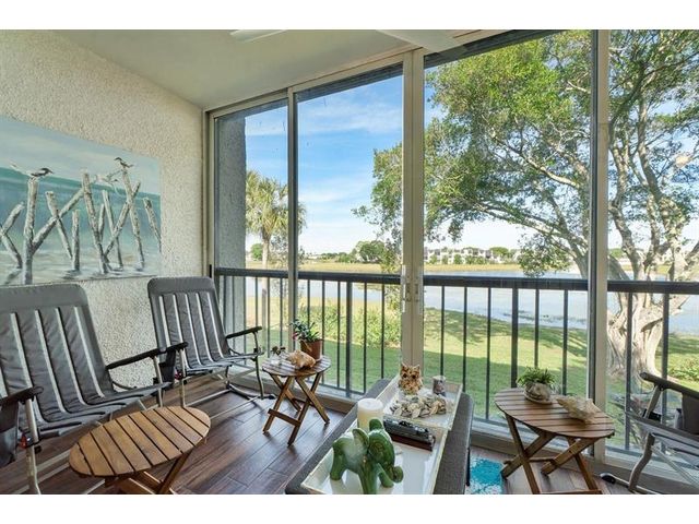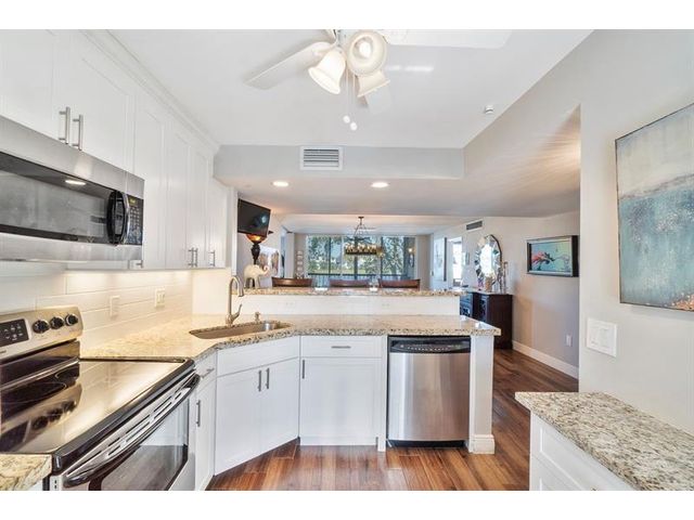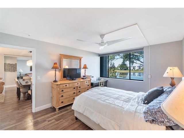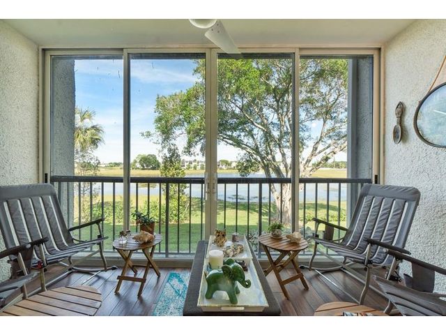 Stunning remodeled 3 bedroom 2 bathroom condo with breathtaking panoramic lake and golf course views—the best in the community! Enjoy water and golf views from every room and window. This immaculate one level condo features tile-wood floors throughout, soft-close cabinets, new modern LED recessed lighting, upgraded kitchen and baths, accordion shutters, and an in-unit washer/dryer. Relax on the private patio overlooking the water. 24-hour manned gate. Community offers 3 championship golf courses, tennis courts, dining restaurants, and a fitness center. Top-notch upgrades throughout—this is an absolute must-see!