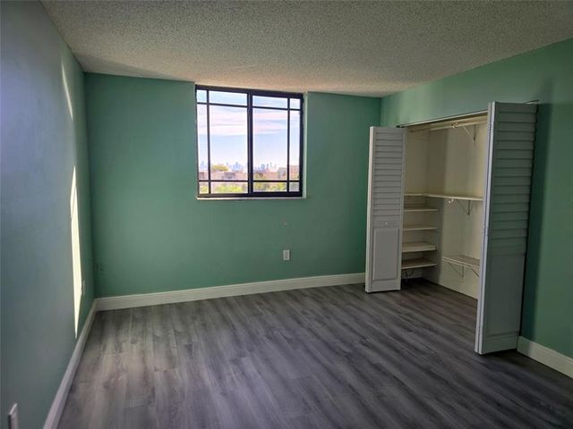Two bedroom two bath, balconies were eliminated, to gain more space in the living room and one bedroom, one assigned parking and one additional parking as guest, parking area is gated a control remote is needed to gain access. The apartment has in laundry area, stove, microwave and refrigerator. Is located ,on a fifth floor and has a view looking at Miami's skyline, building has a pool, elevators, building has 6 floors, you will need to apply for the condominium association.