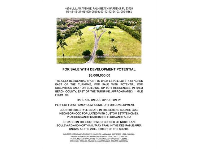 The home is situated on 4.63 Acres, the largest residential lot available in all of Palm Beach County East of the Florida Turnpike. With potential for subdividing up to 6 parcels, also ideal for a Family Compound. Located in the Palm Beach Gardens area coming to be known as: 'The Wall Street of the South', it's just one turn off the Northlake Boulevard and North Military Trail metropolitan area, to the serenity of the Square Lake neighborhood populated with peacocks, horses and custom estate homes. This 1972 home is structurally sound with a beautiful layout, in need of updating. The 4.63 acres consists of two nearly identical 2.31+ acre lots situated front to back onto Lillian Avenue. City Water available PCN 00-42-42-24-01-000-0861 2.32 Acres PCN 00-42-42-24-01-000-0860 2.31 Acres