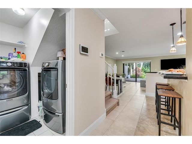 Welcome to this chic waterfront end-unit townhome tucked into a private, wooded enclave in the heart of Wilton Manors. This rare residence offers a covered garage & impact-resistant windows throughout, & is located just off Wilton Drive. Set on a quiet, tree-lined street bordering a nature preserve and tranquil canal, it blends privacy with walkability. The well-maintained home features a bright, open layout filled with natural light. The updated kitchen includes granite countertops, tile backsplash, stainless steel appliances, & ample cabinetry. Tile flooring enhances the main living areas. The primary suite offers peaceful water views. Step outside to enjoy an extended patio, a large private backyard, & a private waterside dock ideal for kayaking or relaxing along the canal.