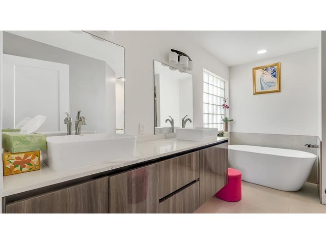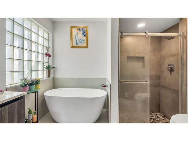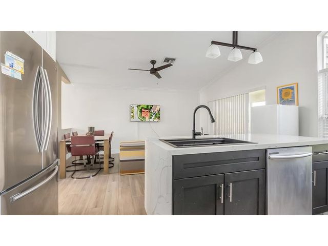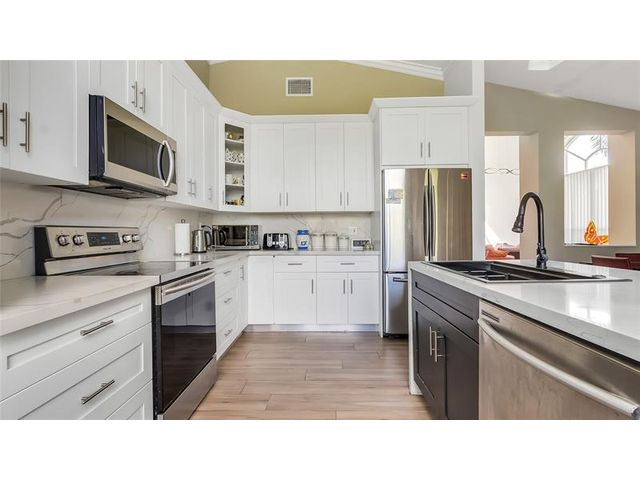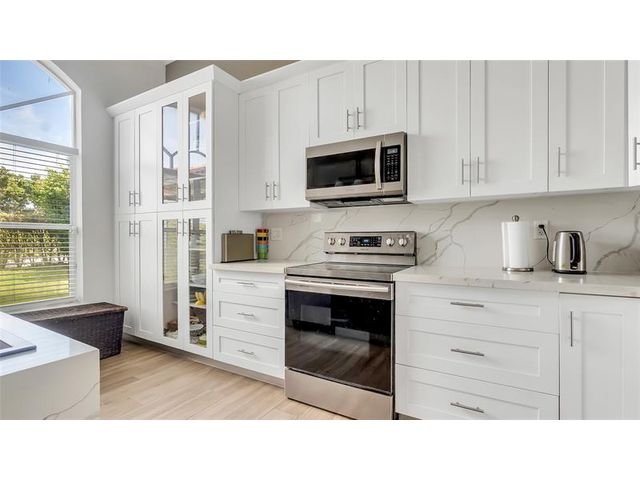 Stunning corner-lot two-story residence located in one of Boynton Beach’s most sought-after communities. Completely remodeled throughout, this home features soaring vaulted ceilings and a refined blend of tile, wood, and carpet flooring. The designer kitchen showcases marble islands and backsplash paired with high-end appliances, seamlessly combining modern elegance with everyday comfort. The spacious first-floor primary suite offers privacy and convenience, highlighted by a Roman tub, marble sinks, and coordinated high-end vanities. A generous two-car garage and expansive driveway provide ample parking. The oversized yard offers room for a pool, subject to builder approval.