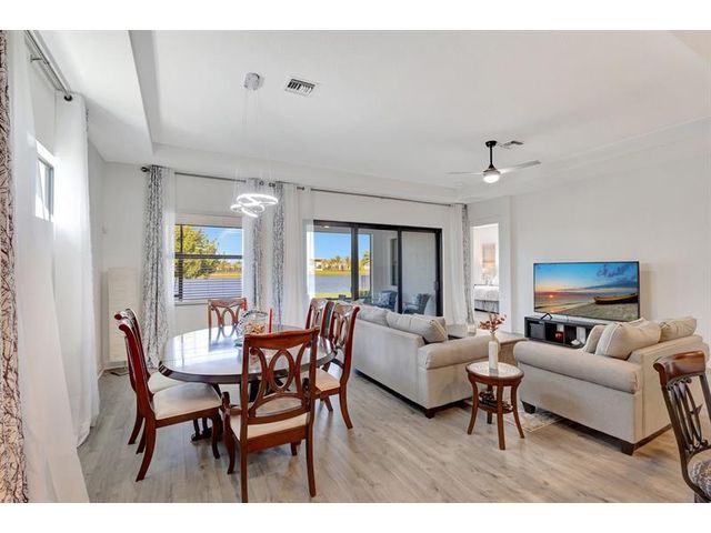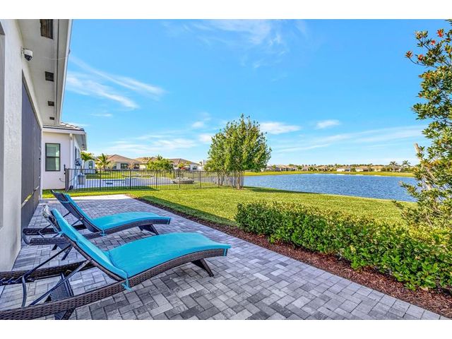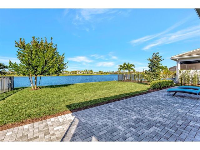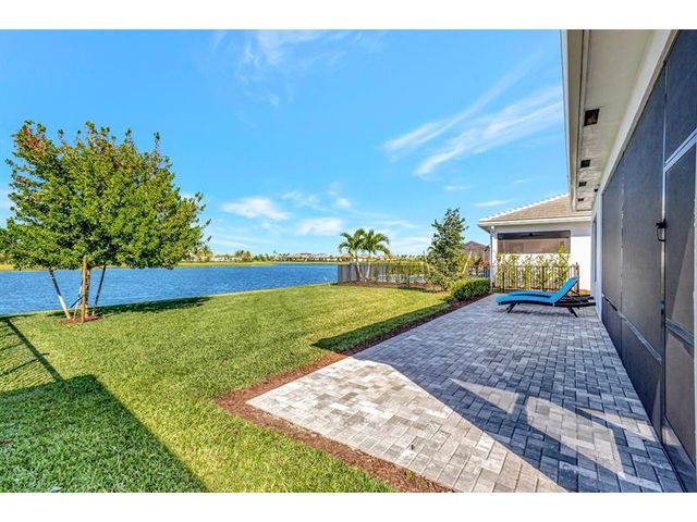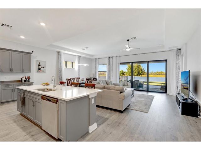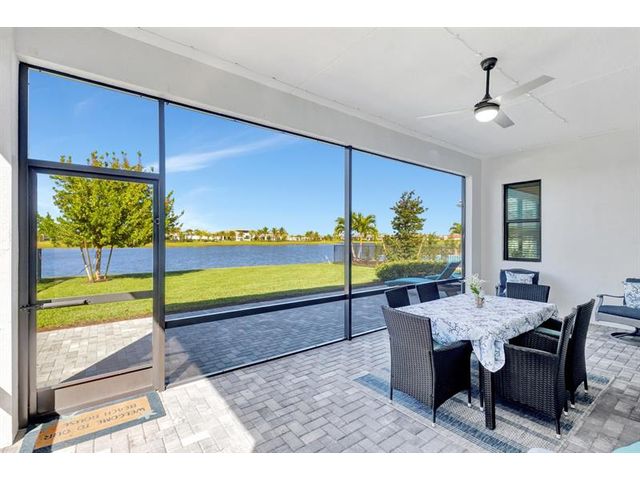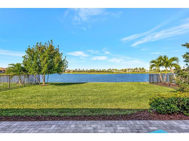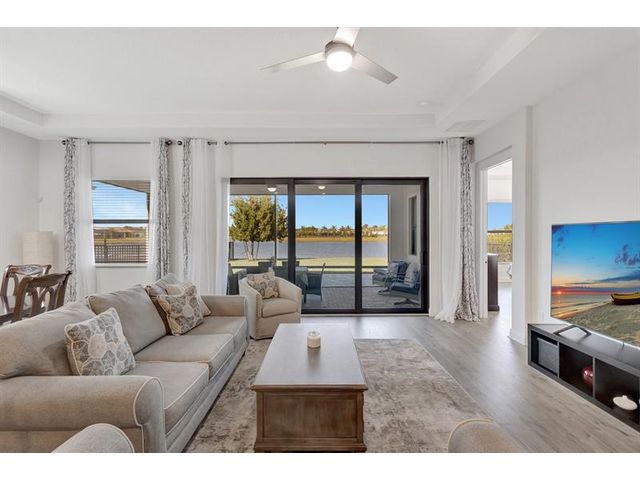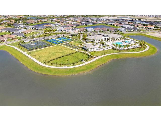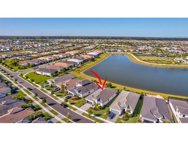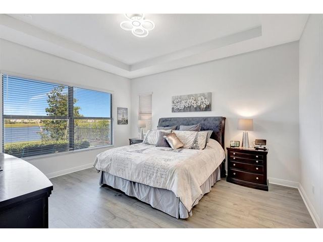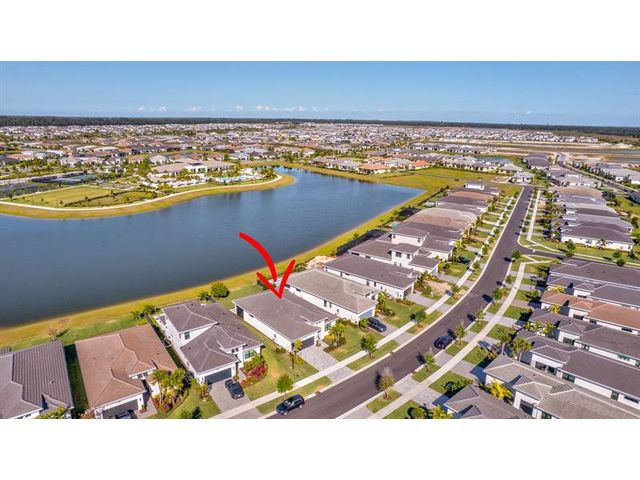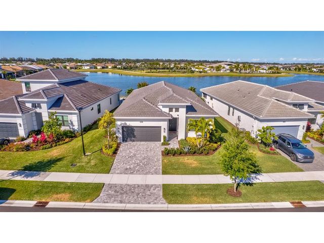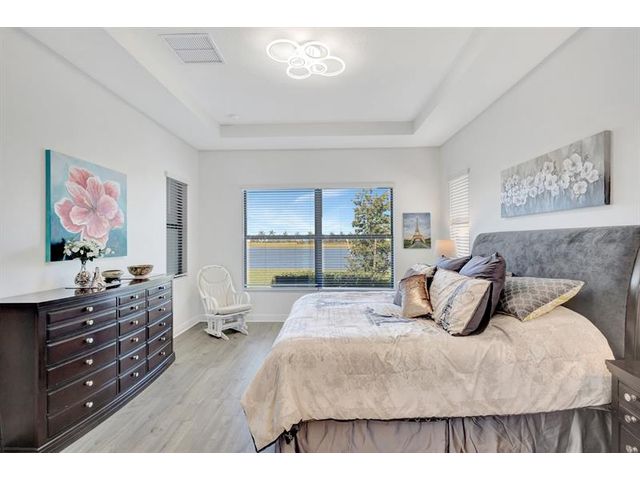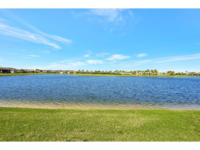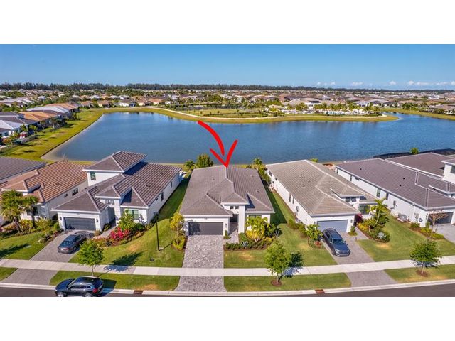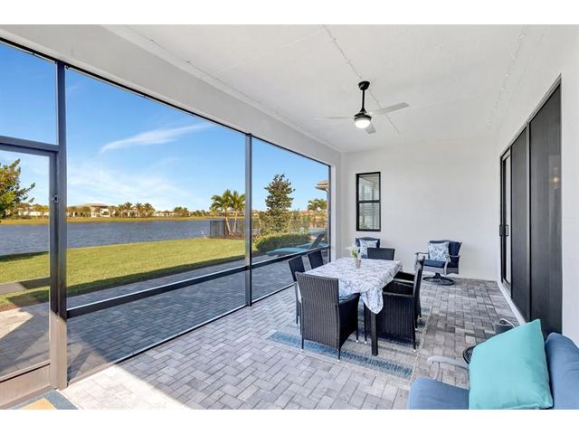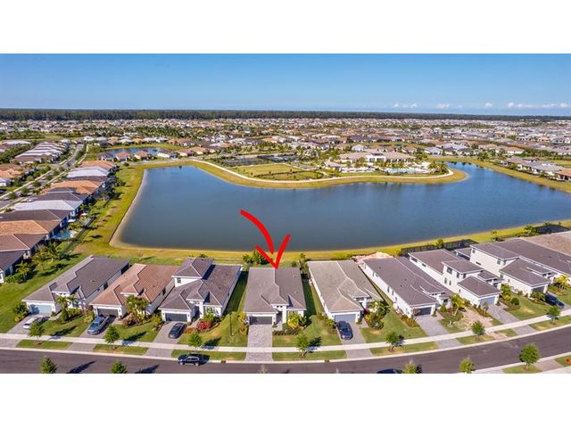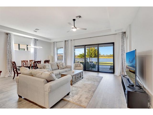 Winter scape resort style, lakefront 3 beds floor plan home w/ stunning panoramic views of the water, creating a serene & picturesque setting. Modern One-story home featuring impressive 10 & 11-foot ceilings & expansive windows for natural light. Elegant, seamless laminate wood flooring flows throughout, enhances the sense of spaciousness & warmth. Large den. Tankless water heater, Frameless glass shower adds a touch of sophistication. Step out onto the screened-in lanai, providing ample space for relaxation. The home is situated in a highly sought-after 55+ gated community that offers a wide array of resort-style amenities, including pickleball, tennis, heated pool, dog park, bocce courts, & entertainment director adds to a vibrant community life. Its 2 bedrooms plus an office/dan/guest.