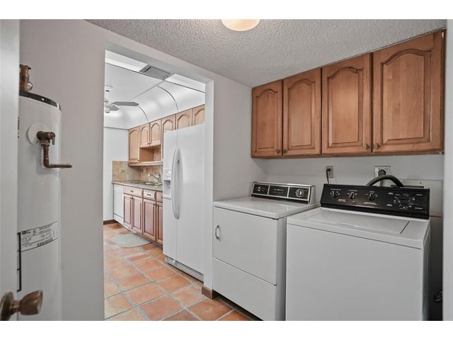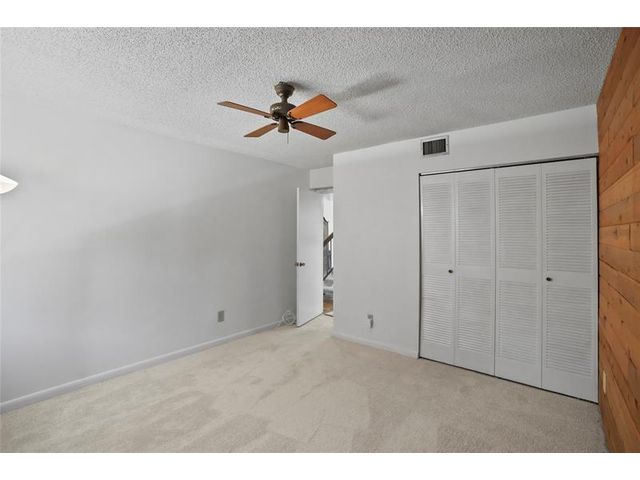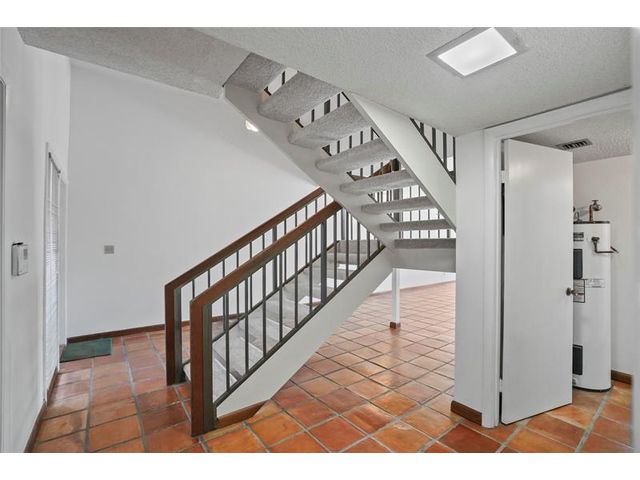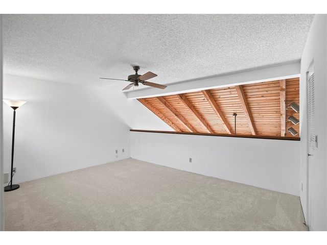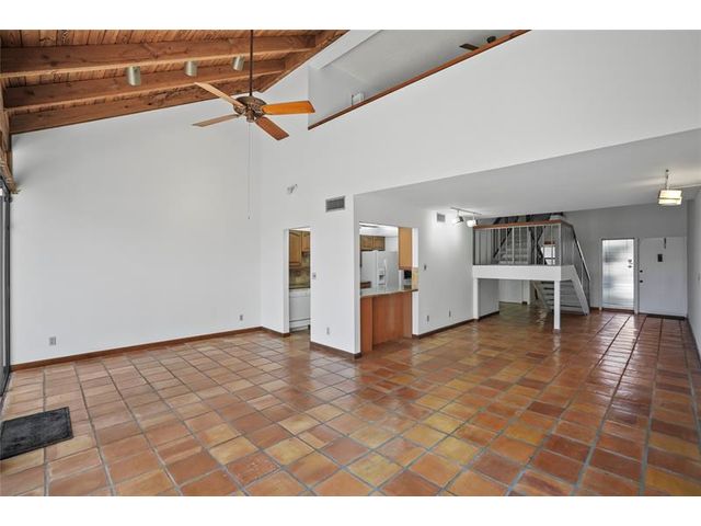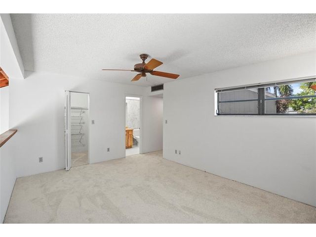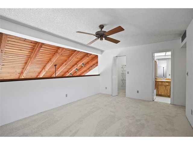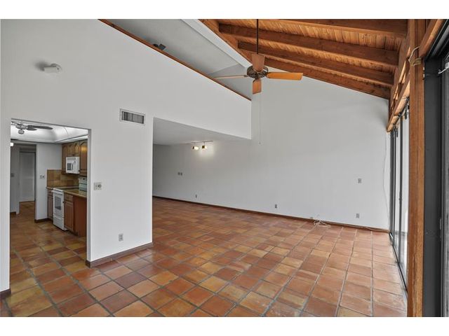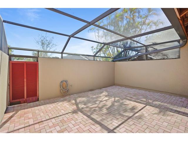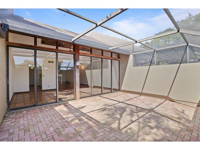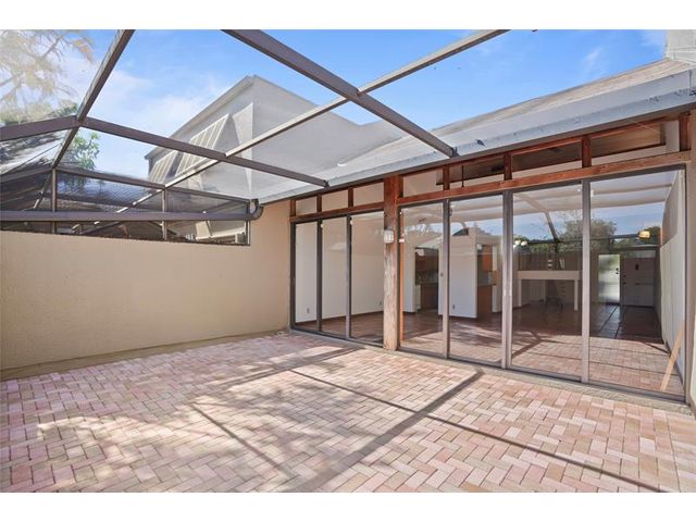 Experience the ultimate in privacy and space with this Greenhouse model, the largest floor plan in Villas West. Featuring no rear neighbors and serene green space views, this 3-bedroom 3-bath home boasts dramatic cedar-beamed ceilings and bright, open living areas. The flexible layout includes a downstairs guest suite, an upstairs ensuite, and a luxurious master retreat with a private loft and walk-in closet. Enjoy an eat-in kitchen with granite counters and custom cabinetry, flowing seamlessly to a large screened patio. Walkable to the pool and courts for pickleball, tennis, and more. Key updates include a 2018 flat roof, 2016 exterior electrical service panel and 2015 AC, offering peace of of mind alongside architectural charm. Perfect for indoor-outdoor living and modern comfort