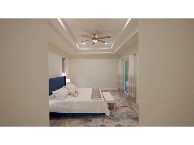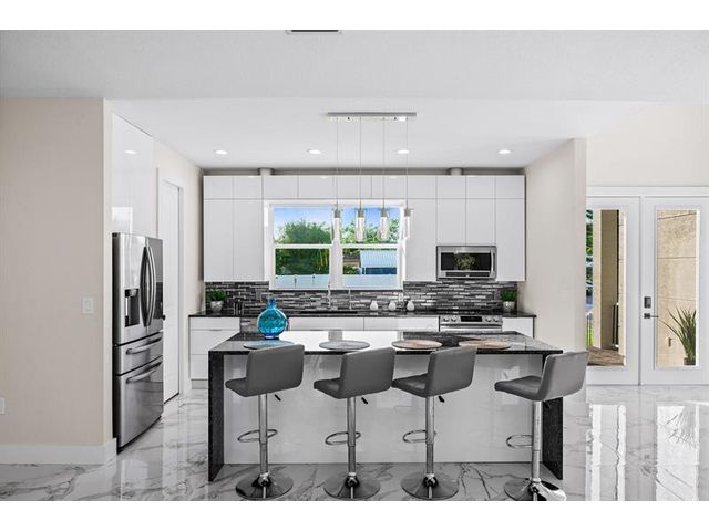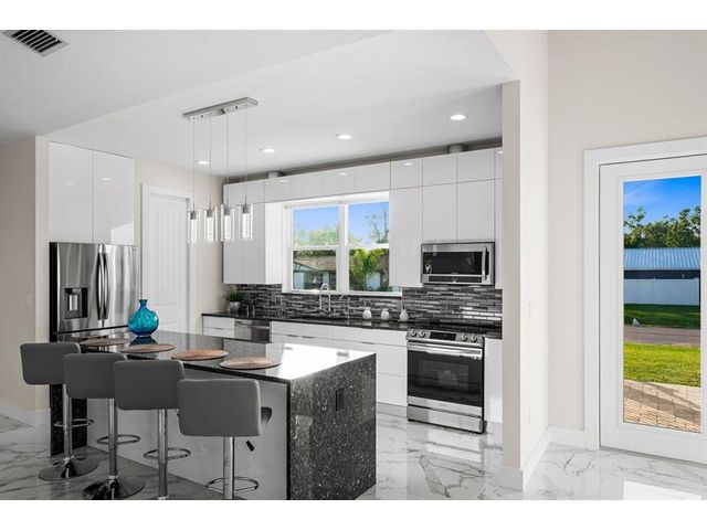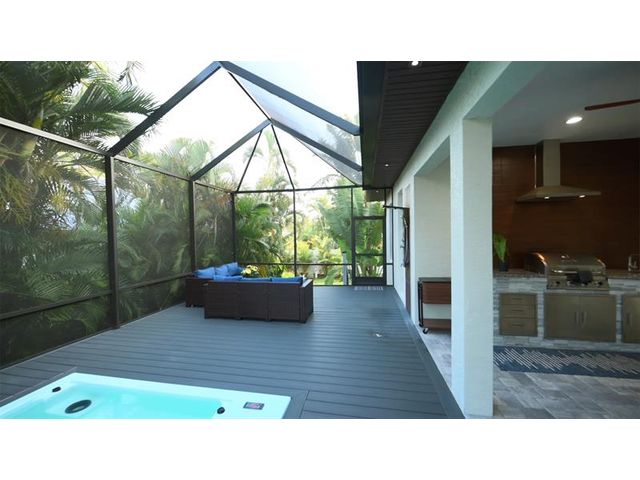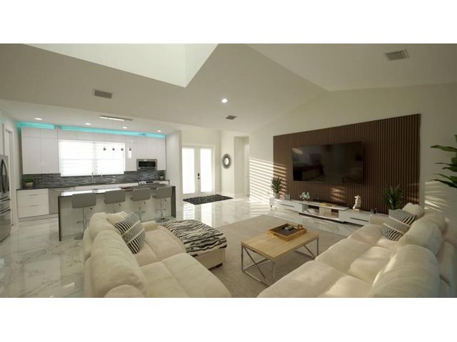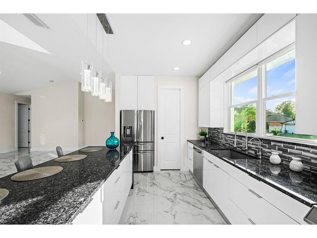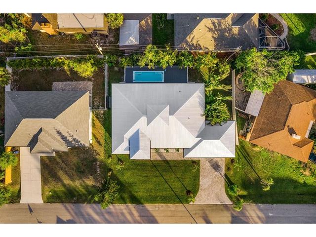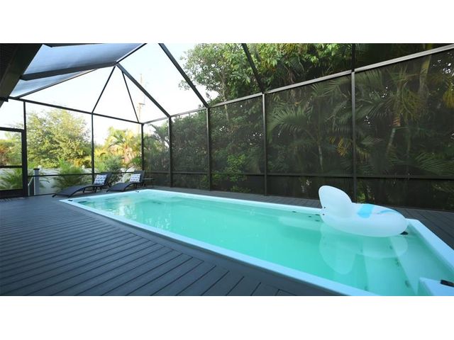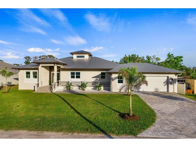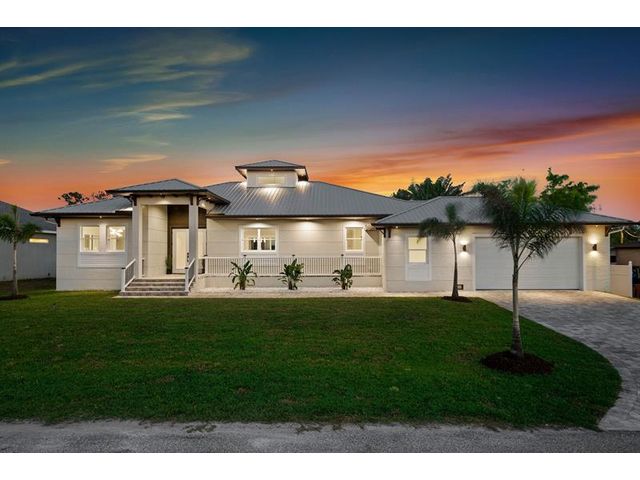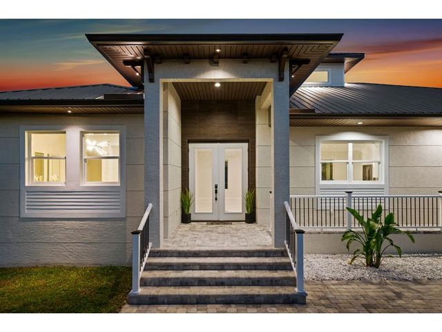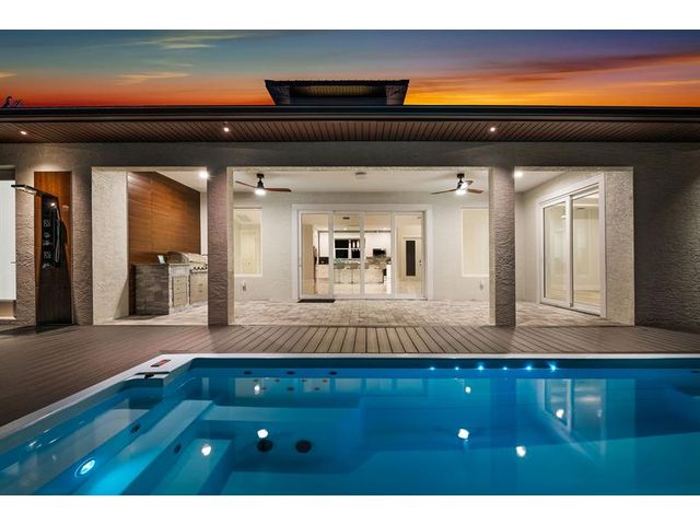 This custom home combines modern design in a prime location just 10 minutes from Venice Beach and downtown. Set at the end of a quiet street, it offers added privacy. The nearly 3,400 sq ft open floor plan includes 3 bedrooms, 3 baths, and a 780 sq ft garage. Built on a 7-course stem wall, the home features impact windows and doors, a 14-ft foyer, and a primary suite with two walk-in closets, walk-in shower, and freestanding tub. The kitchen showcases a large island, Blue Pearl granite, high-gloss cabinetry with lighting, and premium appliances. Porcelain tile runs throughout. Outdoor highlights include a covered lanai with summer kitchen, heated swim-spa pool, Trex deck, metal roof, paved drive, and landscaped backyard. Near parks, trails, yacht club, and ferry beach—ideal Florida living.
