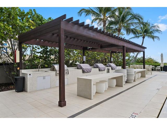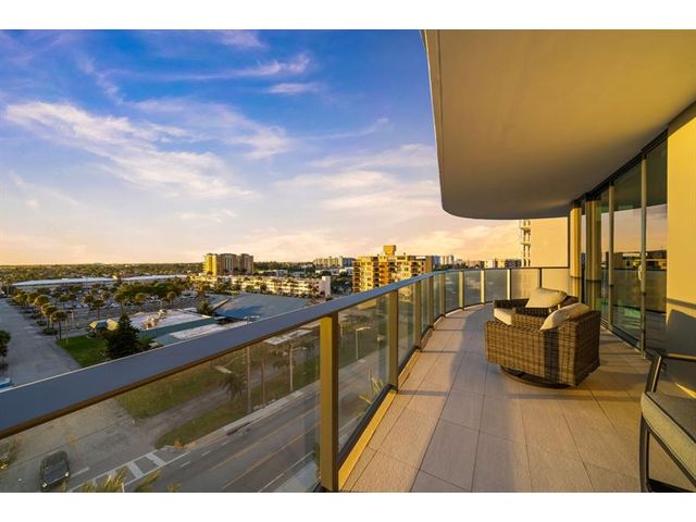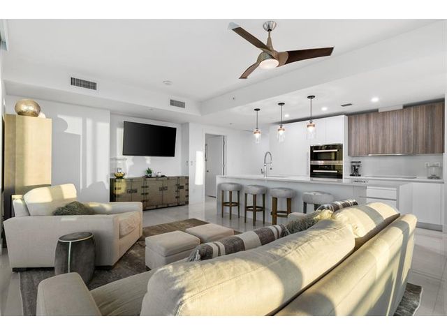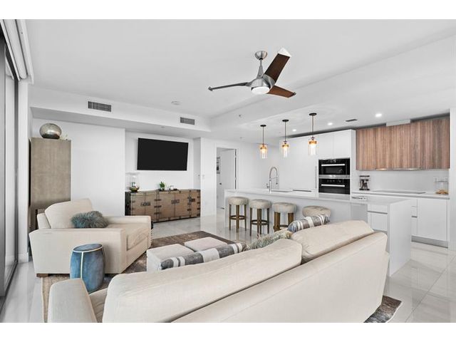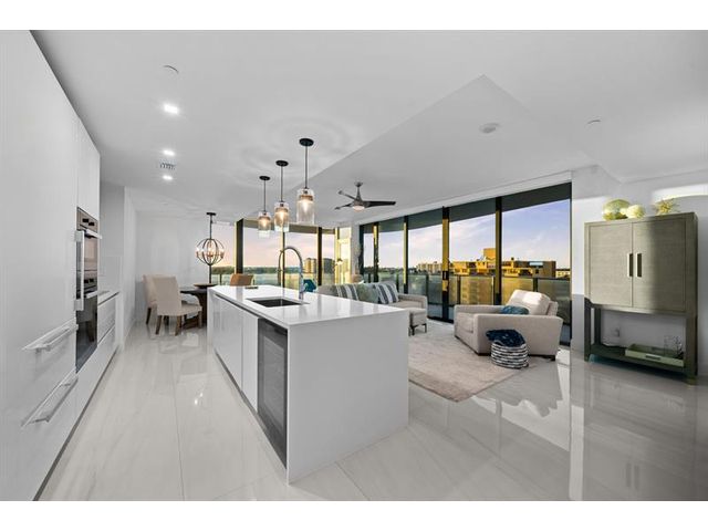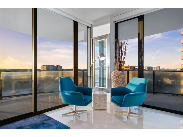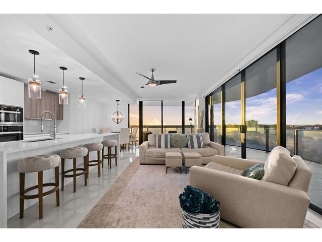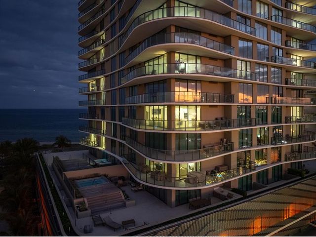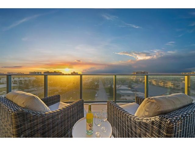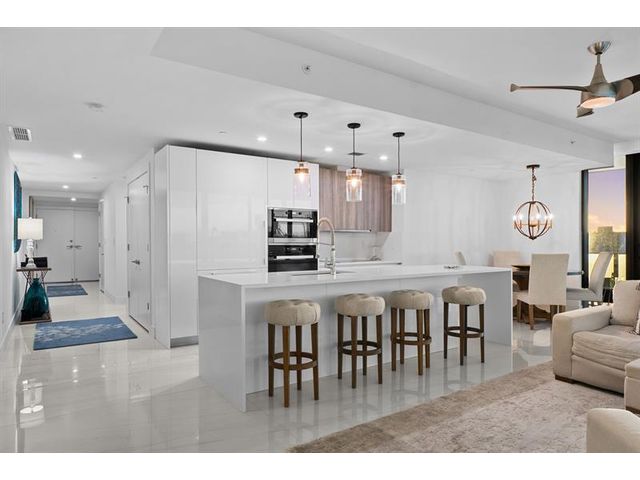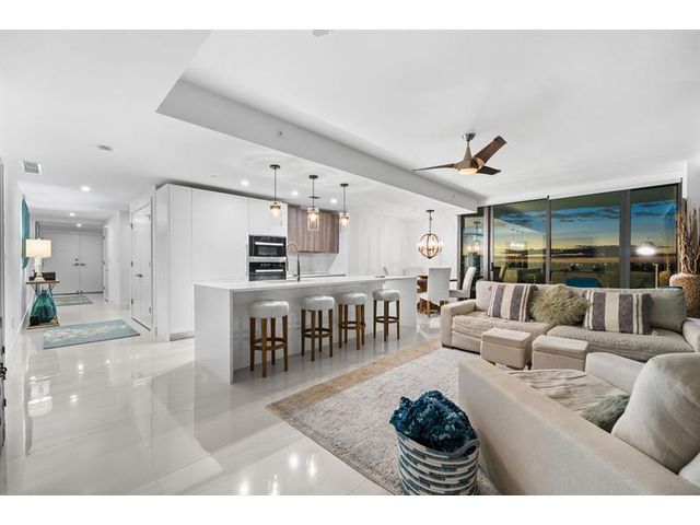 Enjoy spectacular sunsets and ocean views from this move-in-ready corner residence in boutique Sabbia Beach. This thoughtfully upgraded unit offers an expanded living area created by relocating the kitchen island, along with a custom cut-out to accommodate a TV and freestanding dresser, improving flow and functionality. Spacious interiors, natural light, and low monthly HOA fees in a superbly managed building make this an excellent full-time home or family vacation retreat. Amenities include a beachfront pool, state-of-the-art fitness center, and oversized club room for entertaining. Residents enjoy a 24/7 attended front desk, valet, on-site management, and the privacy of a semi-private elevator shared by only two residences per foyer in a boutique building of just 69 homes.