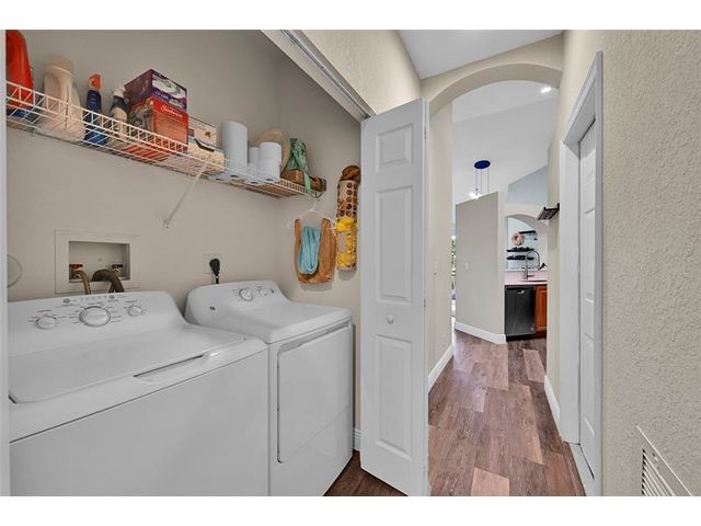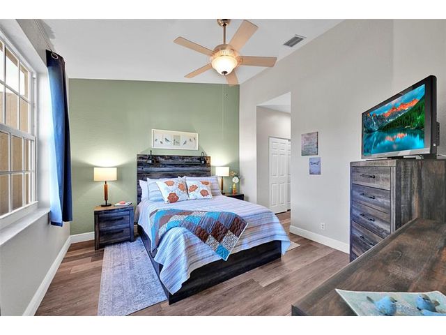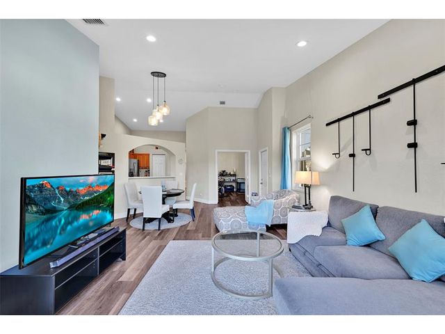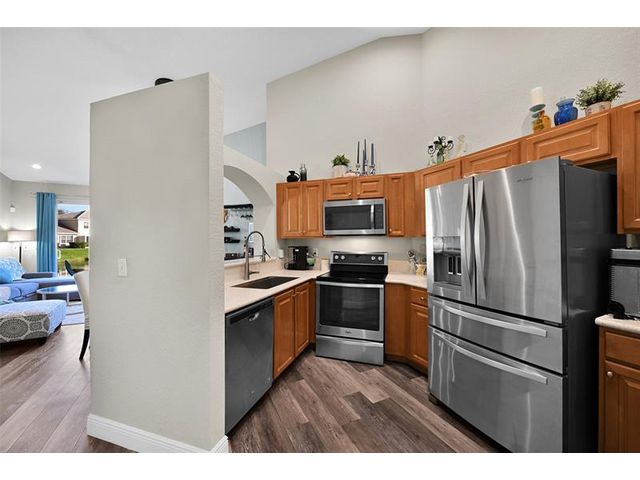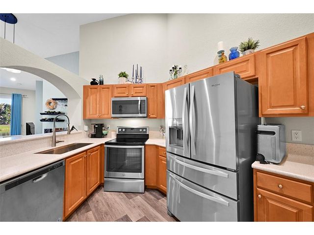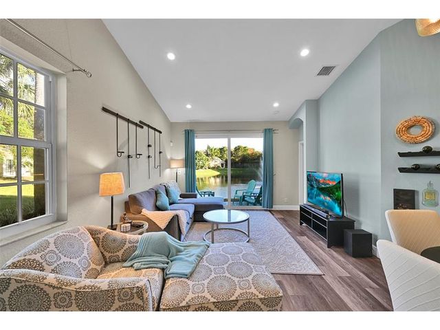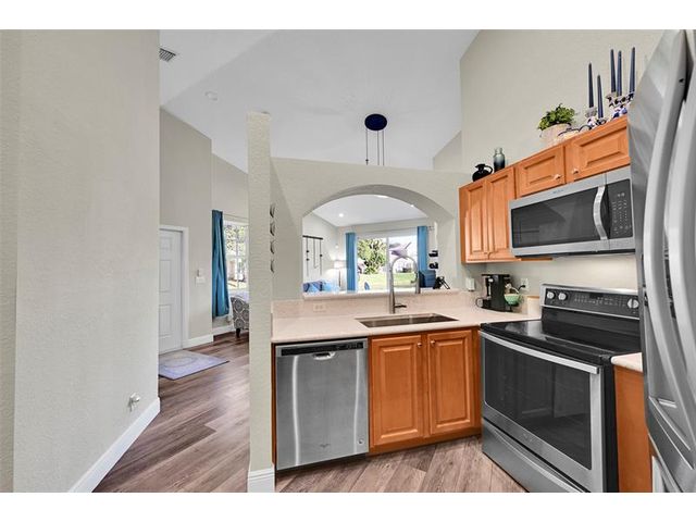 Welcome to this beautifully updated home located in a desirable gated community. Ready to move in 3-bedroom, 2-bath home which features an open-concept layout with split bedrooms, volume ceilings, and recessed lighting. Vinyl flooring throughout. Both bathrooms have been remodeled. Full size washer and dryer. SS Whirlpool appliances, with tons of cabinets and counter space. Enjoy peace of mind with impact windows and doors, a newer roof, 2020 water heater. The 1-car garage is complemented by a driveway accommodating 2–3 additional vehicles. Private backyard with serene lake views and no rear neighbors. Low HOA fees enhance the value of this well-maintained home. A rare opportunity to own a move-in-ready property with upgrades, privacy, and exceptional views— WELCOME HOME