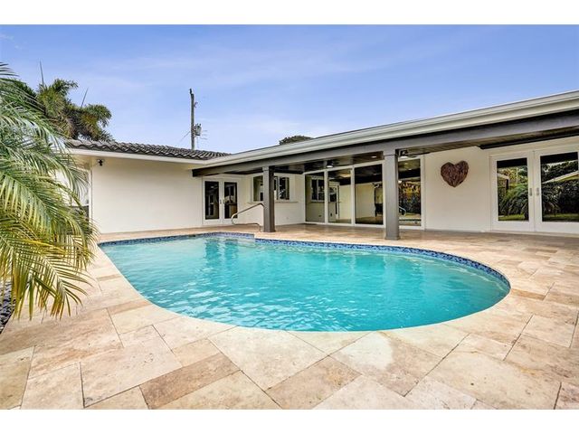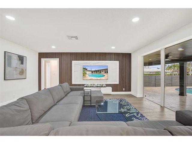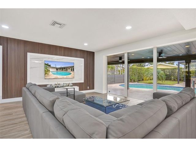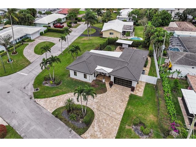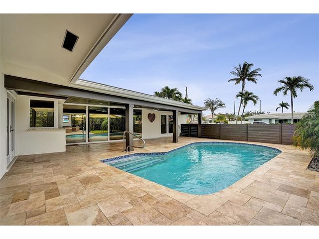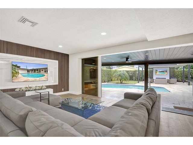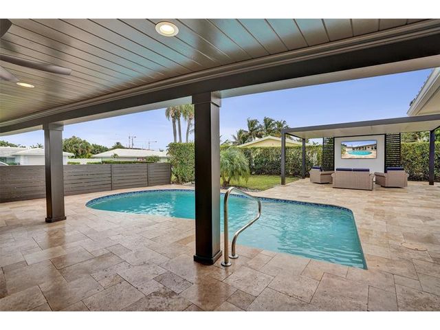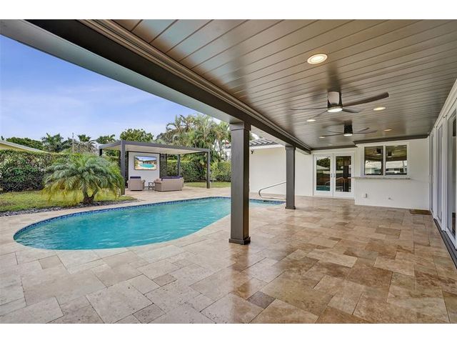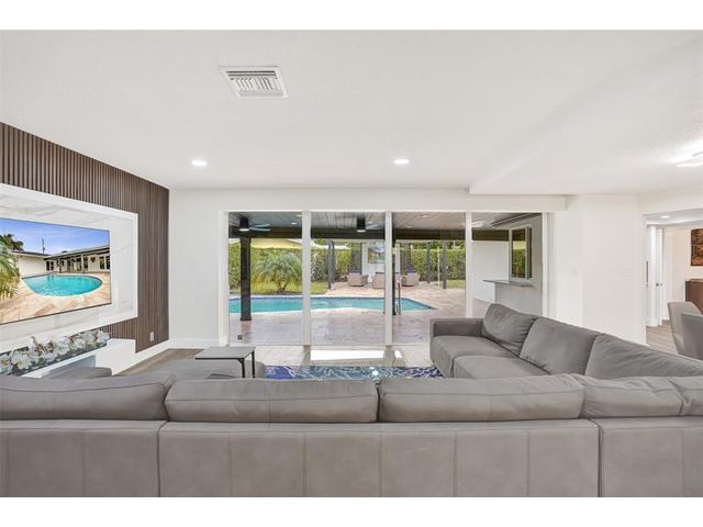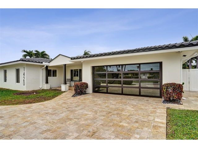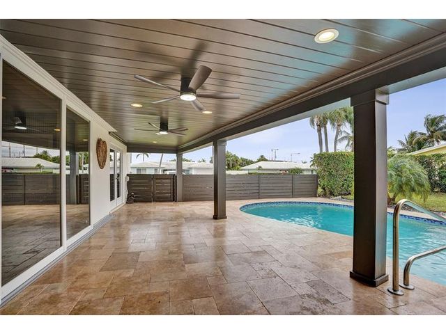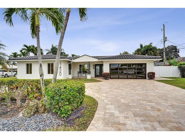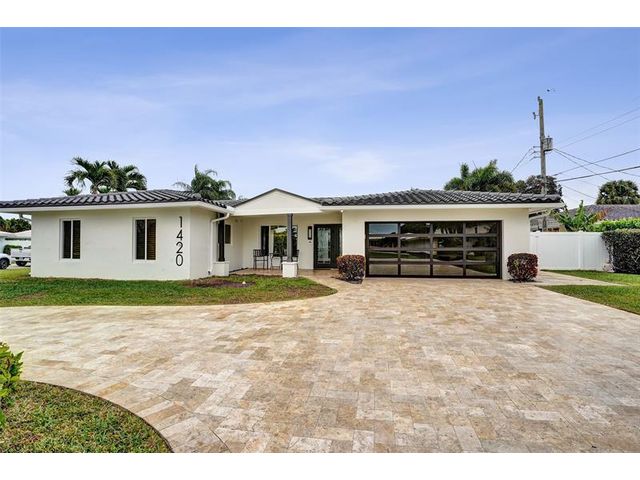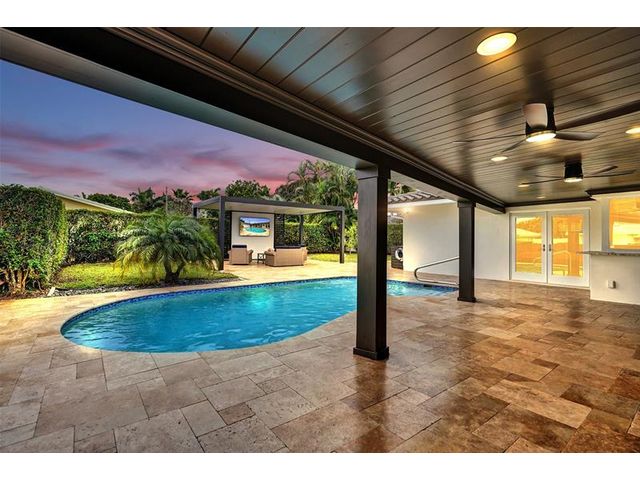 Completely updated 4-bedroom, 2-bathroom home located in an elite Deerfield Beach intracoastal neighborhood. Situated on a large corner lot, this residence features new ceramic tile plank flooring throughout, a fully renovated kitchen and bathrooms, and all new interior doors. Major system upgrades include newly relined plumbing with warranty, new insulated ductwork, updated LED lighting, switches, and outlets. Exterior highlights include a new designer glass garage door, sealed paver driveway, and beautifully maintained pool and patio deck with serviced pool equipment and heater. Enjoy outdoor living with a spacious covered patio featuring fans and lighting, plus a new oversized pergola with LED mood lighting and outdoor TV. Automatic sprinkler system included. A move-in-ready home!