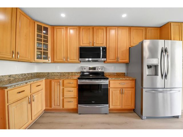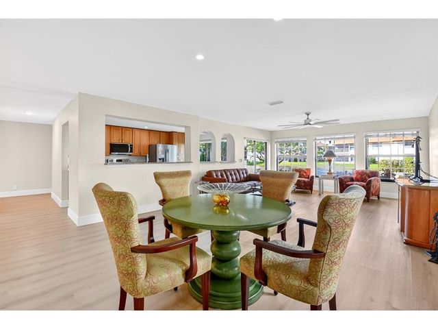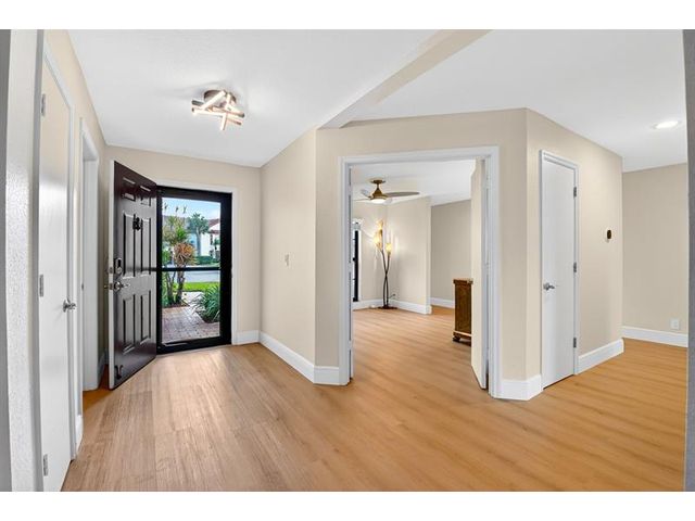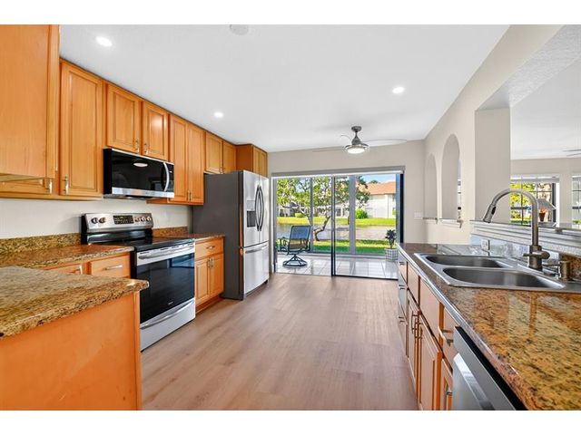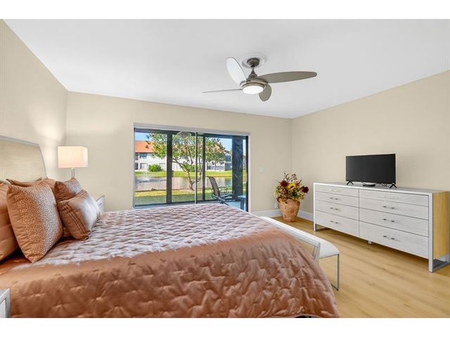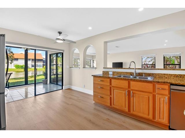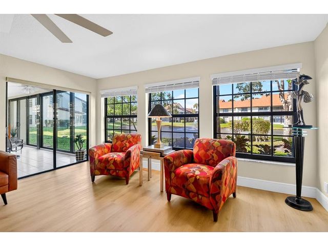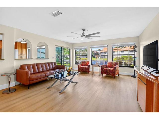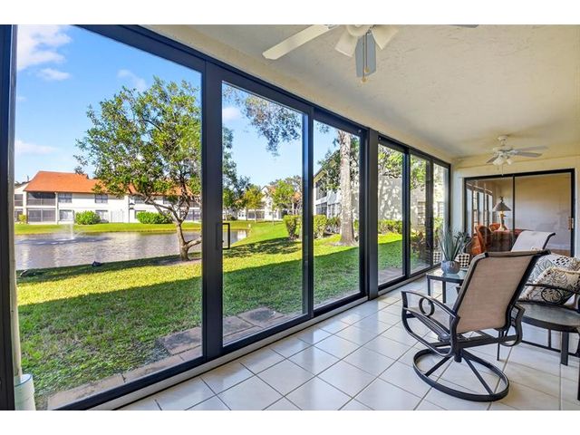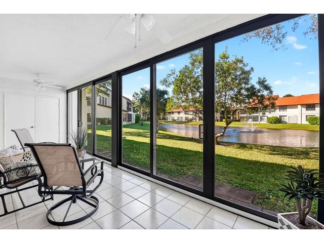STUNNING LAKESIDE RENOVATION! 1st-floor condo offers expansive water and fountain views and a spacious 2BR + Large Den layout. Fully updated in 2025 with brand-new Luxury Vinyl Plank LVP flooring, fresh paint, and a spa-like primary bath retreat. IMPACT GLASS (2019) & New Hurricane Garage Door (2022). New AC (2022) & New Water Heater (2024). New kitchen appliances, designer flooring (2025), GARAGE: Attached garage with brand-new professional acrylic flooring (2025). Primary suite with lake views; kitchen opens to a lakefront patio. Enjoy effortless first-floor living with easy grocery access and a well-maintained community where the HOA is responsible the roof. Enjoy the peace of mind of a well-maintained community known for its incredibly friendly neighbors and welcoming atmosphere.