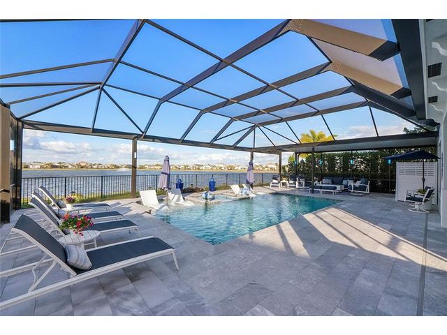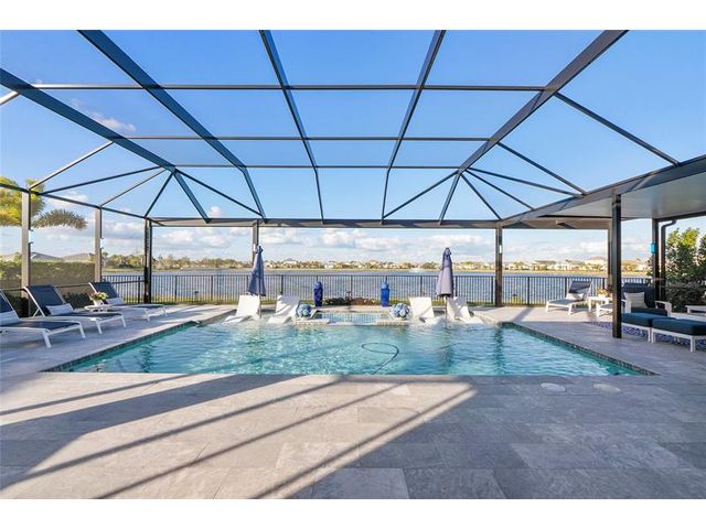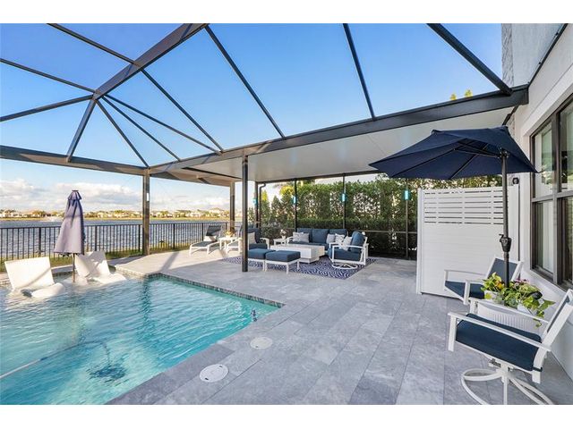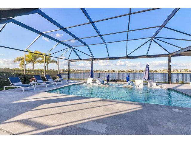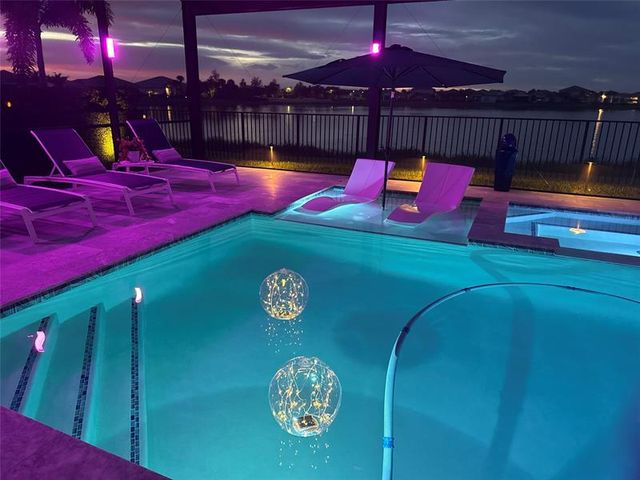 This must see one of a kind 5 bed 6 FULL bath newer-built home offers a rare combination of modern design and resort-style outdoor living with an extraordinary lake view! The backyard includes a screened-in enclosure with an insulated roof and extended patio creating the perfect environment for entertaining or relaxing outdoors. The heated saltwater pool is fully smart-controlled. All closets have been professionally outfitted, maximizing storage and organization-including the garage! Aerial views showcase the home’s premium waterfront position within a beautifully maintained community of newer residences. This property is the perfect blend of new construction appeal, high-end upgrades, and Florida luxury living, offering a move-in-ready opportunity for the most discerning buyers!
