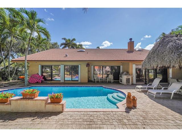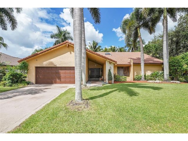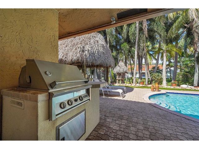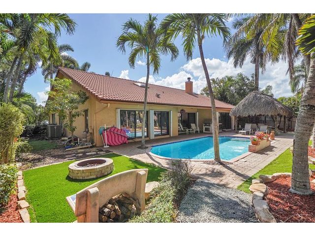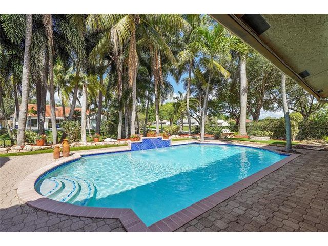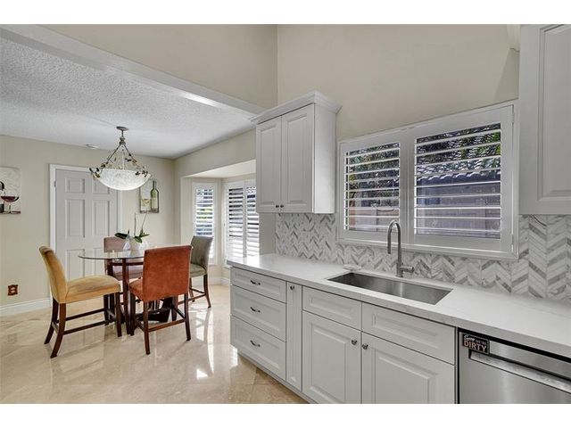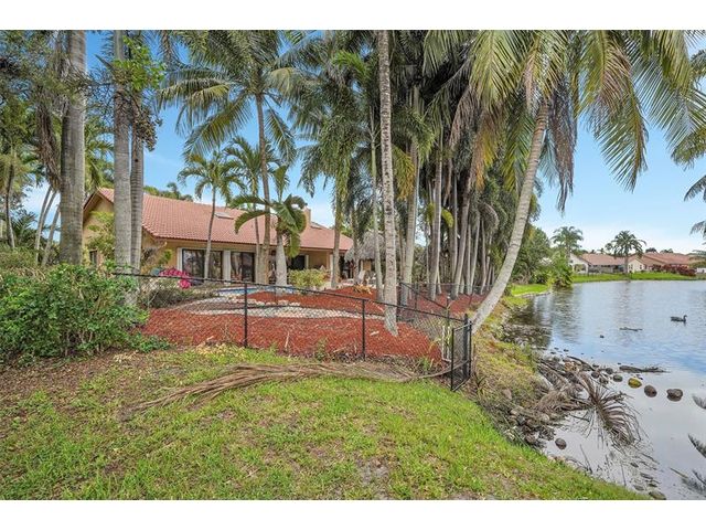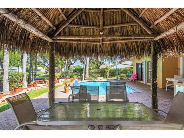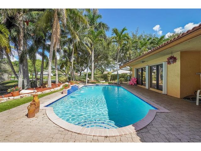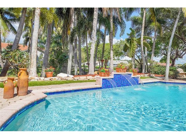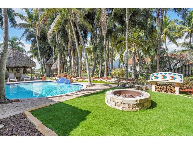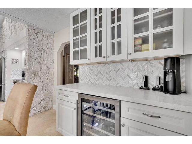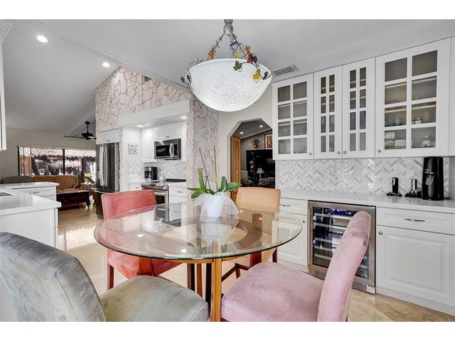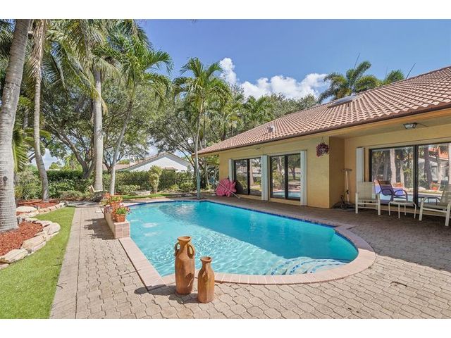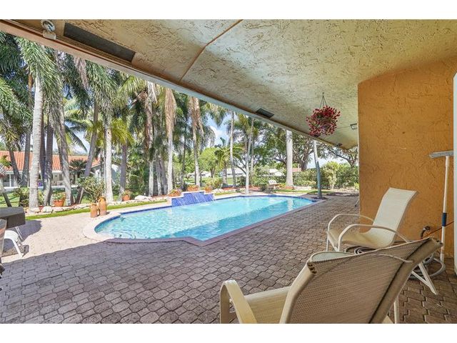Run to this stunning gem in the newer section of Jacaranda Lakes! Situated on a prime corner lot, this home offers a breathtaking view and exceptional upgrades throughout. Enjoy a newly renovated kitchen featuring quartz countertops, newer appliances, and a dual-zone wine cooler designed for both red and white wines. The home showcases elegant travertine marble floors, hurricane-protected skylights in the kitchen and bathrooms, a newer fireplace, custom wood paneling in the dining room, and Plantation shutters in the kitchen. Additional features include a Garagetec system with custom cabinetry, a charming tiki hut, and a spectacular backyard with an in-ground pool with a cascading waterfall and color-changing fiber-optic lighting. Artificial turf adds to the low-maintenance outdoor appeal.