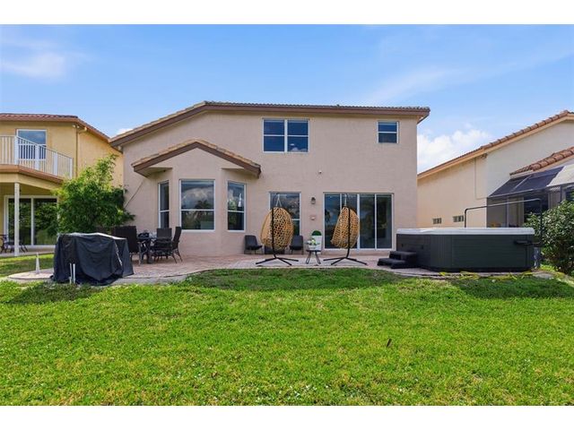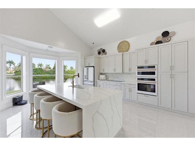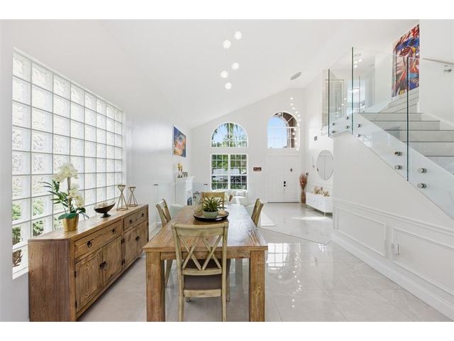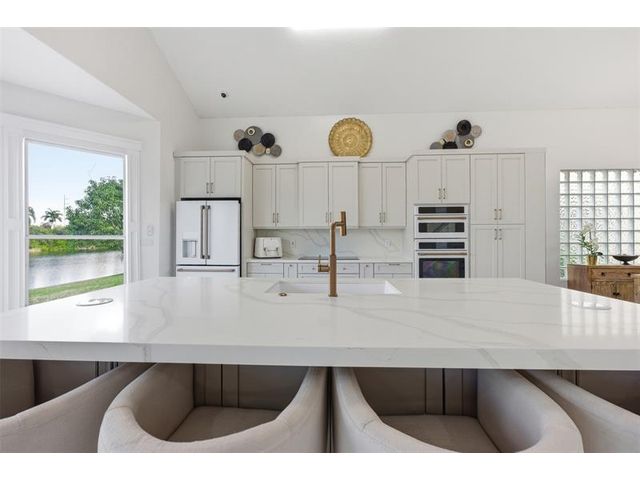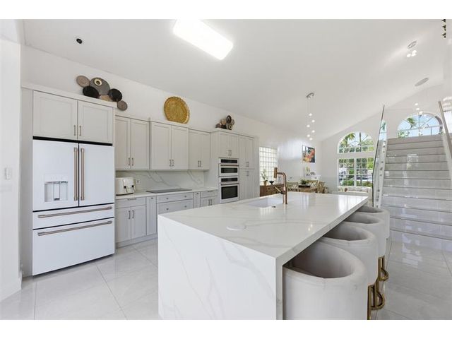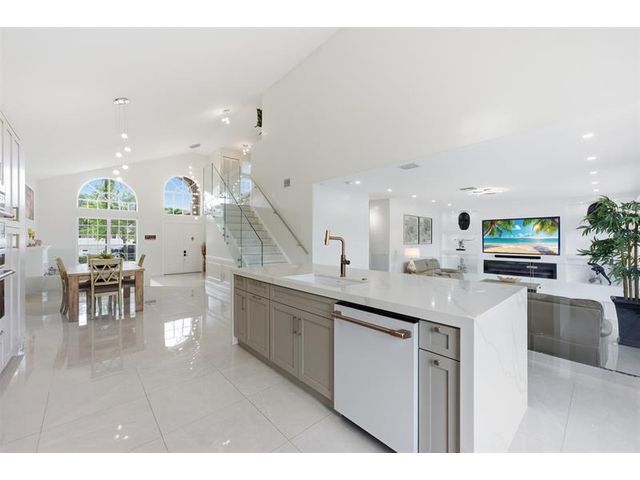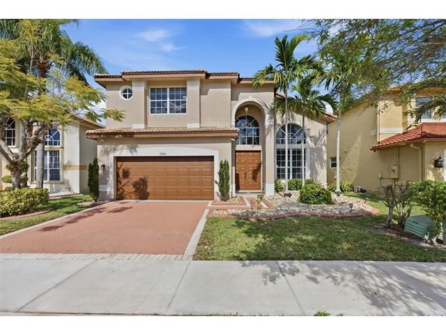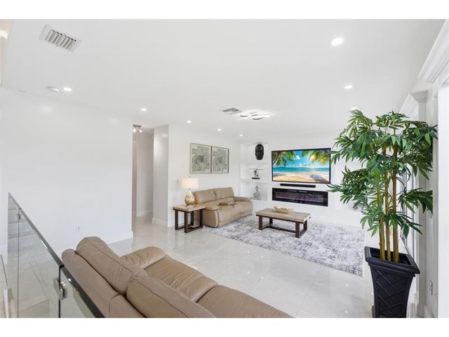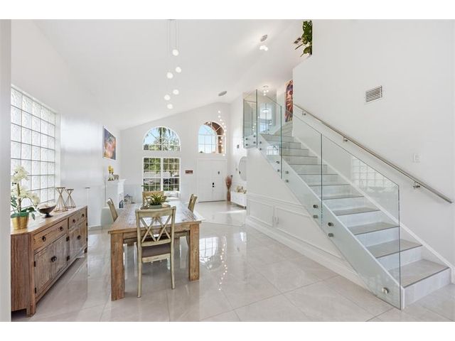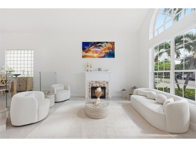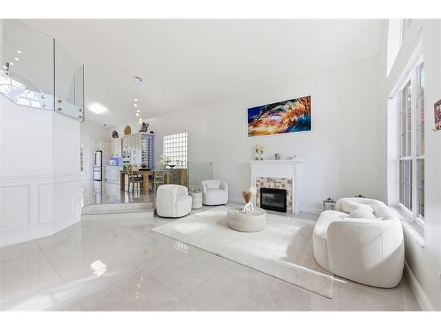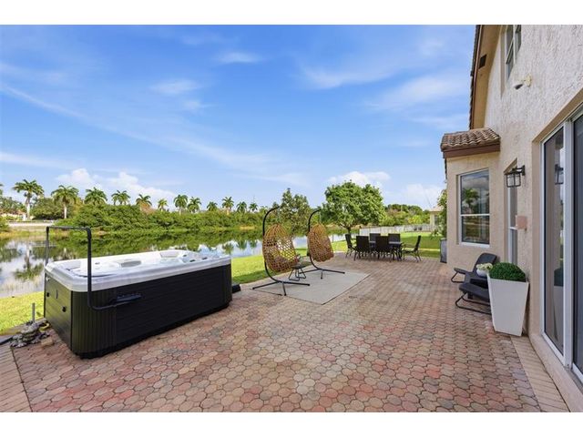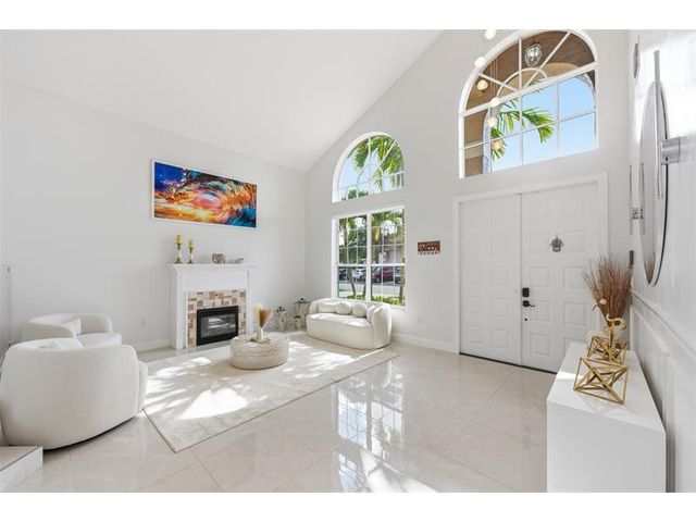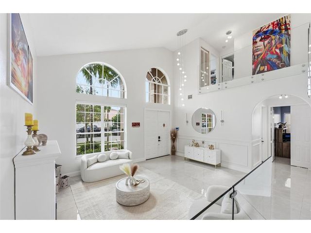 Elegant lakefront residence in a premier gated Miramar community offering a bright, airy open design with soaring ceilings and exceptional upgrades throughout. This 4-bedroom, 3-bath home includes a bedroom and full bath on the main level, ideal for guests or multigenerational living. Features include a brand-new designer kitchen with Café appliances, under-cabinet lighting and illuminated wine storage, a striking glass staircase, upgraded bathrooms, and custom living room feature wall with fireplace. Marble flooring, detailed molding, and refined wainscoting elevate the design. The expansive primary suite offers 2 walk-in closets & a spa-inspired bath with his-and-hers sides joined by a walk-through shower. Room for a pool. Community offers play areas and extra parking across the street.