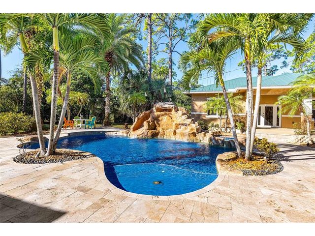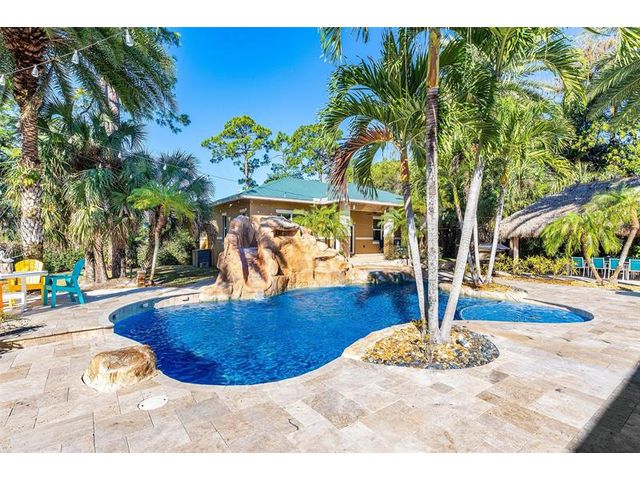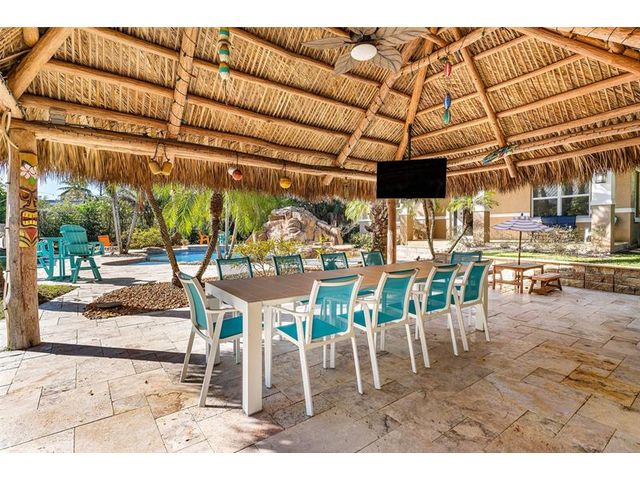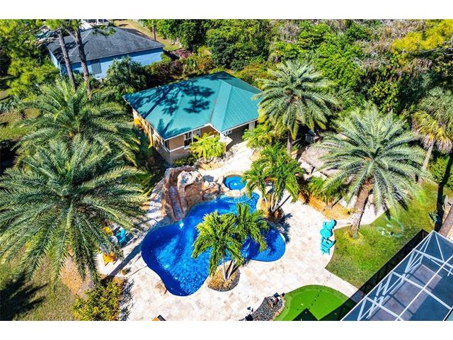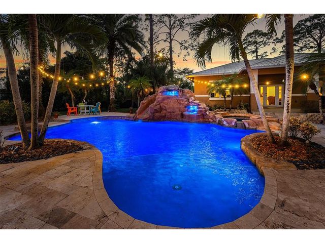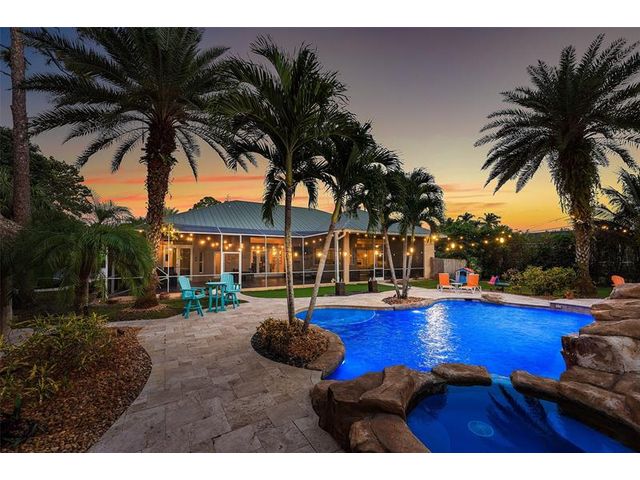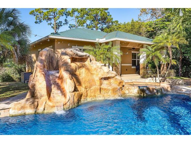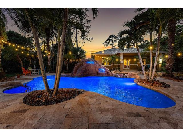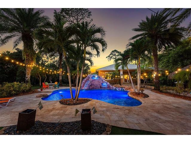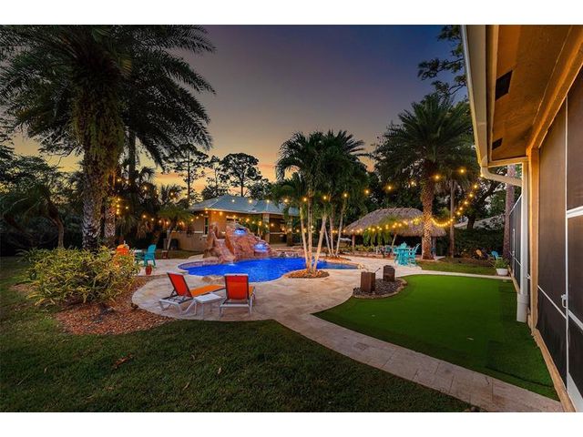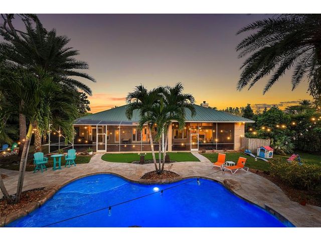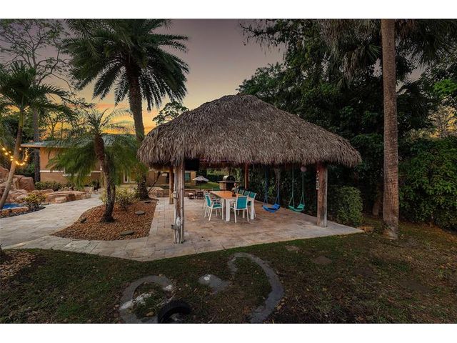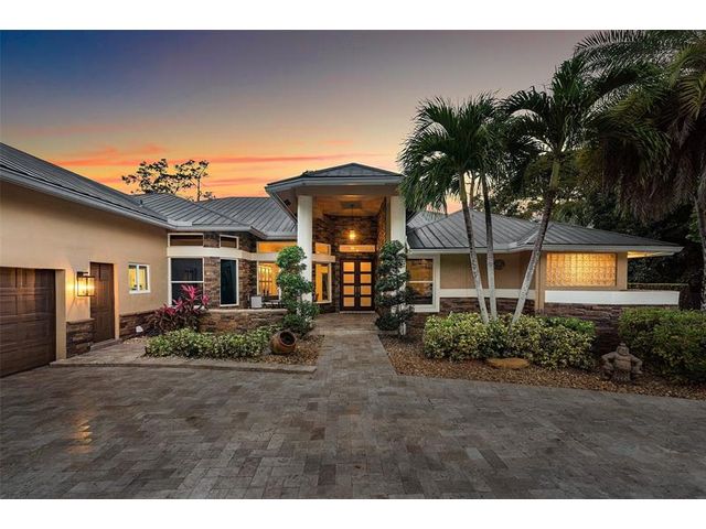 Beautiful family compound with a guest house set on 1.09 acres, perfect for multi-generation households. Large living areas framed by impact glass create seamless indoor/outdoor flow with tranquil views of the tropical pool & backyard. A striking exterior features a long driveway, manicured lawn, & stunning double-door entry. The open kitchen/family room offers wood cabinetry, top-shelf appliances, a fireplace & generous space. The impressive primary suite boasts a spa-like bath, custom closets, & serene pool views. Enjoy a private backyard retreat with a tiki hut, oversized pool with waterfall & slide, multiple outdoor living spaces & when the sun goes down the magic begins. Fabulous guest house with a front porch, great room, full kitchen & bath—ideal for guests or in-laws.