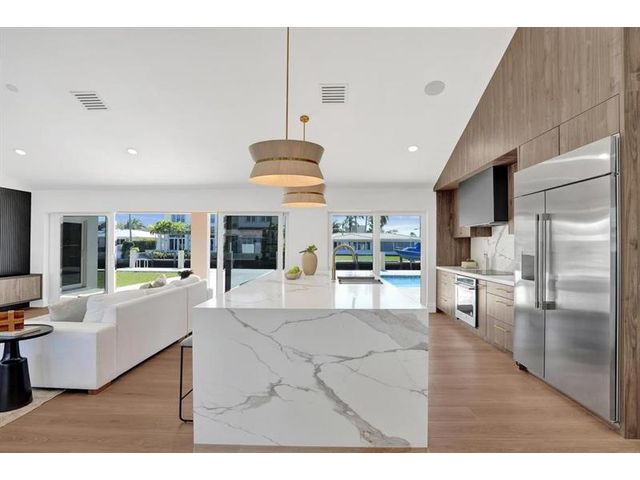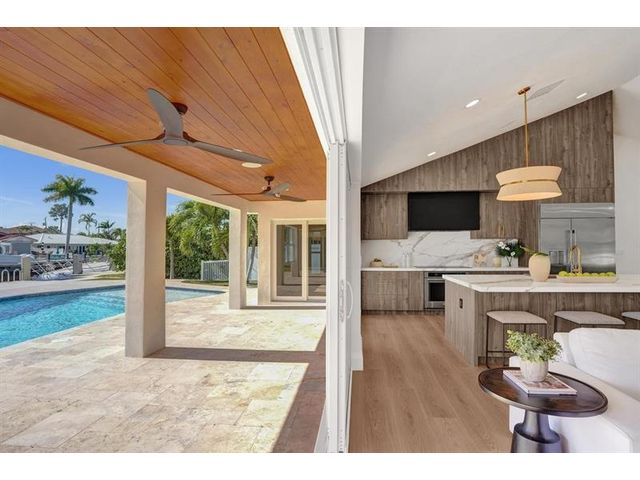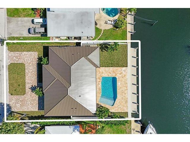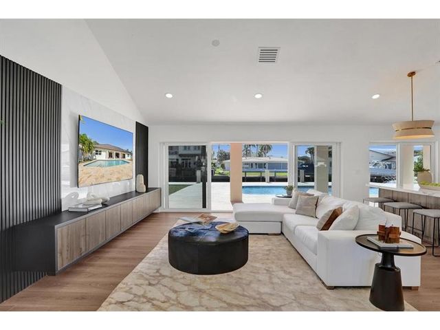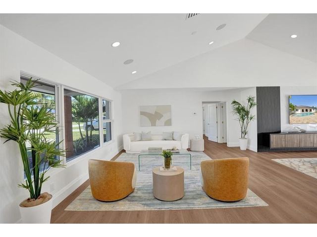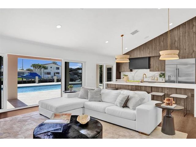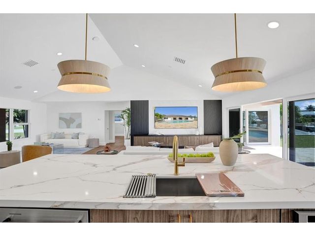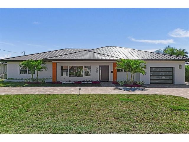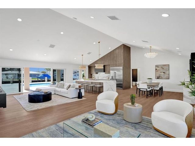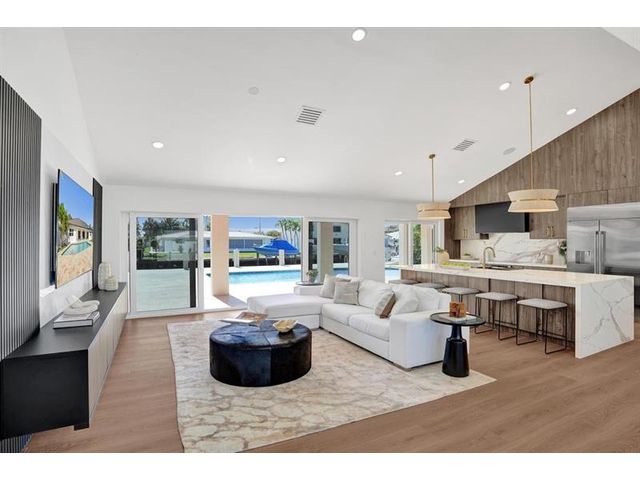Fully renovated waterfront home and true boater’s dream, ideally positioned on a desirable canal with quick Intracoastal access. Features a new 80’ seawall and 70’ composite dock with room for multiple watercraft. Completely upgraded with a new metal roof for favorable insurance, all new electrical, PVC plumbing, and impact windows and doors. Vaulted ceilings and designer lighting enhance the open coastal layout. Chef’s kitchen offers a quartzite island,custom soft-close cabinetry, wine bar, Thermador induction range, oversized Monogram refrigerator, and high-end appliances. Three bedrooms with new ensuite baths plus a half bath. Enjoy a heated pool, shaded outdoor living area,new landscaping and irrigation, epoxy garage floor, indoor washer/dryer and new paver circular driveway.