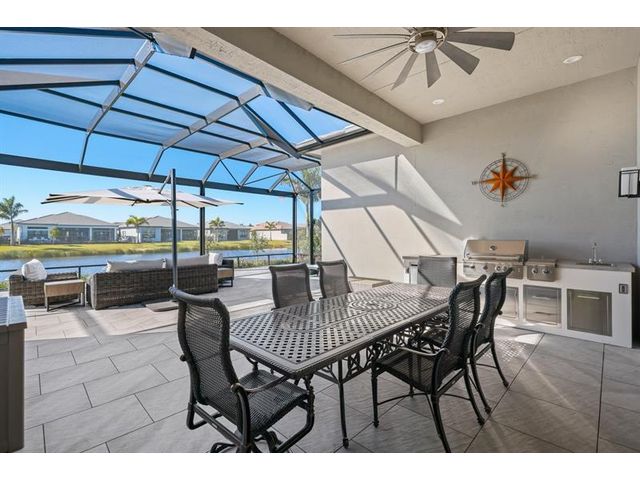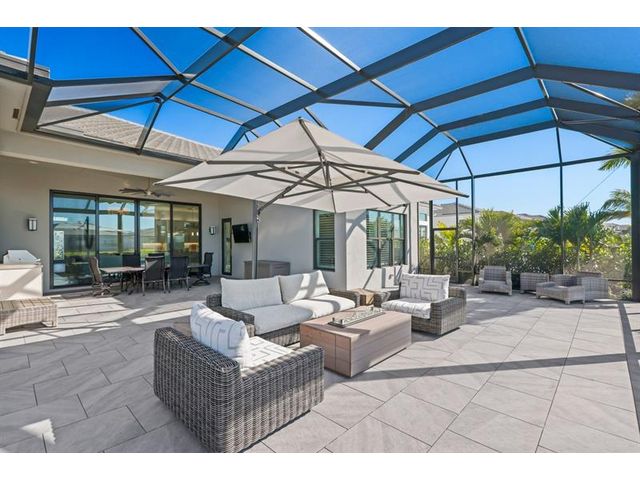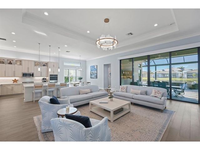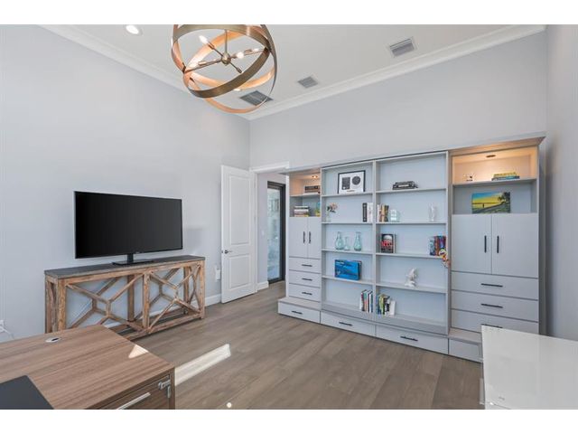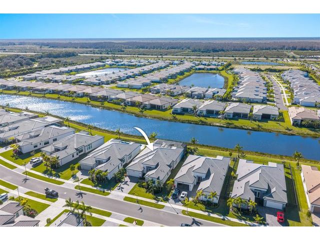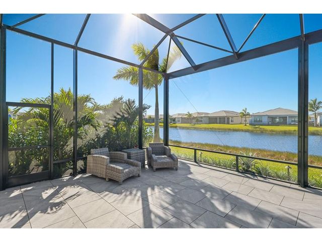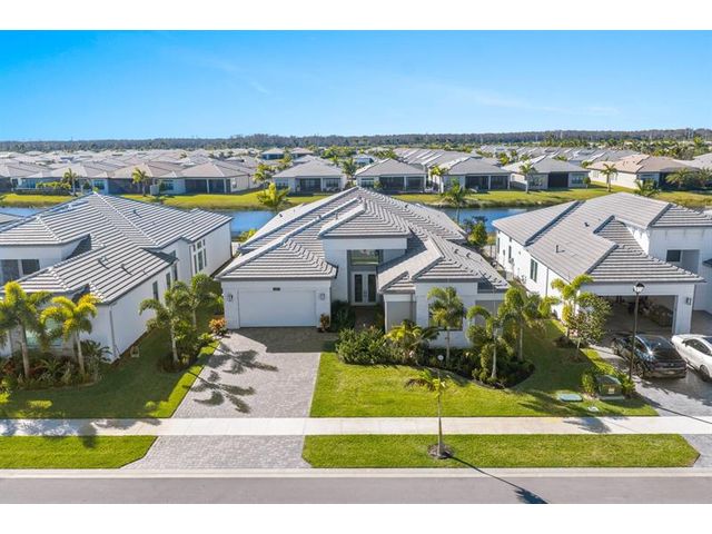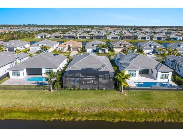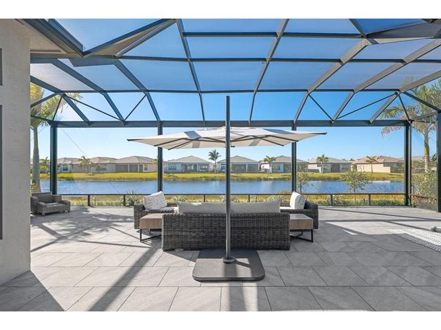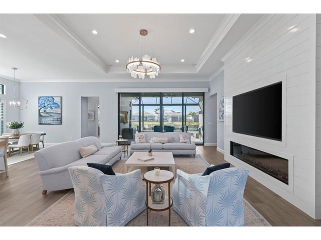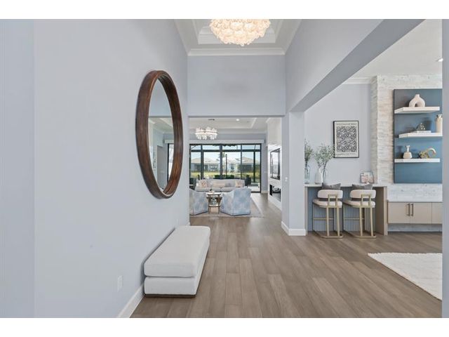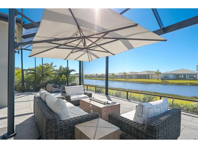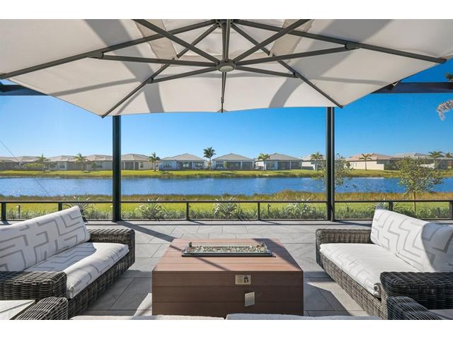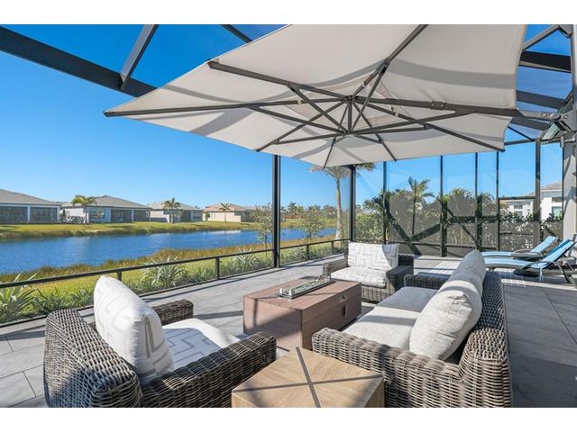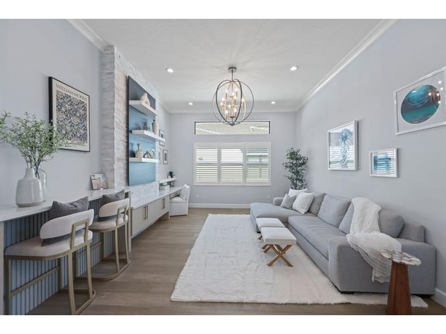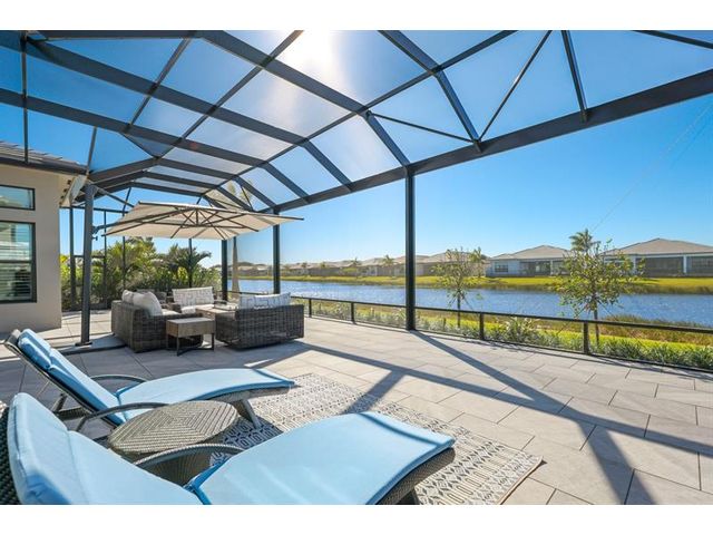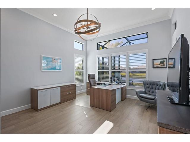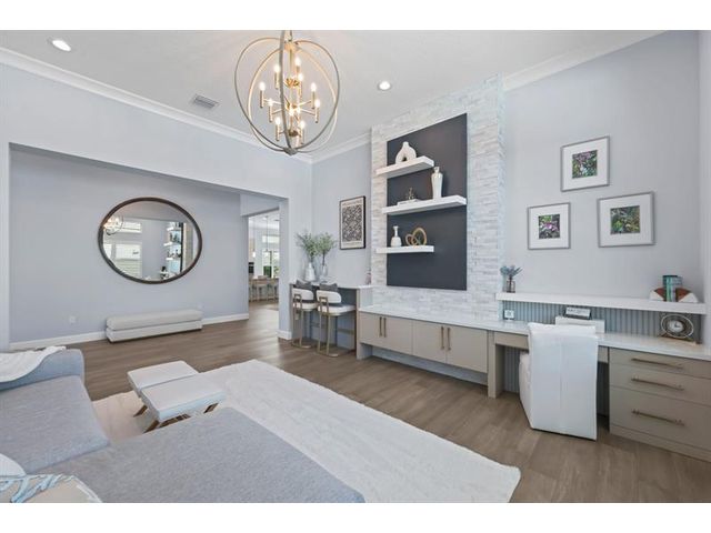 Modern Luxury at Valencia Grand - a 55+ resort-style community | Lakefront expanded Carmel model boasting 3 BR + Clubroom (4th BR) + Office/Den + Hobby room + 4 BA. Set on nearly a 1/4 acre lot, this home offers a chef's kitchen w/gas cooking, island, walk-in pantry, wide-plank wood flooring, + a custom fireplace. Primary suite w/two walk-in closets, a spa-like bath w/separate vanities, glass shower, + a soaking tub. Clubroom w/water view + a smart trundle bed for xtra guests. The chic Office/Den boasts a custom-built desk + cabinetry. Hobby room/play area/xtra guest quarters. Fully-screened lanai w/outdoor kitch, west-facing lake view + sunsets, + lush landscaping + lighting. Crown molding | Plantation shutters | Soaring ceilings | Laundry room | Mudroom | 2-car garage.