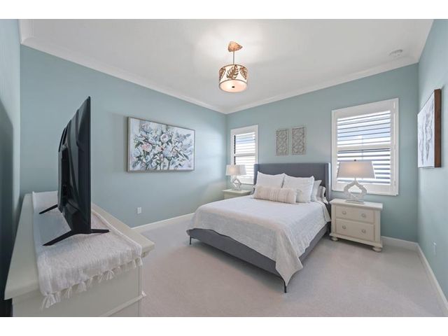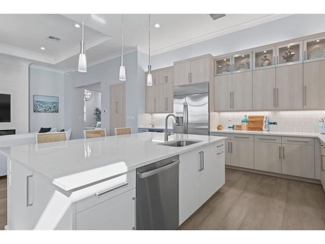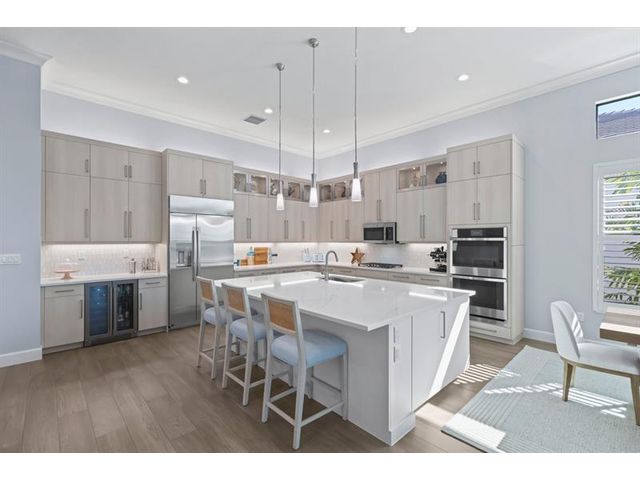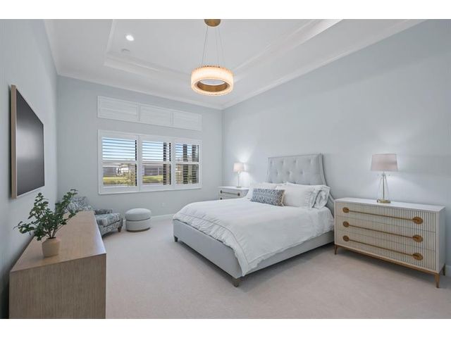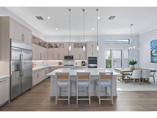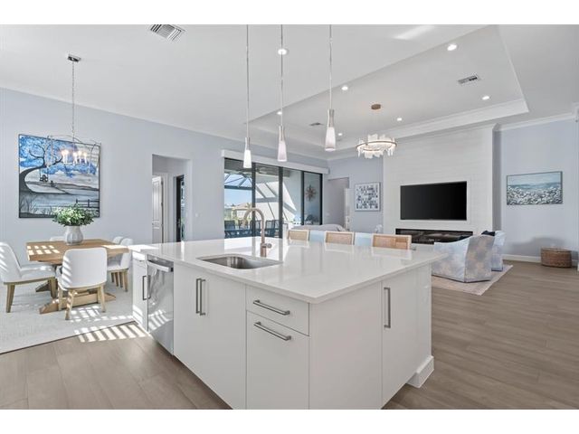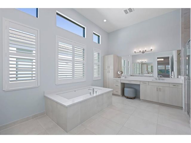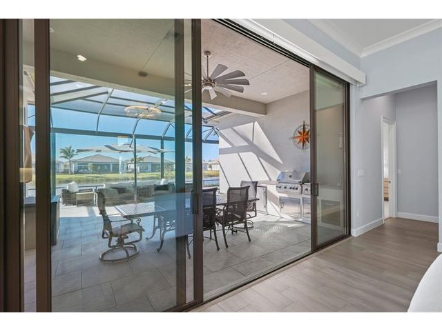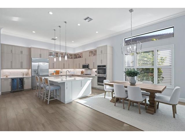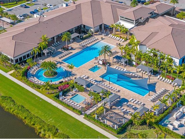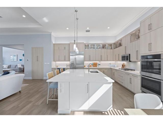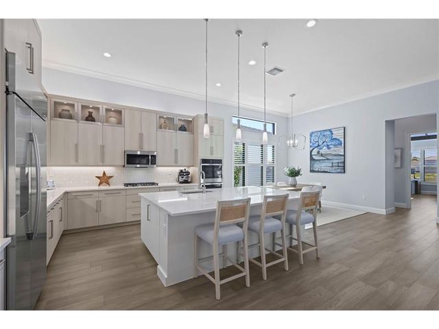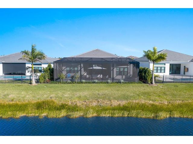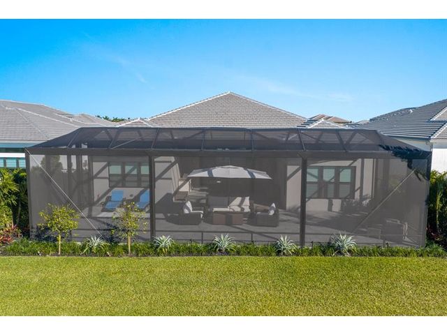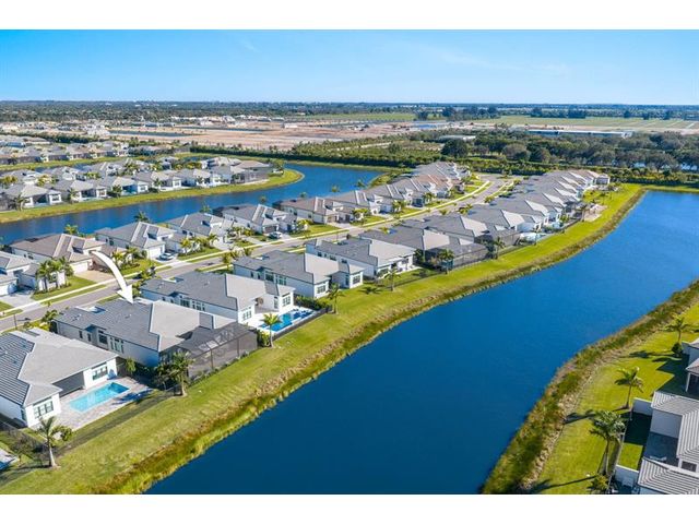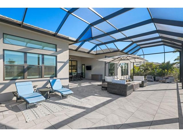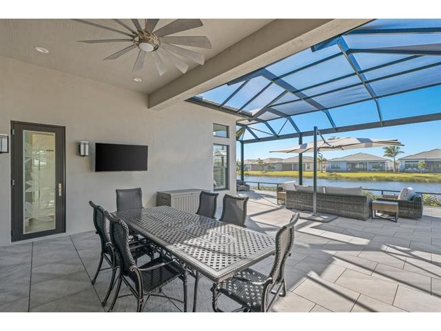 Modern Luxury at Valencia Grand - a 55+ resort-style community | Lakefront expanded Carmel model boasting 3 BR + Clubroom (4th BR) + Office/Den + Hobby room + 4 BA. Set on nearly a 1/4 acre lot, this home offers a chef's kitchen w/gas cooking, island, walk-in pantry, wide-plank wood flooring, + a custom fireplace. Primary suite w/two walk-in closets, a spa-like bath w/separate vanities, glass shower, + a soaking tub. Clubroom w/water view + a smart trundle bed for xtra guests. The chic Office/Den boasts a custom-built desk + cabinetry. Hobby room/play area/xtra guest quarters. Fully-screened lanai w/outdoor kitch, west-facing lake view + sunsets, + lush landscaping + lighting. Crown molding | Plantation shutters | Soaring ceilings | Laundry room | Mudroom | 2-car garage.