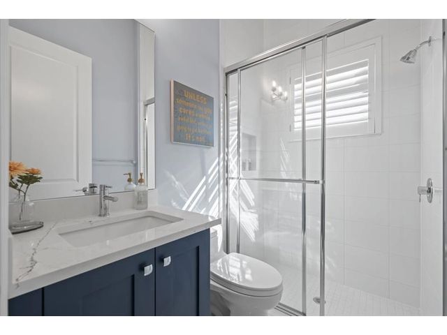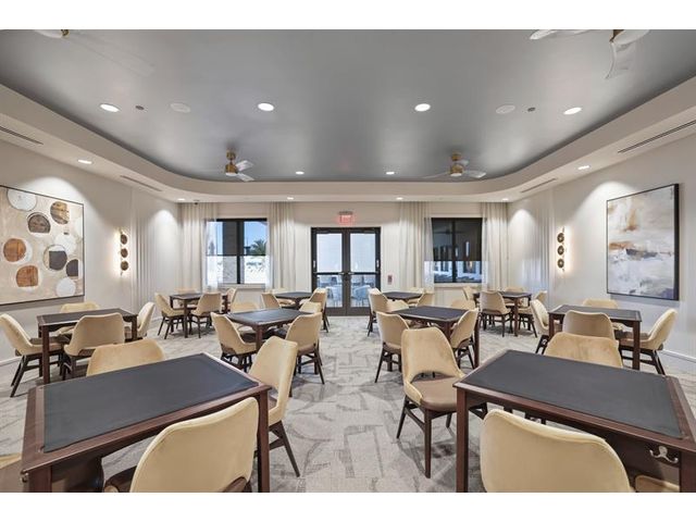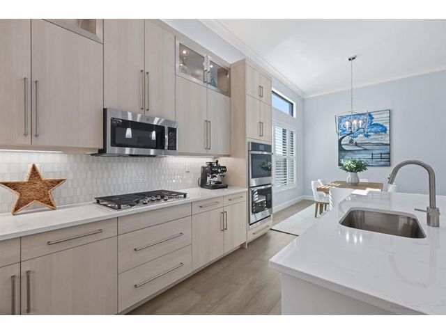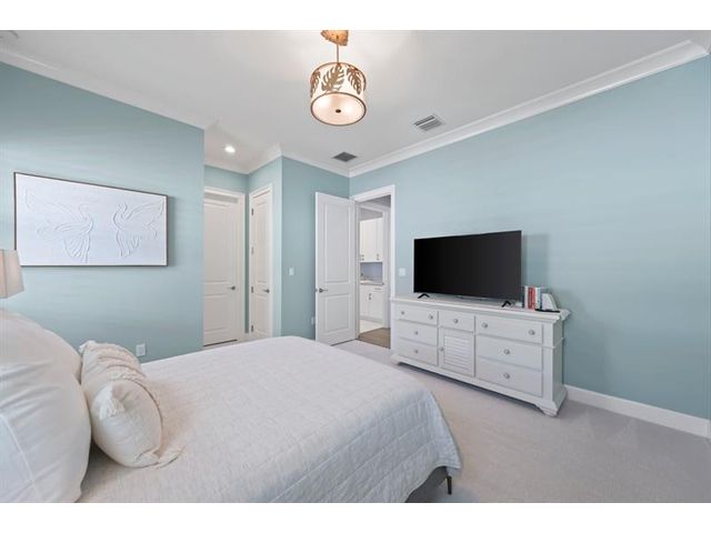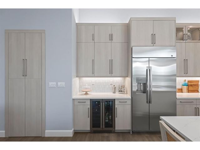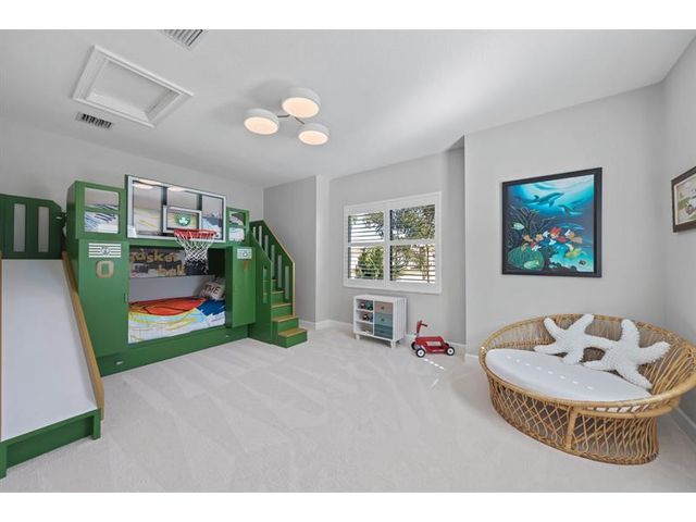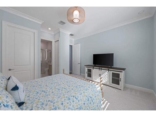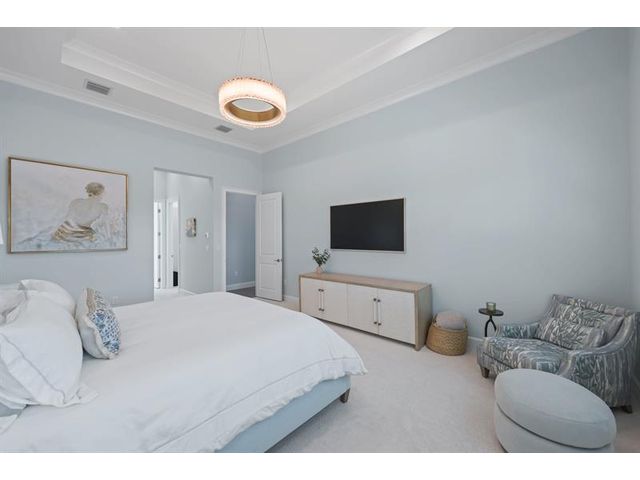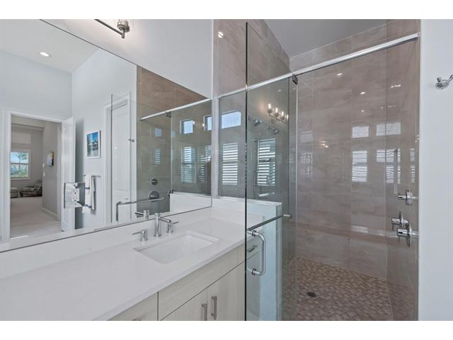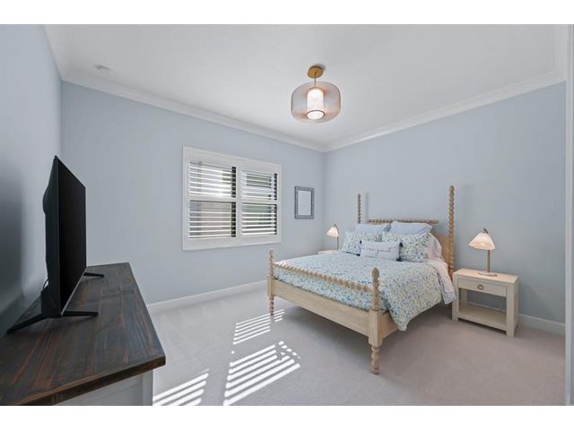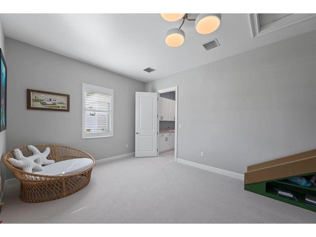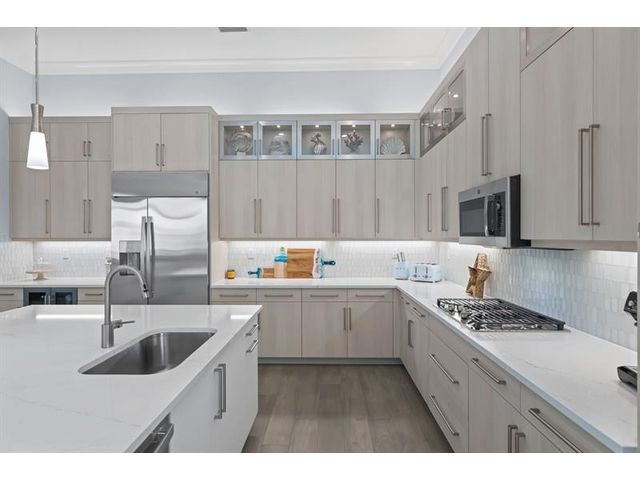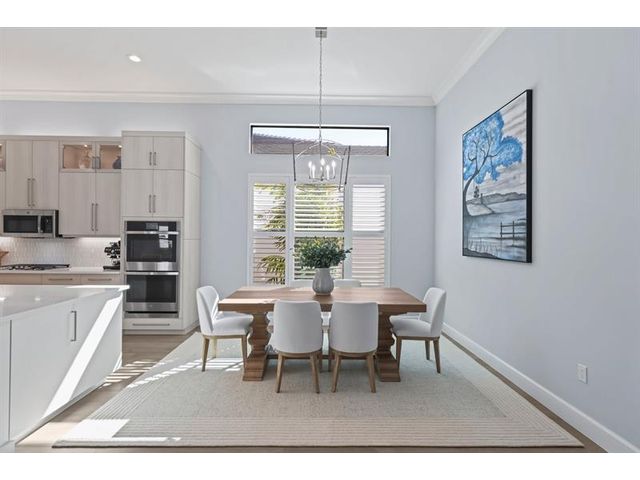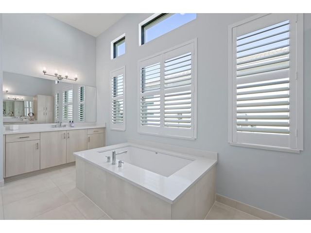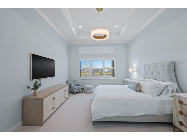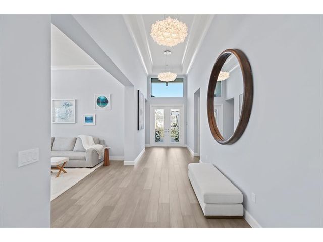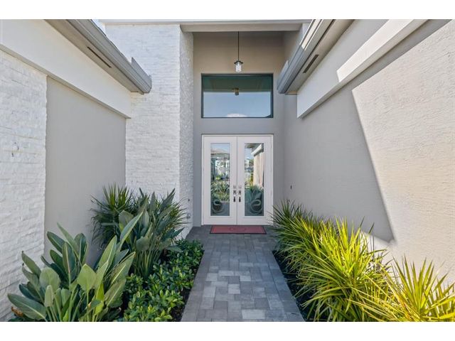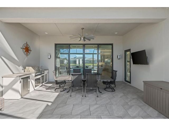 Modern Luxury at Valencia Grand - a 55+ resort-style community | Lakefront expanded Carmel model boasting 3 BR + Clubroom (4th BR) + Office/Den + Hobby room + 4 BA. Set on nearly a 1/4 acre lot, this home offers a chef's kitchen w/gas cooking, island, walk-in pantry, wide-plank wood flooring, + a custom fireplace. Primary suite w/two walk-in closets, a spa-like bath w/separate vanities, glass shower, + a soaking tub. Clubroom w/water view + a smart trundle bed for xtra guests. The chic Office/Den boasts a custom-built desk + cabinetry. Hobby room/play area/xtra guest quarters. Fully-screened lanai w/outdoor kitch, west-facing lake view + sunsets, + lush landscaping + lighting. Crown molding | Plantation shutters | Soaring ceilings | Laundry room | Mudroom | 2-car garage.