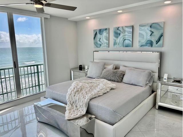Luxury oceanfront residence featuring 3 bedrooms and 2 full baths. Fully renovated from floor to ceiling in 2022, showcasing designer baths and kitchen direct from Germany with Bosch appliances. One bedroom is currently used as a refined sitting room with custom bar, offering flexible living space. Resort-style amenities include oceanfront heated pool, BBQ area, hot tub, sauna, fitness center, billiards, social room with kitchen, covered parking, semi-private elevator, and manned gate. Enjoy access(included with maintenance fees) to the Country Club located across the street: 9-hole golf course, tennis and pickleball courts, pro golf shop, public restaurant, and kayak racks.