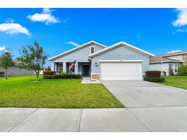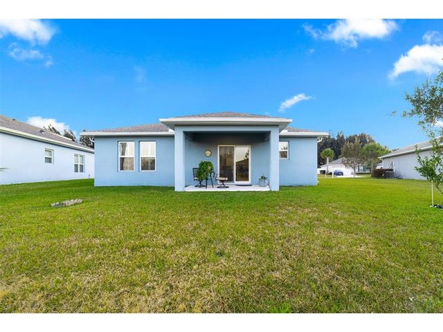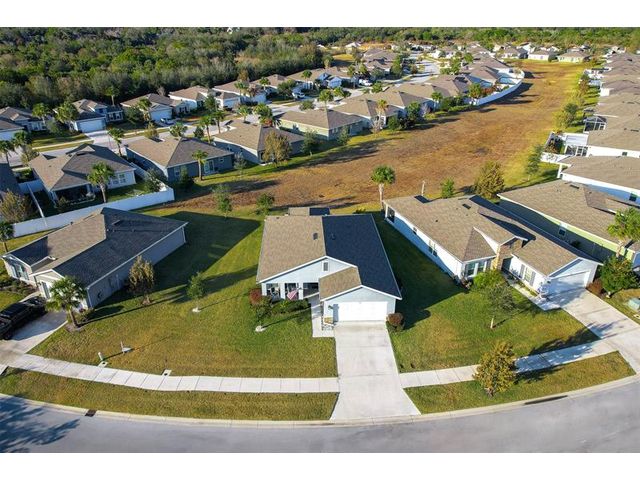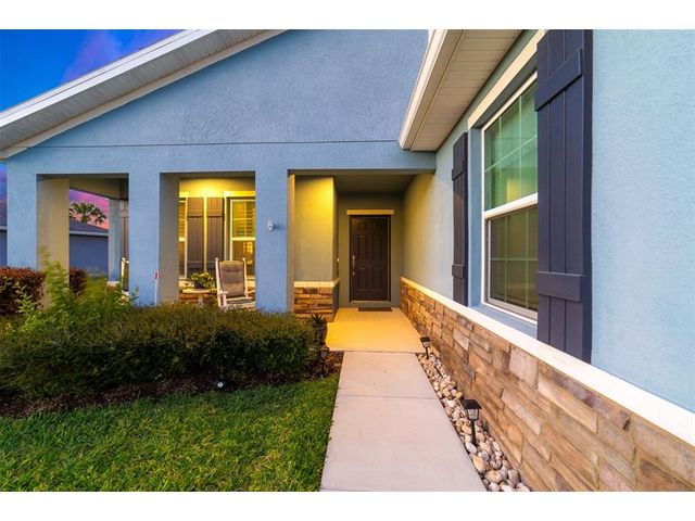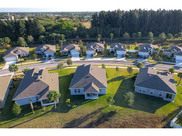 Single-family home in Carriage Pointe Estates with 1,548 sq ft, 3 bedrooms and 2 baths. The Key Largo model features an open front porch, lanai, and an open layout with luxury vinyl flooring, quartz countertops, and an island kitchen. Impact windows, plantation shutters, and a full-house Generac generator with 500-gallon propane tank add peace of mind. Concrete stucco construction with reinforced rebar, added attic and garage insulation, and termite monitoring system enhance durability and efficiency. Community features include playground, covered picnic areas, dog parks, bike racks, trails, and nearby natural preserve for kayaking and fishing. Move-in ready with thoughtful upgrades.
