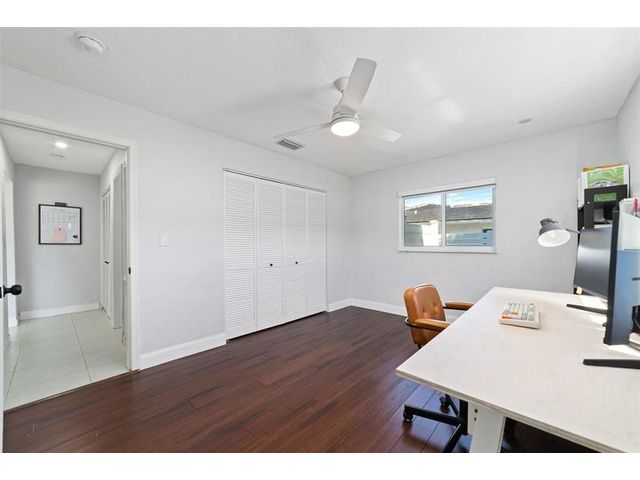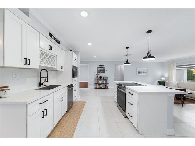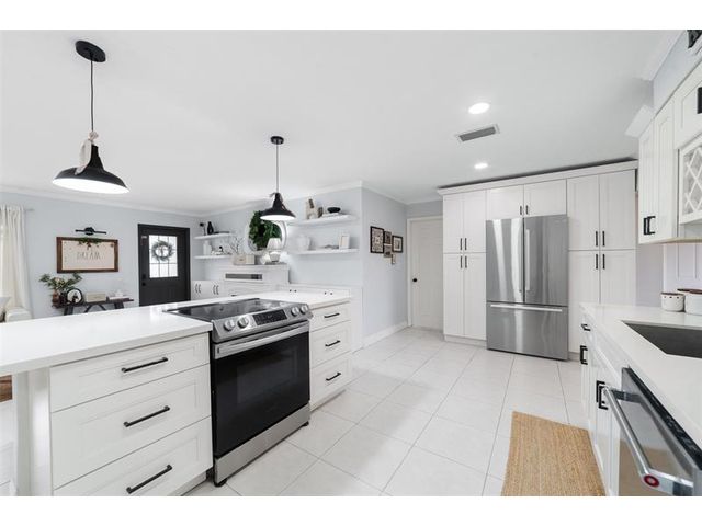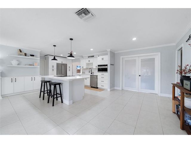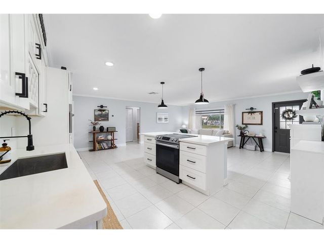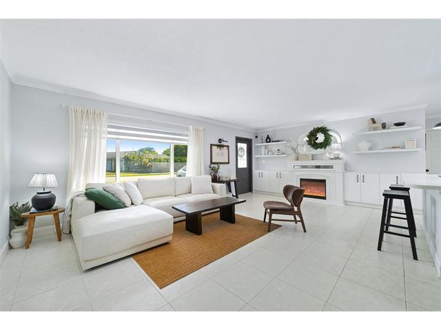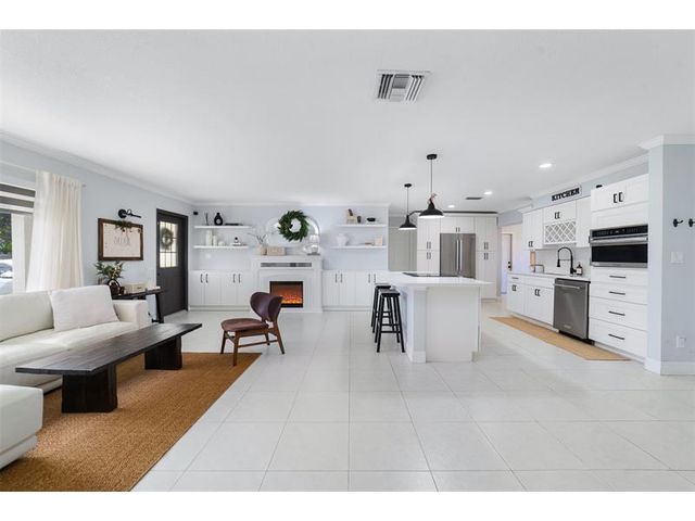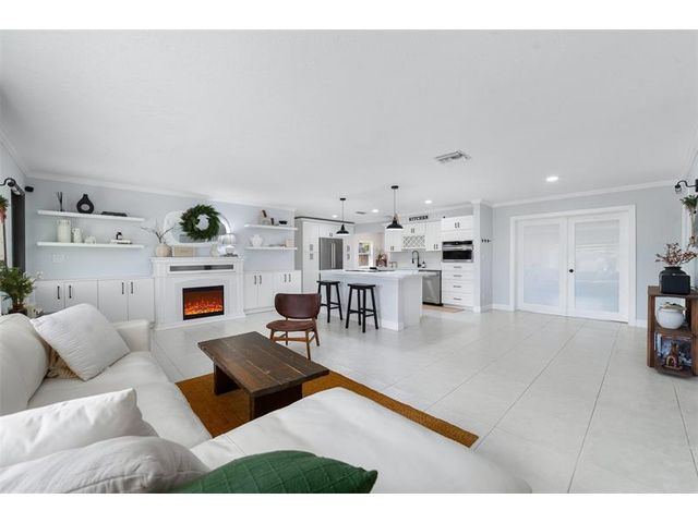The beautifully renovated kitchen features soft-close wood cabinetry, quartz countertops and backsplash, and stainless steel appliances, including a newer Bosch refrigerator, dishwasher, and microwave. Custom built-in cabinetry with a fireplace insert. Highlights include a spacious kitchen cooking island, a generous dining area, perfect for hosting large gatherings, 3 bedrooms, fresh paint inside and out, new dryer, and new Zebra blinds. Both bathrooms have been tastefully updated. Major improvements include a NEW roof (2025), NEW A/C ductwork (2024), and impact-rated windows, doors, and garage door. NEWER A/C unit & water heater. Additional features include epoxy flooring in the garage, a 10x10 storage shed in the backyard, low maintenance fee. This truly move-in-ready home is a must see.
