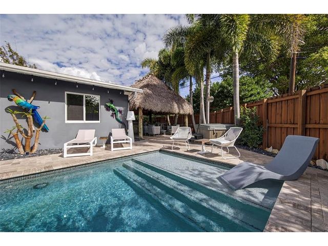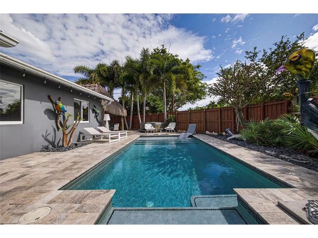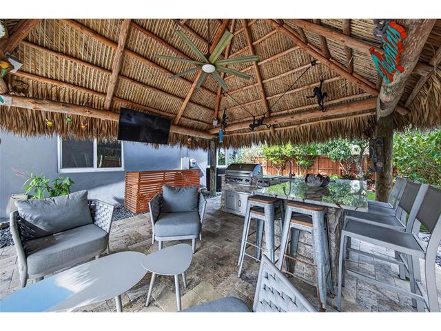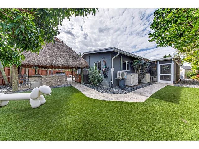 Fully updated 2BR/2BA pool home featuring impact windows and doors throughout and a bright open floor plan perfect for entertaining. Spacious living and dining areas flow into a beautifully upgraded modern kitchen with stylish finishes. Private backyard oasis features a sparkling heated saltwater pool, relaxing hot tub, custom tiki hut with fully equipped outdoor kitchen, and screened-in patio for year-round enjoyment. Tastefully landscaped for privacy. Fully paid solar panels provide exceptional energy savings. Brand-new washer & dryer and new 2025 A/C. Meticulously maintained and move-in ready—Florida living at its best.