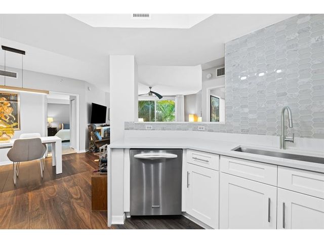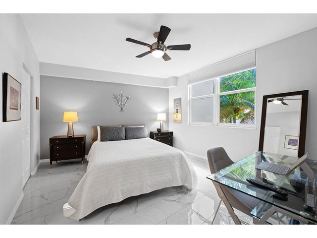 Welcome to Lauderdale One, a boutique 6-story residence with just 174 units, offering privacy and resort-style living. This elegant 3rd-floor 2BR/2BA features volume ceilings, a desirable split-bedroom layout, & tranquil garden & fountain views. Enjoy impact windows & doors, engineered wood floors, and a private open balcony. The kitchen is appointed with granite countertops and stainless steel appliances. Full-size washer/dryer in unit. Offered furnished with one assigned garage space. Primary suite includes en-suite bath & generous closets. New roof 2025. Gated entry, fitness & business centers, heated pool, jacuzzi, EV charging, guest suite, and more. Maintenance includes Wi-Fi, insurance, roof, & security. Just 3 miles to the beach and minutes to I-95, FLL, shopping, and top schools.