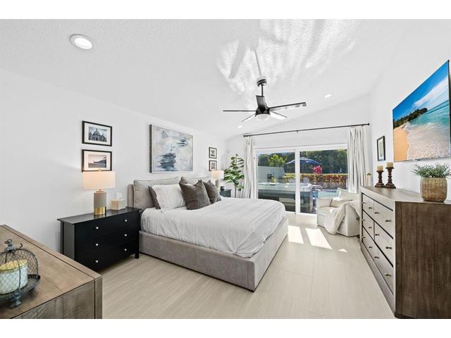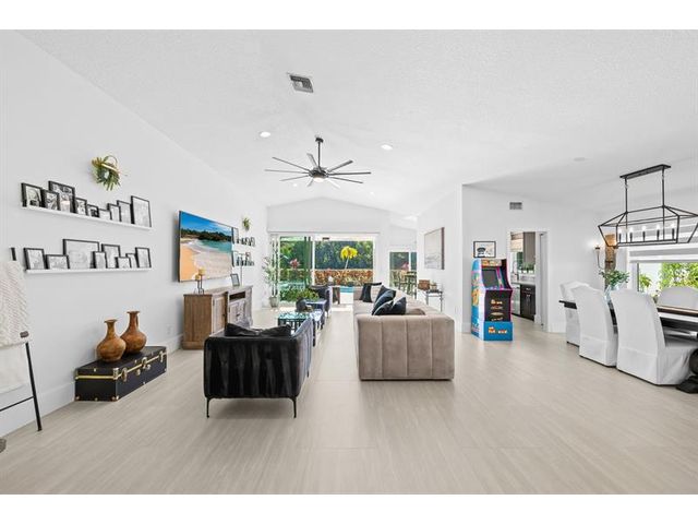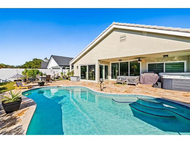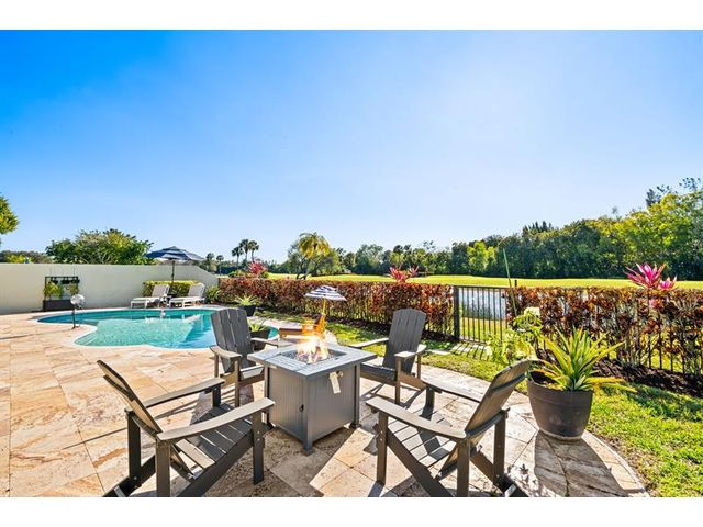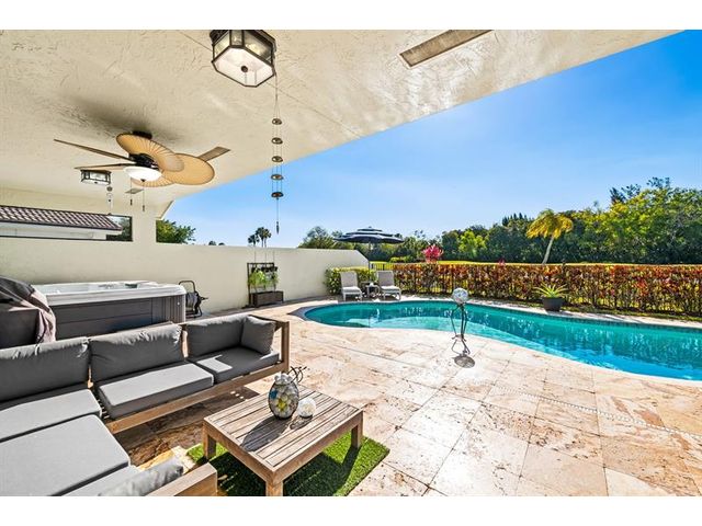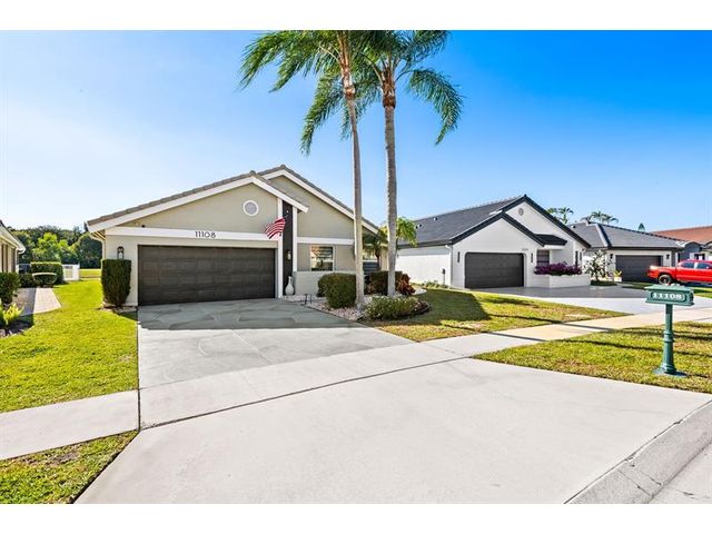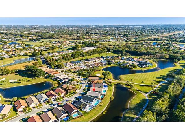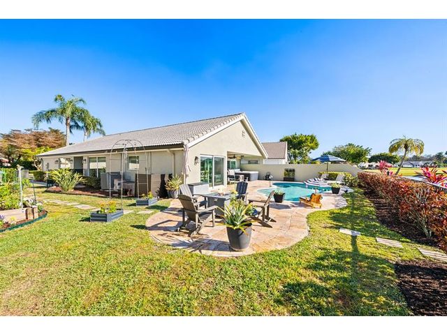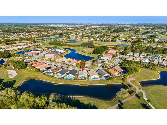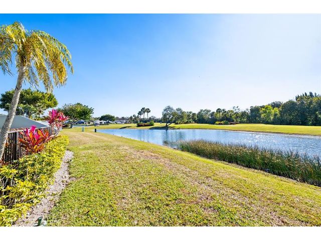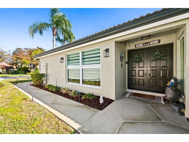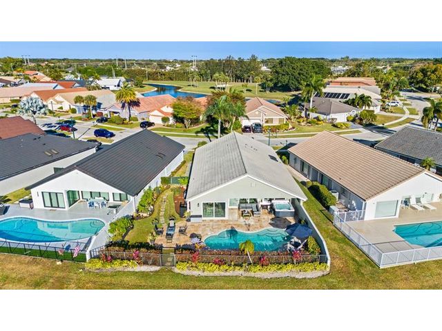 Welcome to this move-in ready, exceptionally maintained and updated 3 bedroom, 2 bath, pool, lake and golf course view home in prestigious Boca Woods Country Club. Features split floor plan, completely remodeled bathrooms, new 24x48 porcelain tile throughout, soaring ceilings, custom closets, all impact windows and oversized pocket sliders providing tons of natural light and great views. Expansive primary bedroom has vaulted ceilings, dual closets, and sliders to travertine paved lanai, perfect for your morning coffee. Large, covered patio with pool and hot tub makes entertaining and every day Florida living a breeze. Primary bath has soaking tub, double vanities and separate shower. Third bedroom with double French doors make a versatile media room or home office.