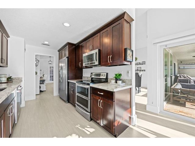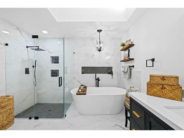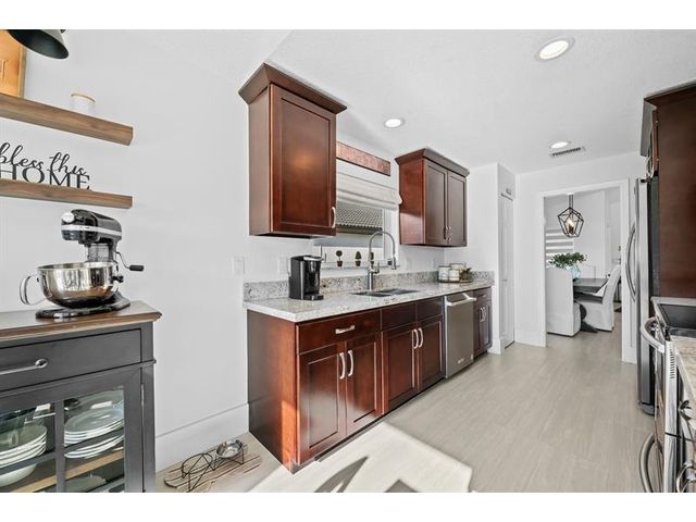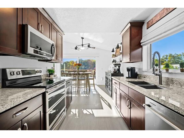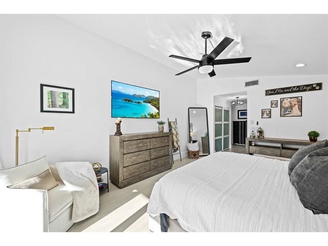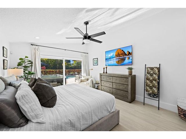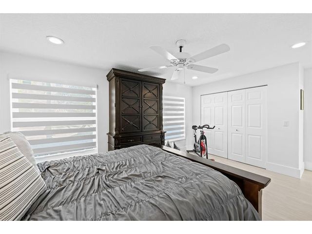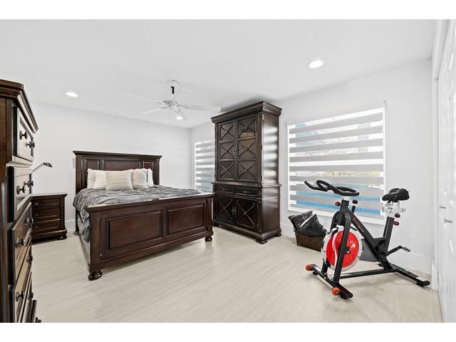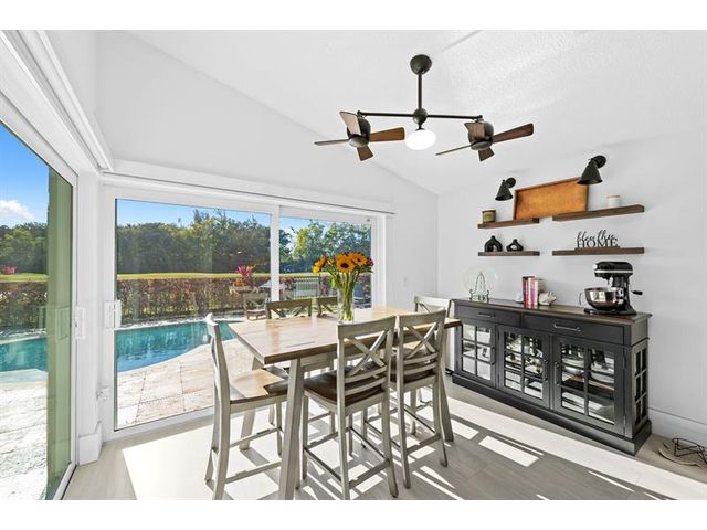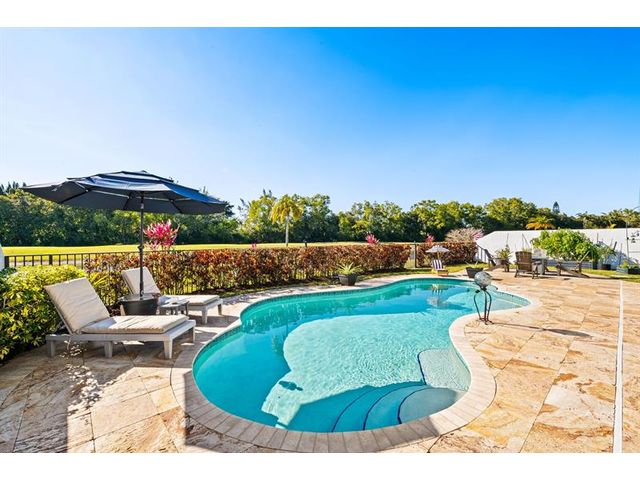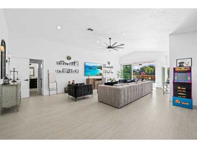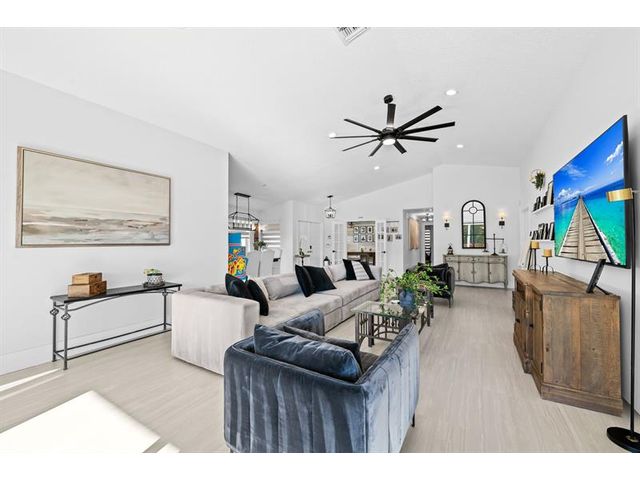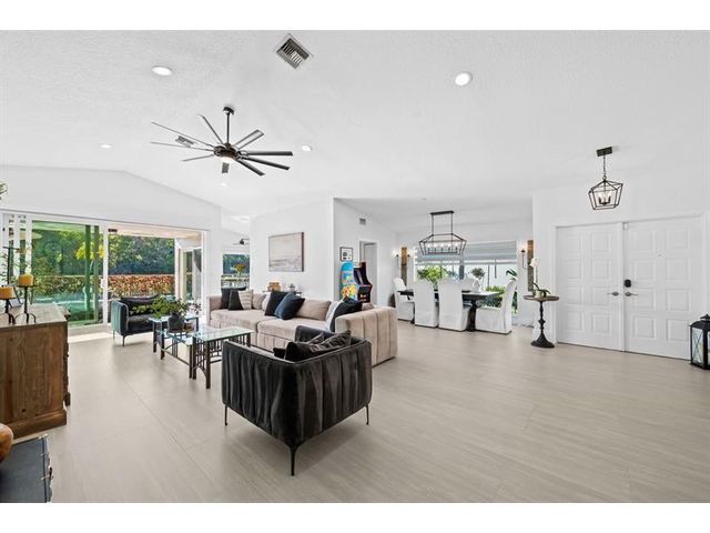Welcome to this move-in ready, exceptionally maintained and updated 3 bedroom, 2 bath, pool, lake and golf course view home in prestigious Boca Woods Country Club. Features split floor plan, completely remodeled bathrooms, new 24x48 porcelain tile throughout, soaring ceilings, custom closets, all impact windows and oversized pocket sliders providing tons of natural light and great views. Expansive primary bedroom has vaulted ceilings, dual closets, and sliders to travertine paved lanai, perfect for your morning coffee. Large, covered patio with pool and hot tub makes entertaining and every day Florida living a breeze. Primary bath has soaking tub, double vanities and separate shower. Third bedroom with double French doors make a versatile media room or home office.