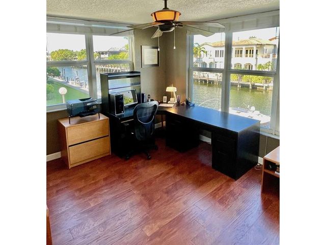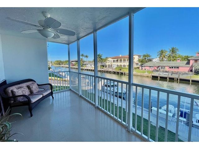 Highly desirable 3/2 end/corner unit with extra windows/light. Large MBR has bath, multiple closets, vanity nook. Large screened balcony and other rooms have water views. Hurricane impact glass. Newer HVAC and water heater. Monitored alarm. Ceiling fans. Bosch washer and dryer. Concrete restoration completed, special assessment paid. HOA includes cable and high-speed Internet. Very end of street, so traffic is residents (versus pass-thru). Surrounded all 4 sides by deep canals (including Intracoastal). Protected boat dockage on 3 sides with water/power, no fixed bridges and only minutes to 2 inlets. Clubhouse with showers, kitchen, restrooms, meeting space next to large heated pool with expansive deck on the Intracoastal. Only 15 minutes by bicycle through safe neighborhood to the beach!
