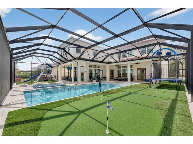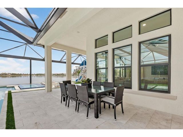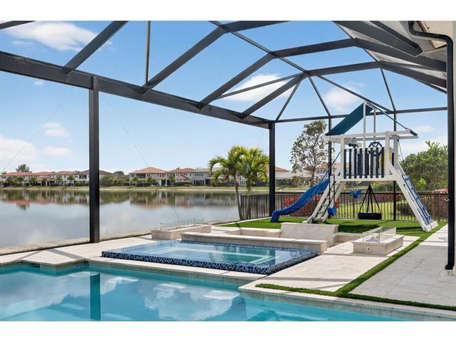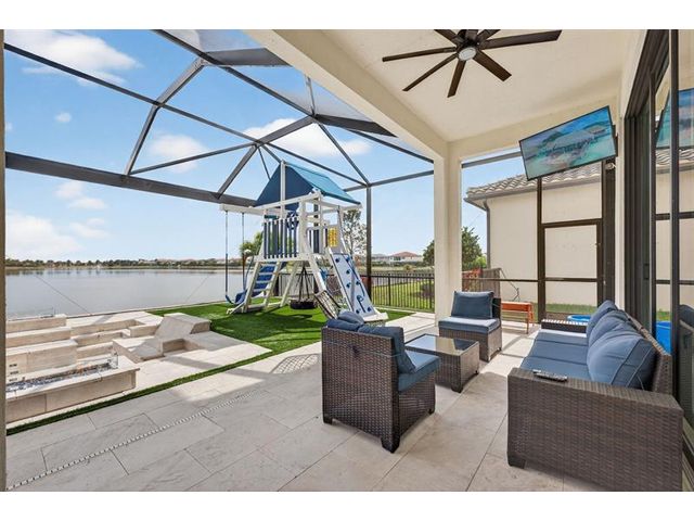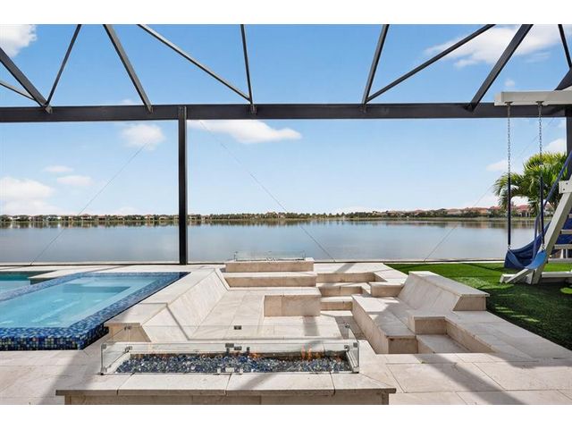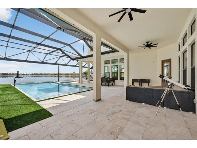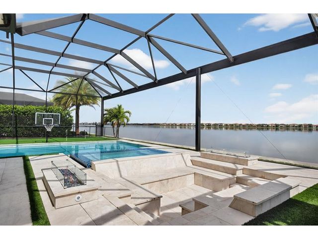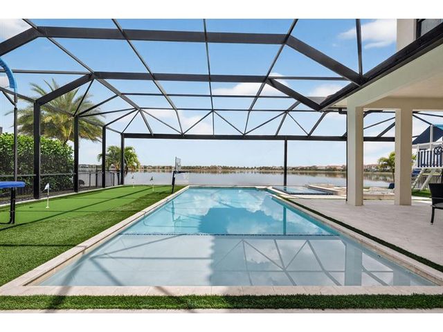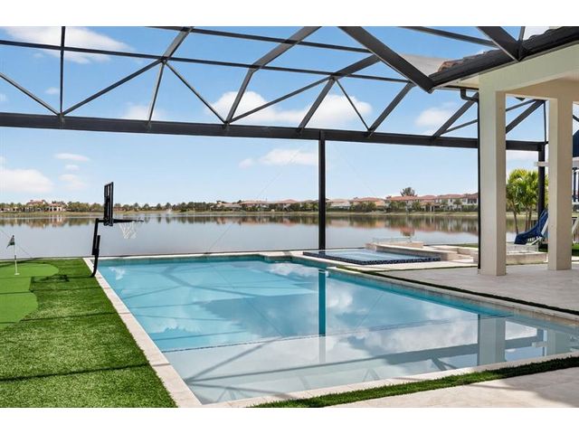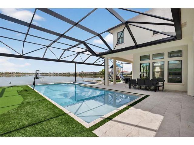 Introducing a massive, exquisite 2-story lakefront home that epitomizes luxury living. This stunning residence features 5 bedrooms, 6 bathrooms, a loft, and a study, along with a grand great room and bright breakfast area. The chef-inspired kitchen boasts a dramatic island and expansive pantry, offering breathtaking water views. The resort-style, screened backyard includes a covered patio, heated saltwater pool and spa, fireplaces, step-down seating areas, a golf putting green, and an artificial turf playground. The second-floor master suite features two walk-in closets and a luxurious master bath with a free-standing tub and glass-enclosed shower. A light-filled loft serves as an ideal game or media space. With panoramic views of 178 acres of lakefront, this home is truly exceptional.