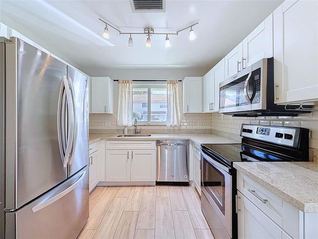 Beautiful lake views welcome you home to this updated one-story, 2-bedroom, 2-bath corner townhouse/villa. Recent modern renovations include smooth ceilings (popcorn removed), porcelain wood-grain flooring throughout, and full impact glass windows and sliders installed October 2021. Both bathrooms have been renovated, and the remodeled kitchen features white cabinetry, granite/quartz countertops, and stainless steel appliances. Ideally located in Boca Raton with easy highway access and top-rated Boca schools. Enjoy a community heated pool and jacuzzi in this well-maintained neighborhood.