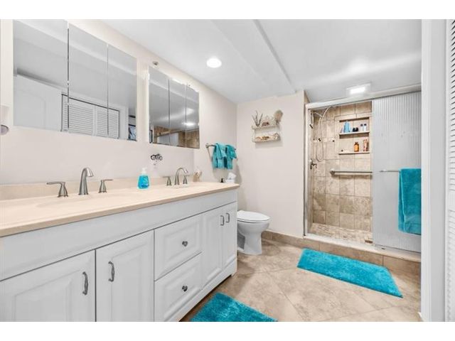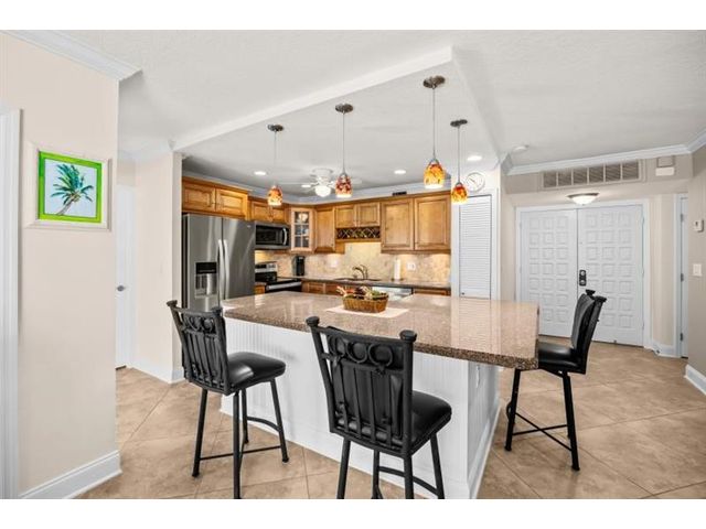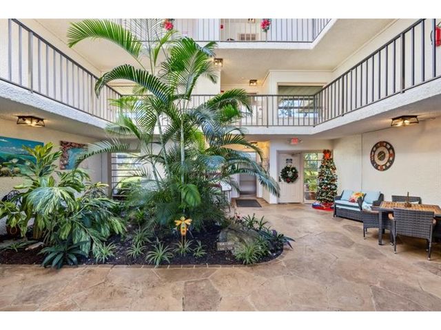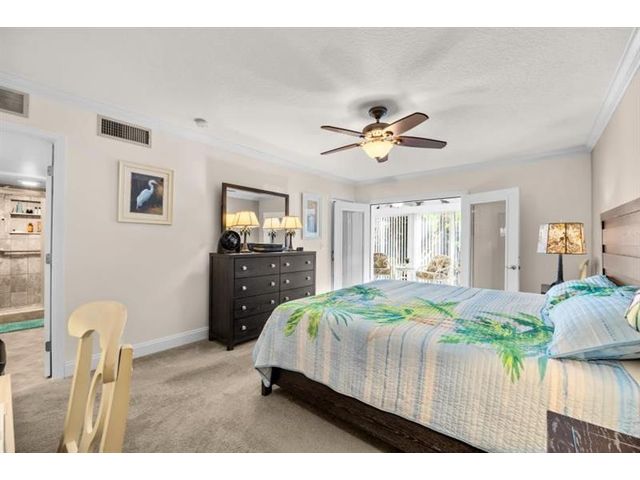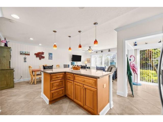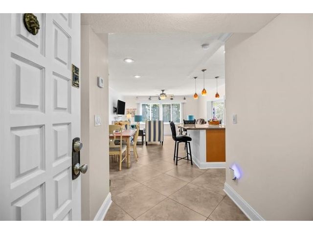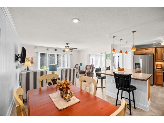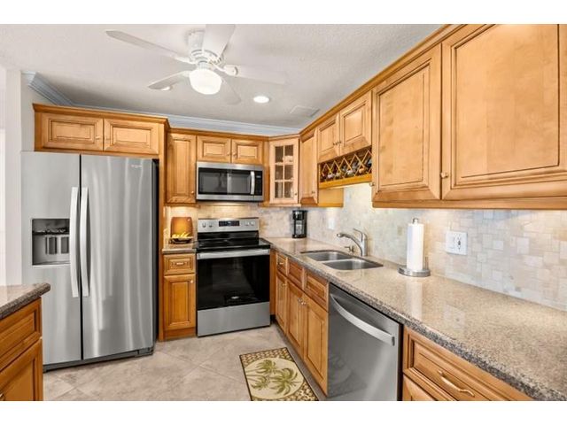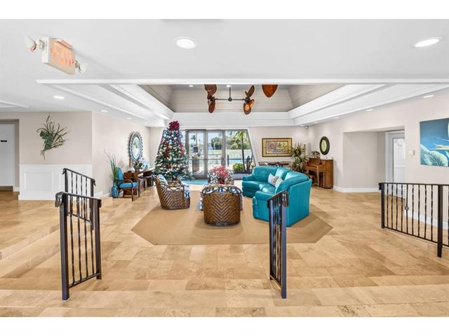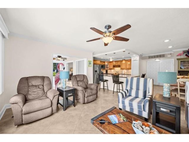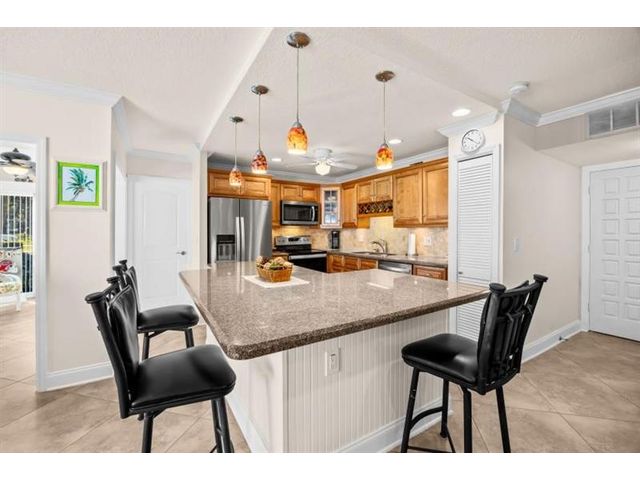 Easy access first floor, end unit condo, private entrance, convenient parking, 55+. Pet free no smoking building. Restricted parking for PICKUP TRUCK (Ford F150 or equivalent) Totally remodeled, split layout, custom gardens. 24 travertine look floor tile living areas/baths, carpet bedrooms. Granite counters, over sized island w/electric. SS 2 year old appliances w/10 year transferable warranty. Full size w/d in unit. A/C 2023. Knock down ceilings (no popcorn), crown, baseboard, wood trim all around. Impact windows/sliding doors, screens for all. Over size primary bathroom/shower. Building supplied water/hot water (no tank needed). Work shop, locked storage. Amenities: community dock for kayaking, fishing, etc. 3 pools Free internet/WI-FI. Clubhouse, library, card room, pickle ball, tennis